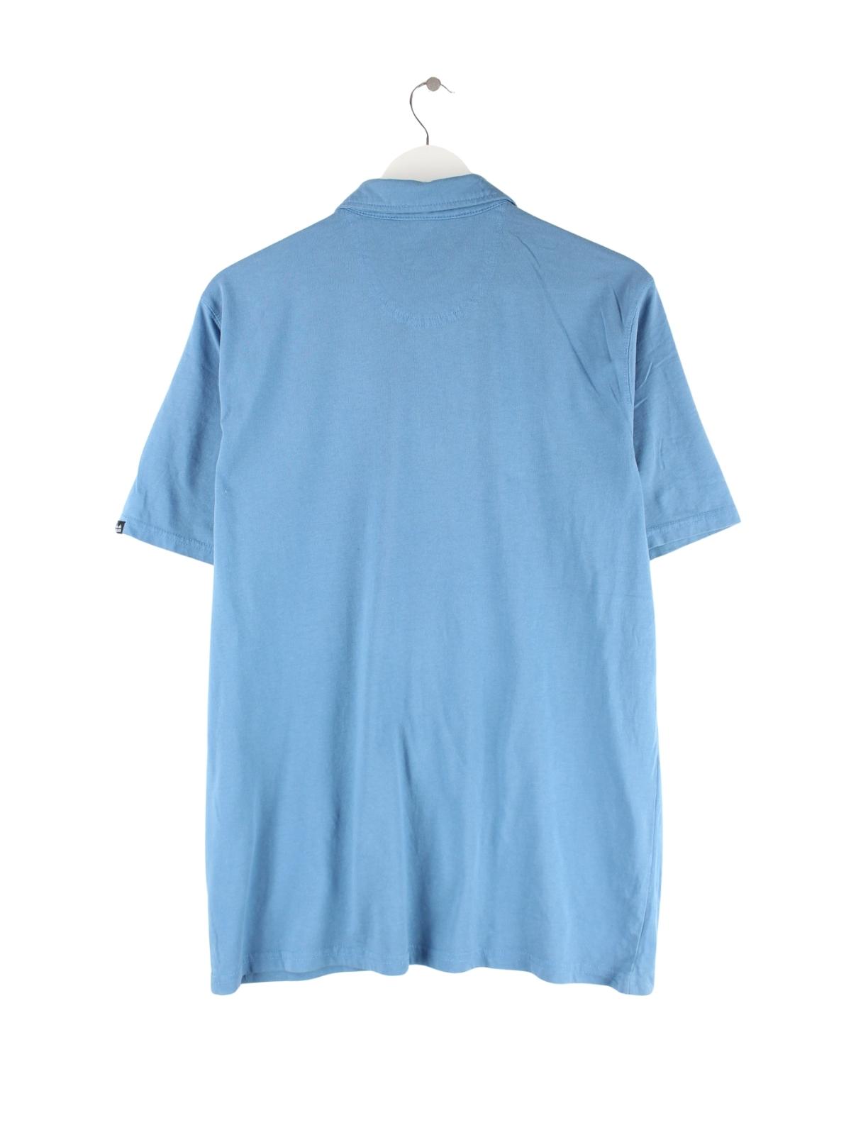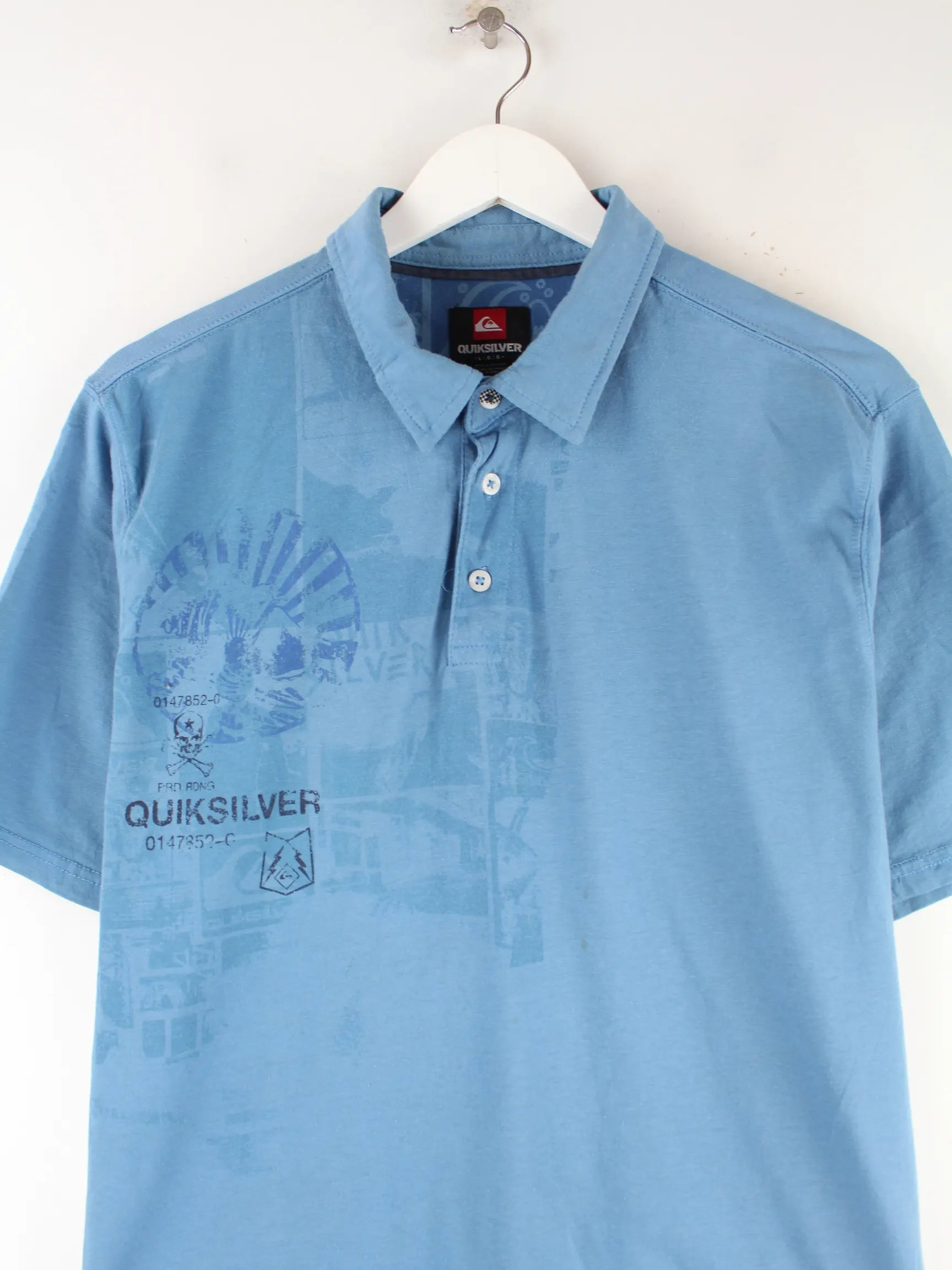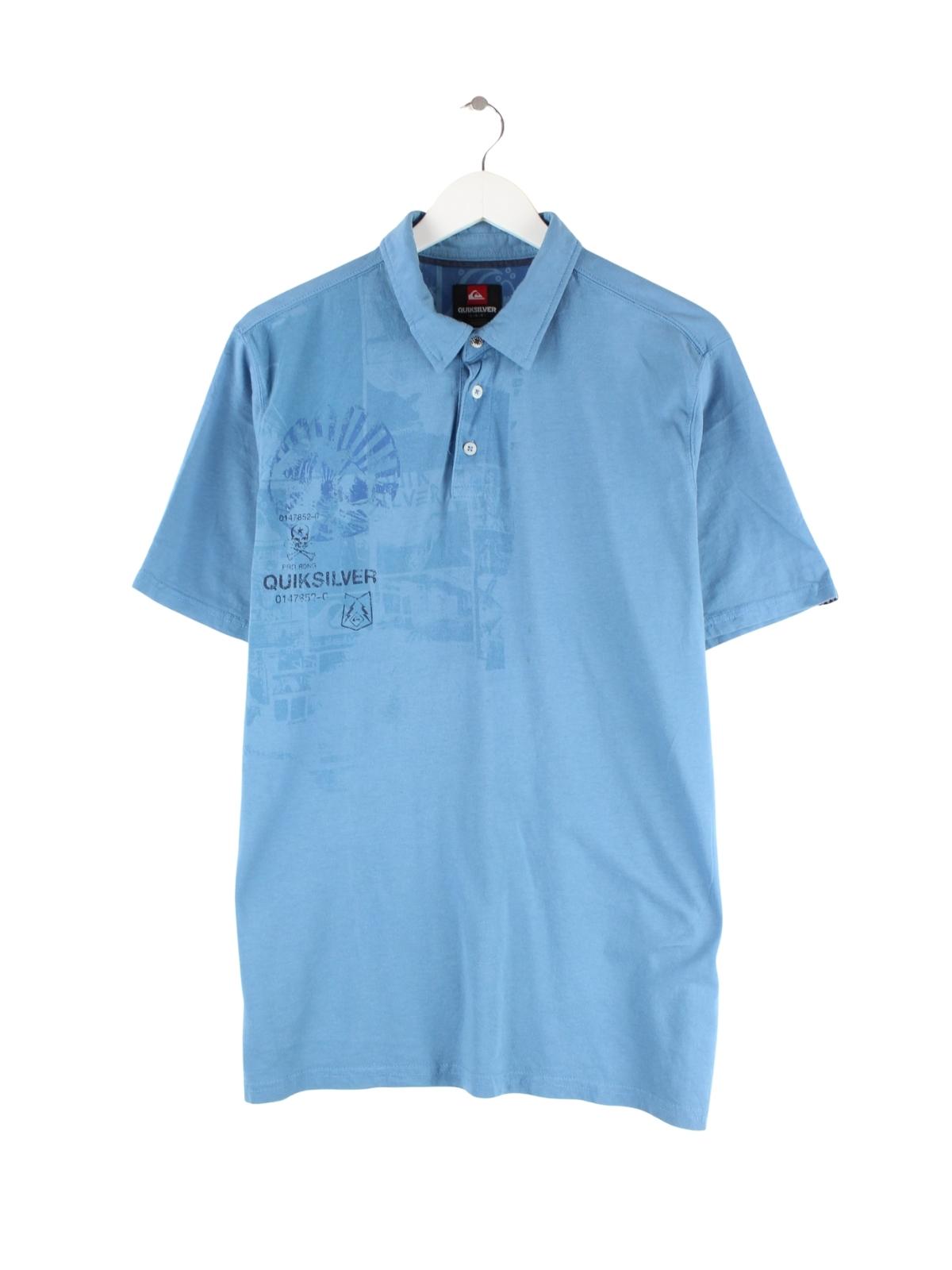 Blaues Poloshirt aus dem Hause Quiksilver in Größe L. Es ist aus Baumwolle und in gutem Zustand im Angebot. Mit seltenem 00s Print.