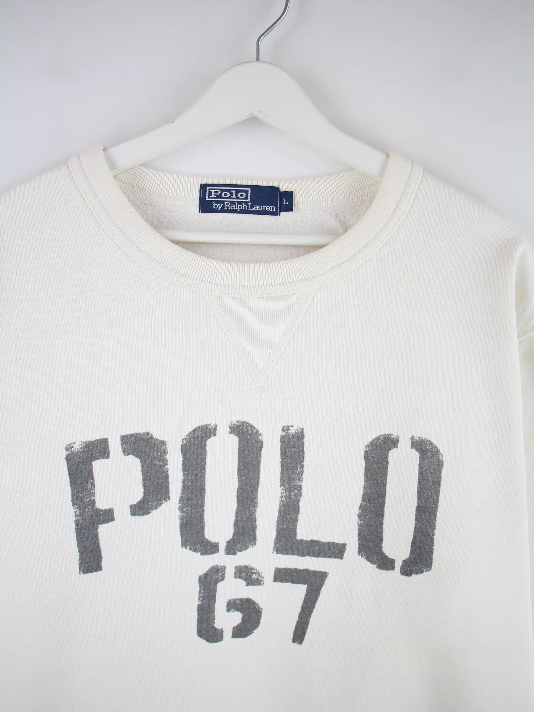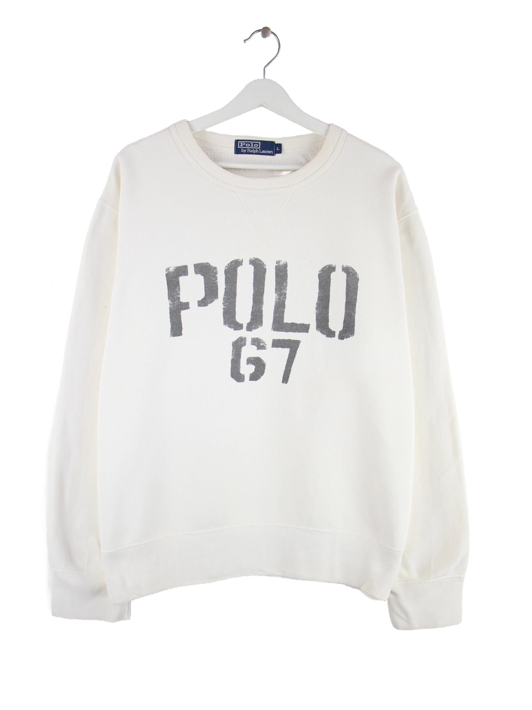 Weißer Sweater vom Brand Ralph Lauren in Größe L. Er ist aus einer Baumwollmischung und in gutem Zustand in Stock. Mit tollem 00s Print.