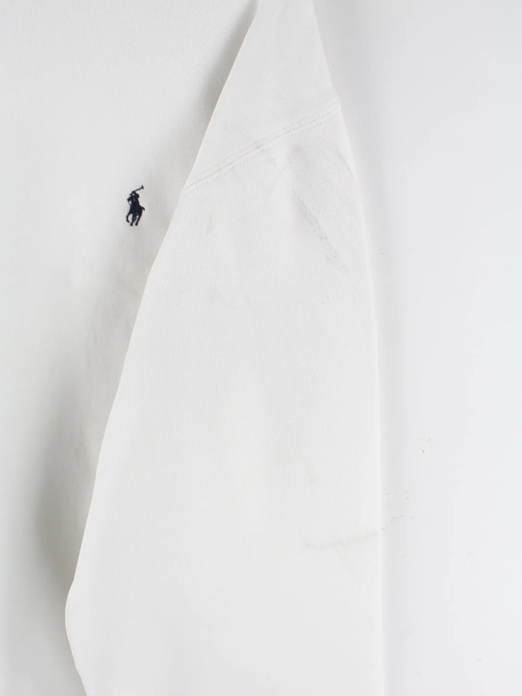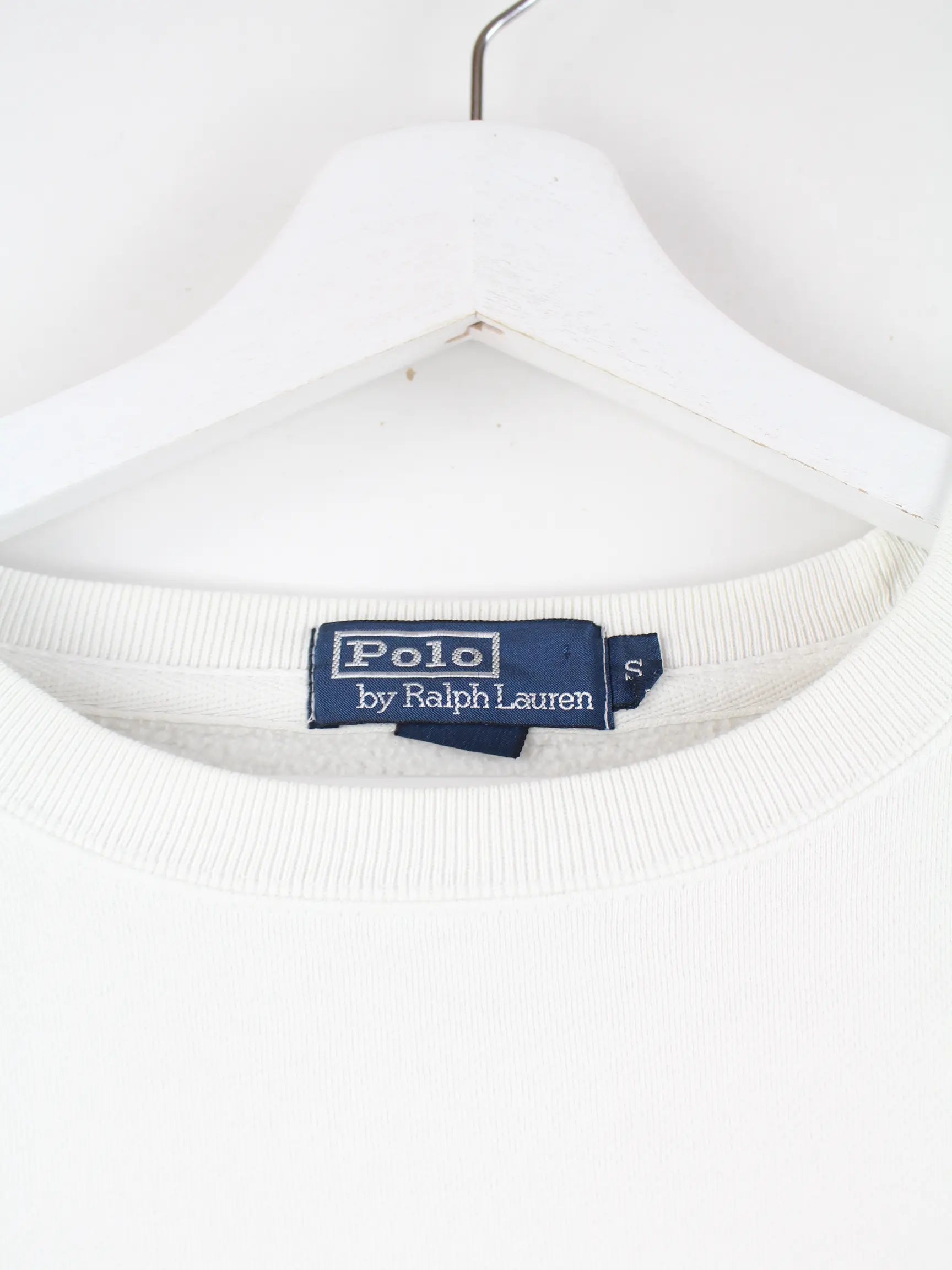 Sweater vom Label Ralph Lauren in Größe S aus den 90'ern. Er ist aus einer Baumwollmischung angefertigt und in Weiß im Bestand.