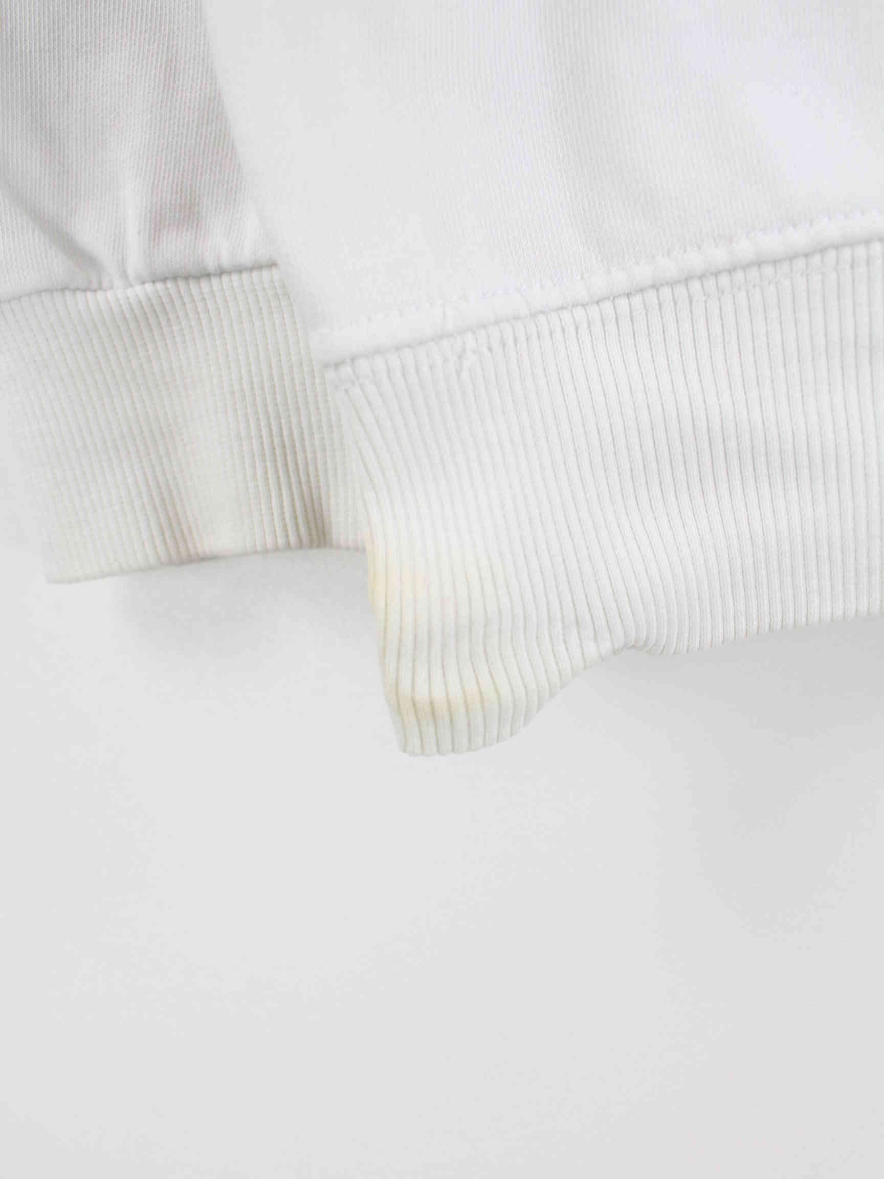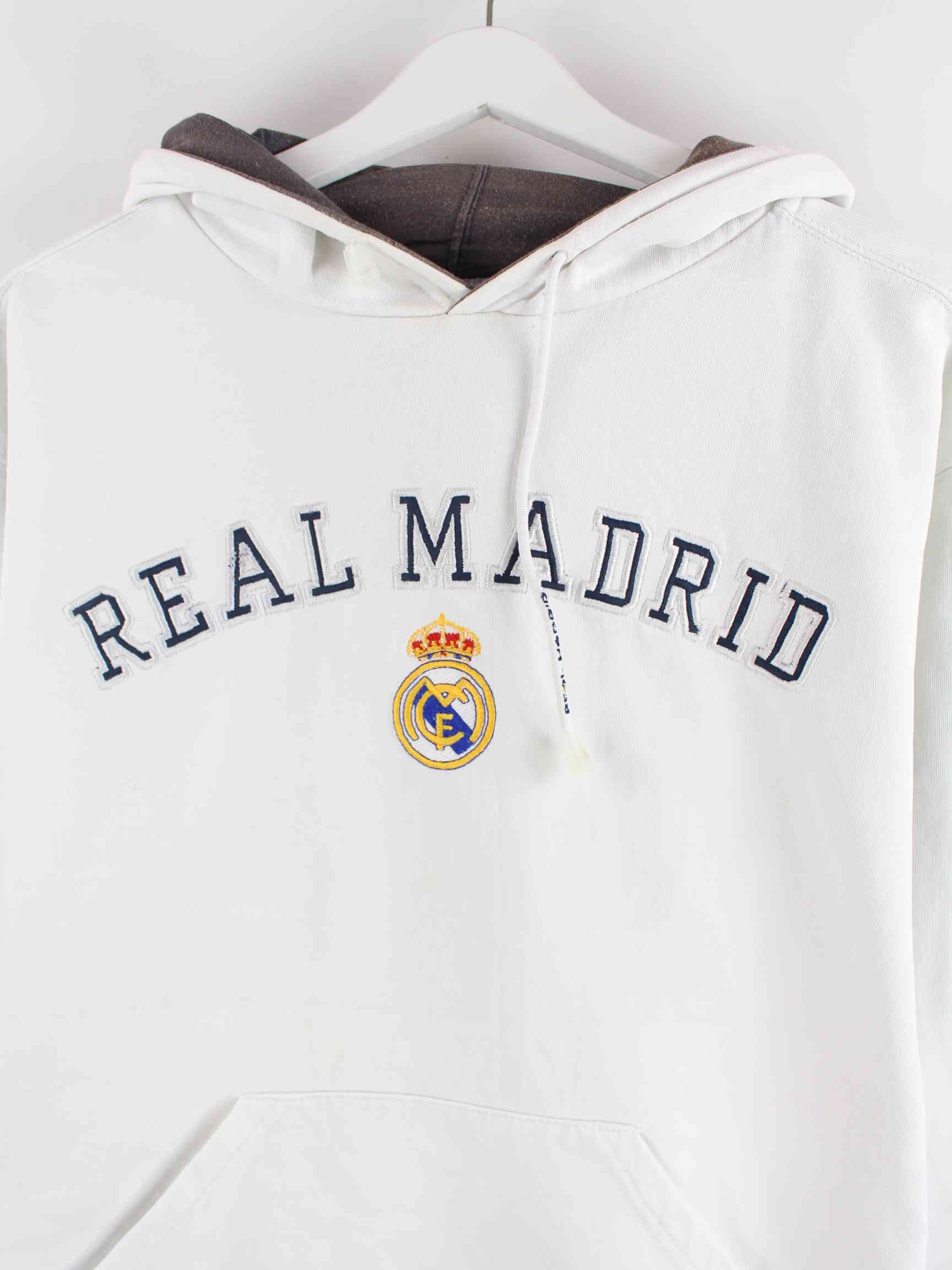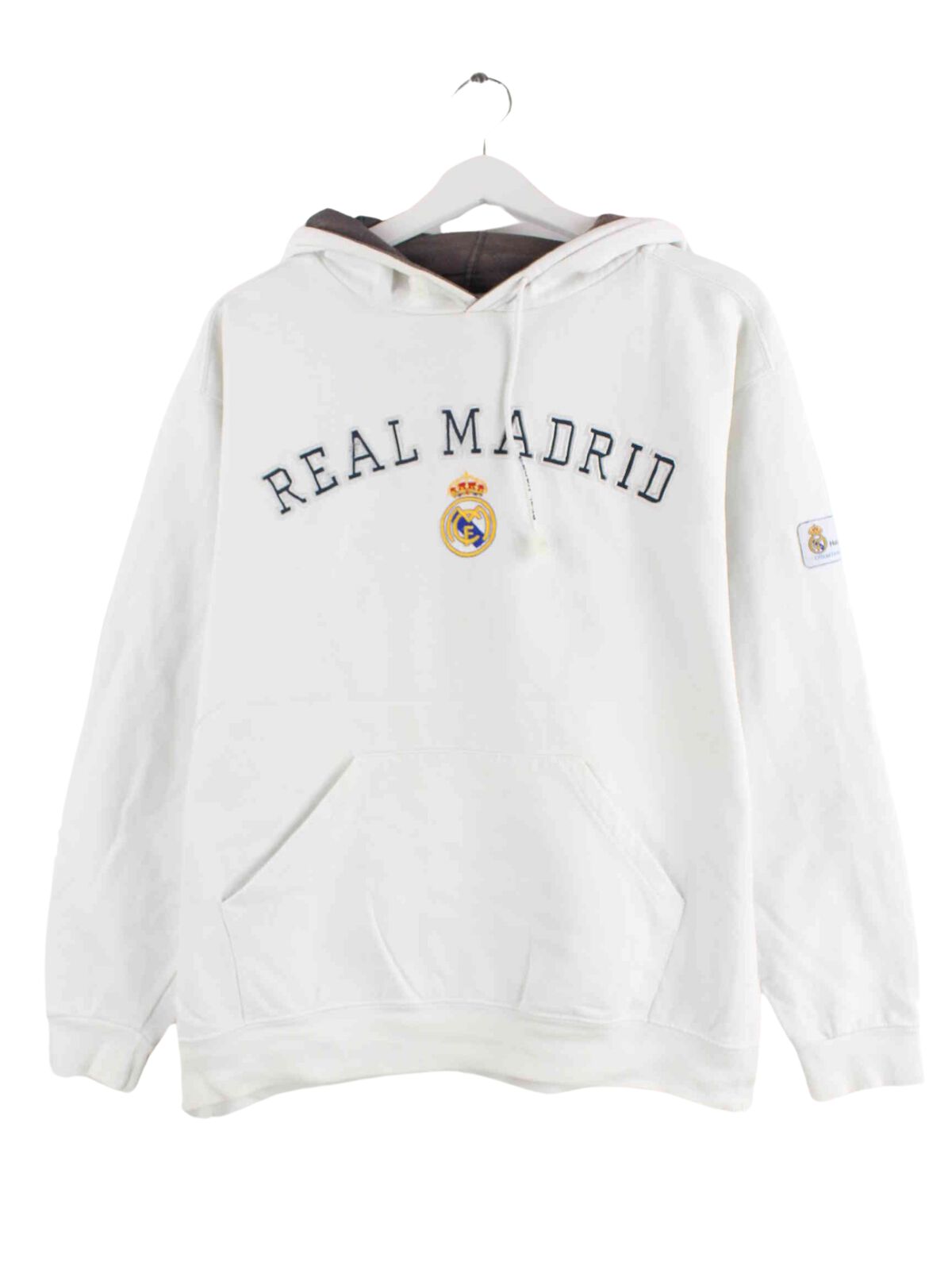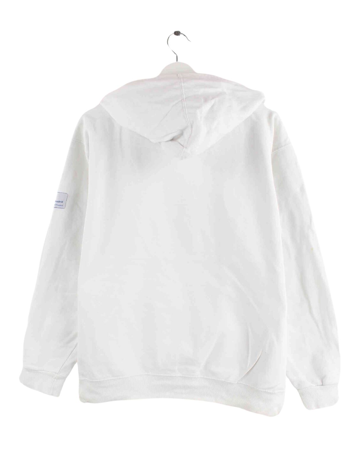 Hoodie from the Real Madrid brand in size M. It is made from a cotton blend and is available in white.