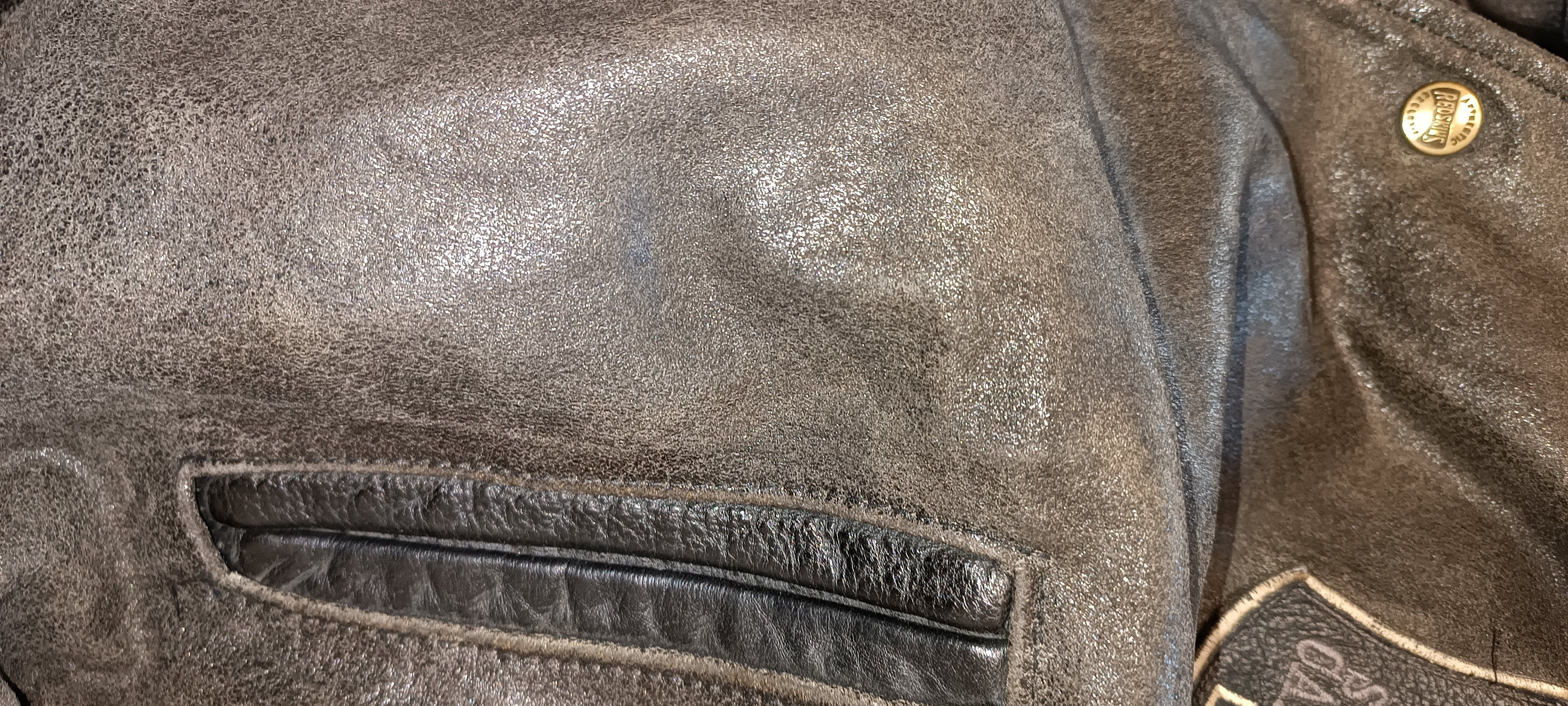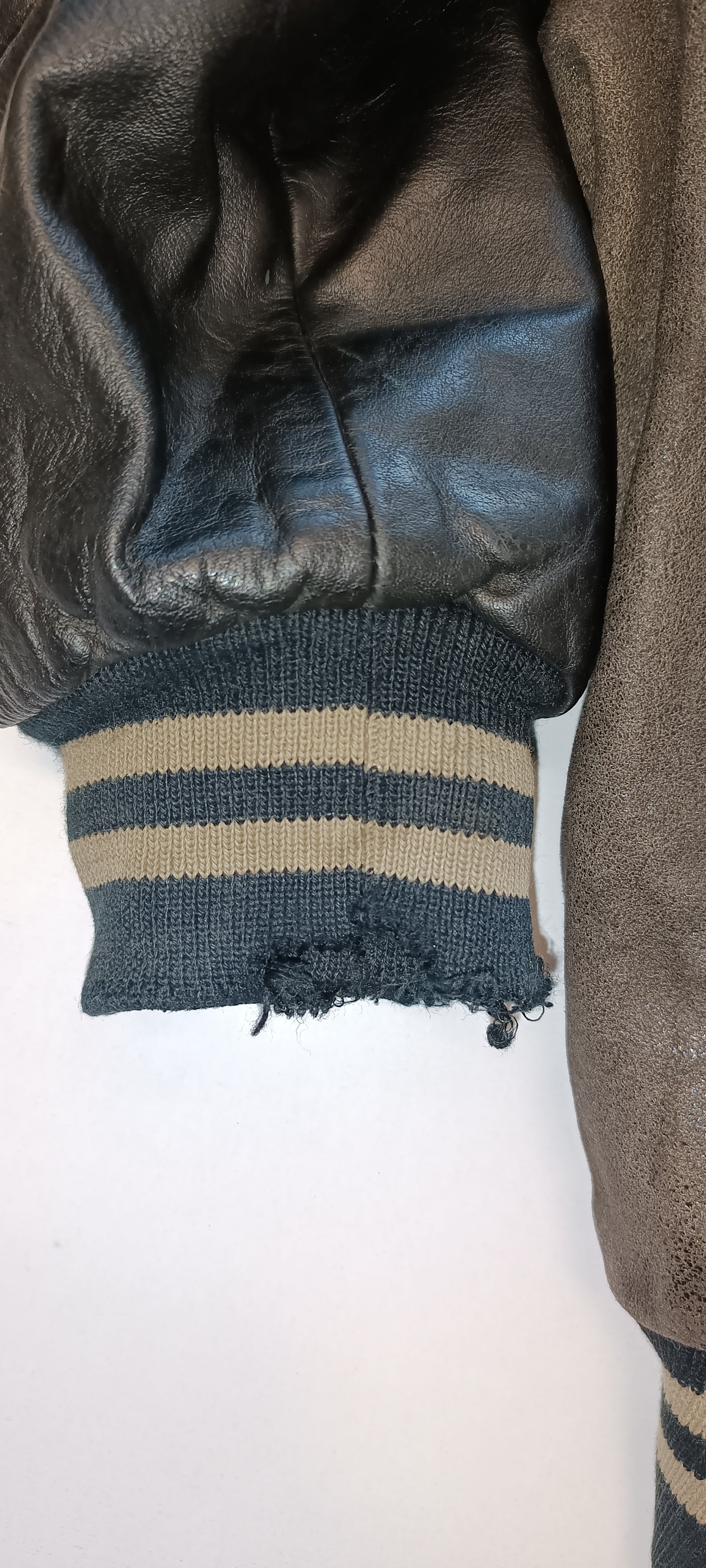 Defects: Cuffs frayed and a few blemishes on leather