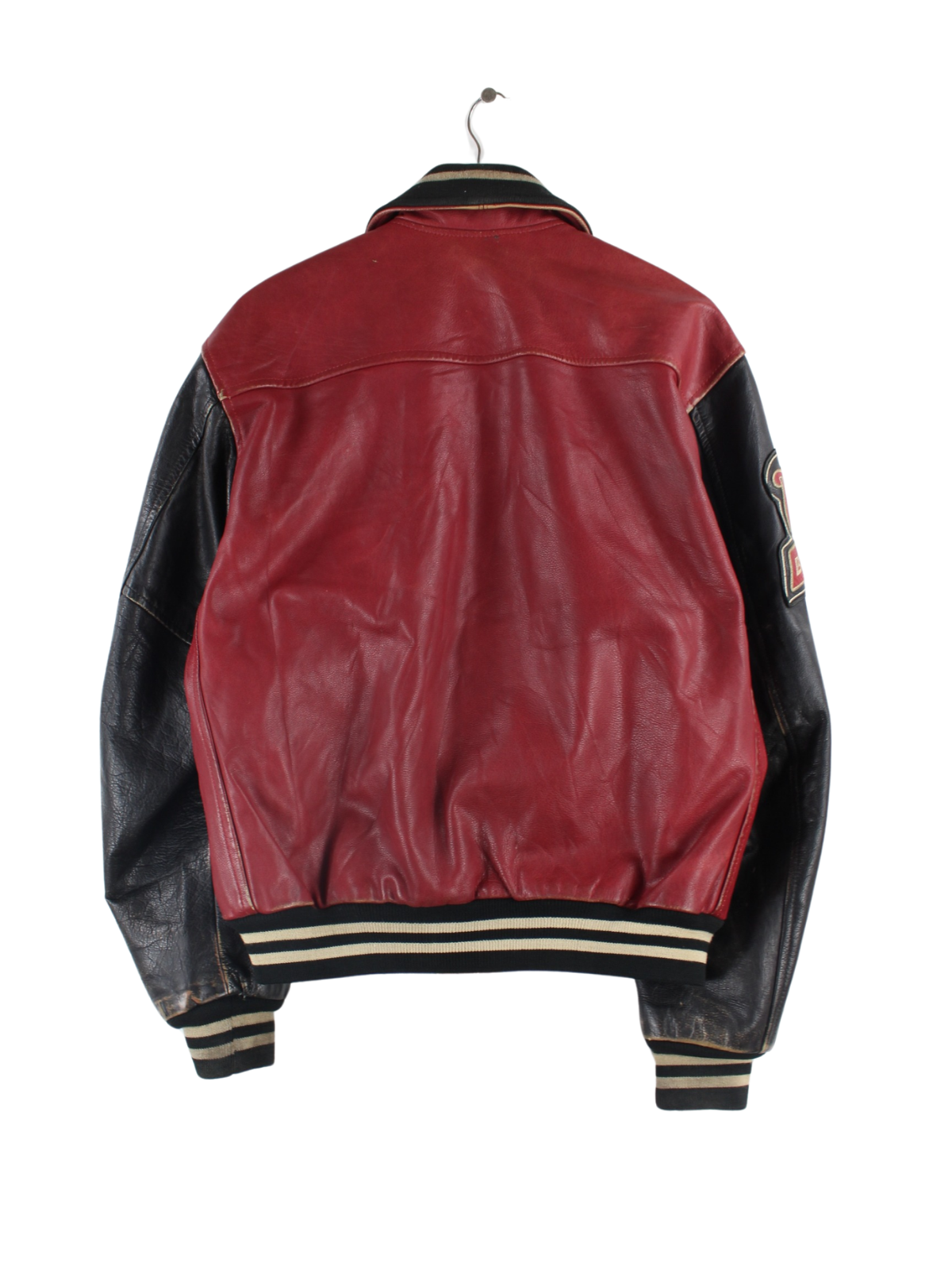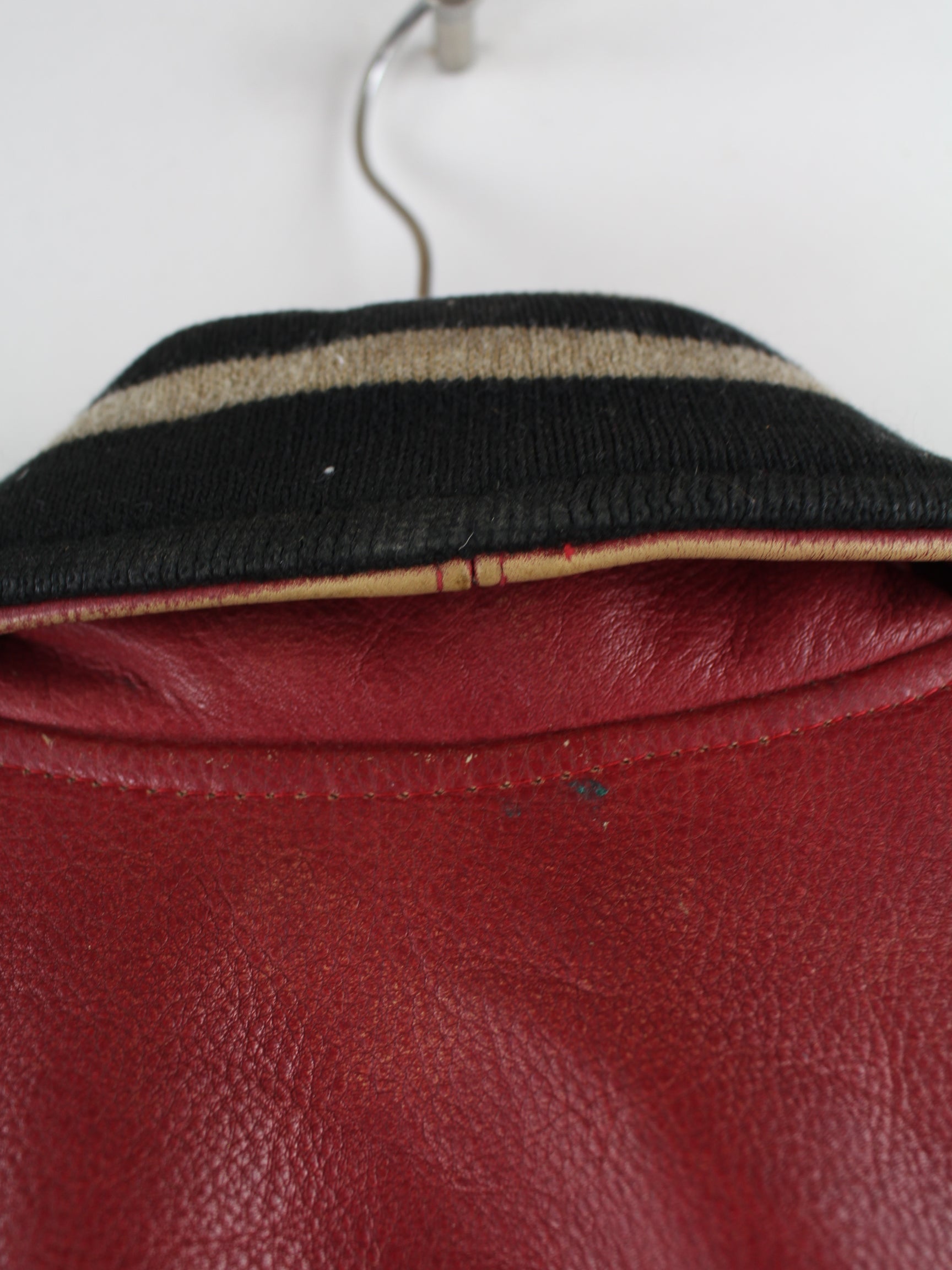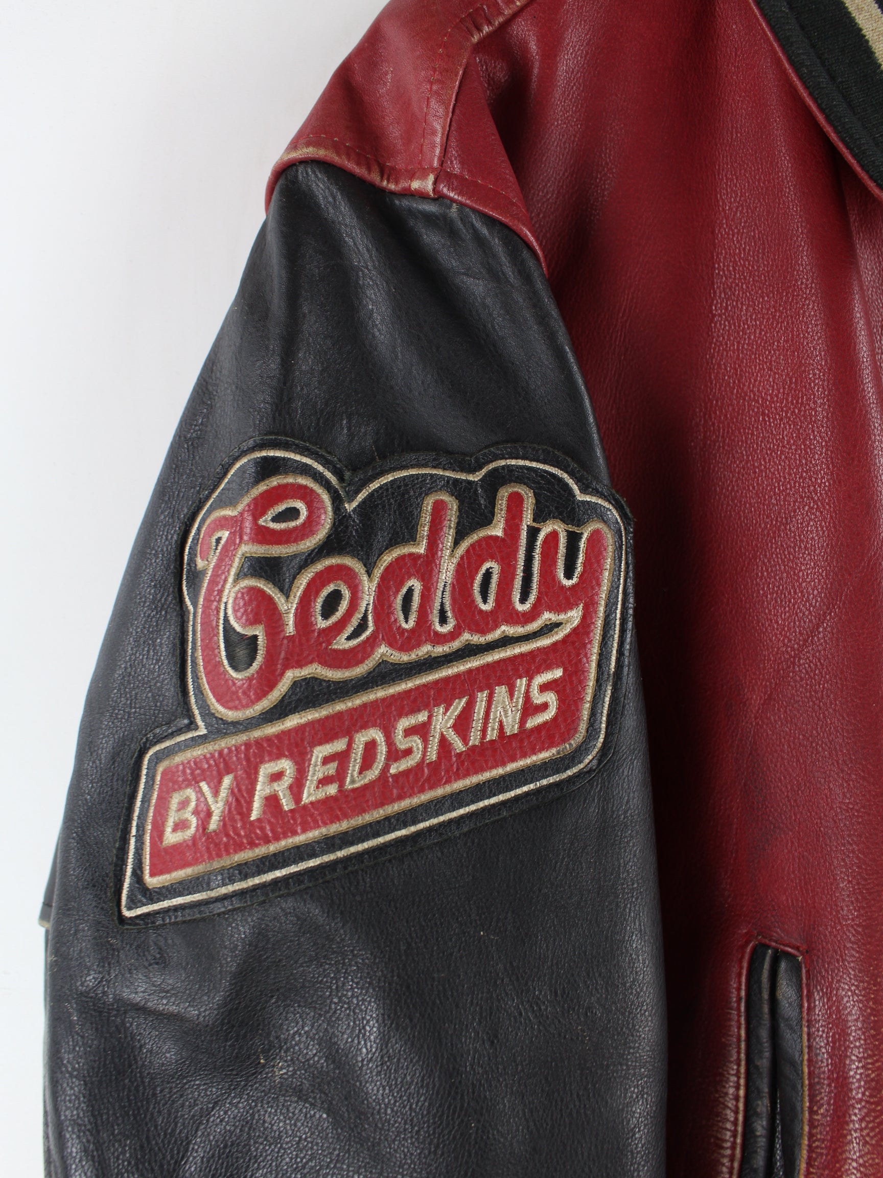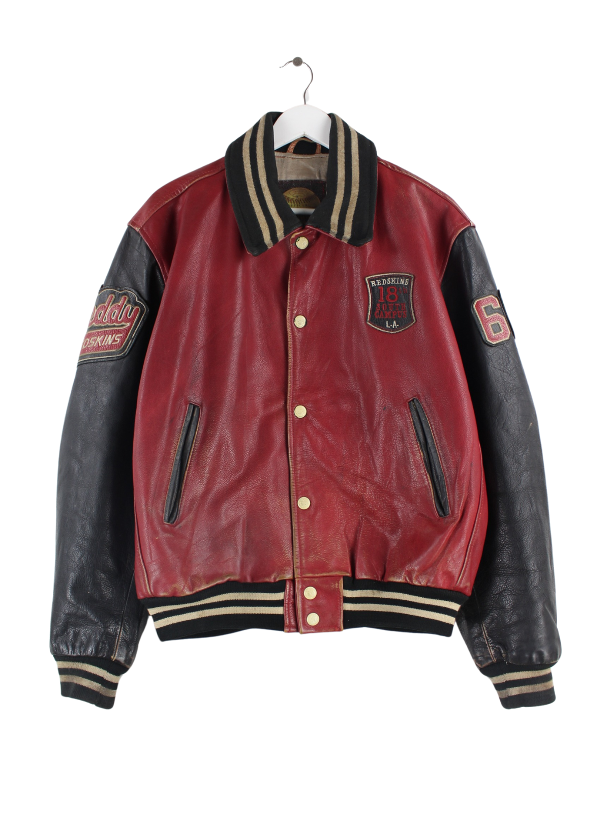 Red jacket with embroidered motifs from the Redskins brand from the 90's in size M. It is made of leather and is available in good condition.