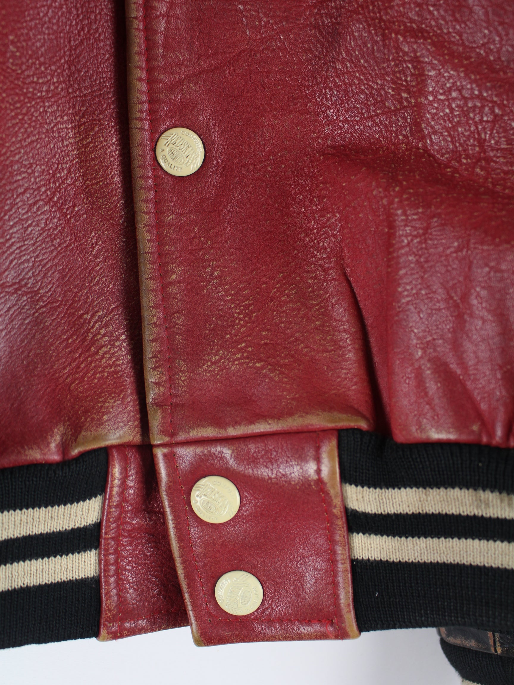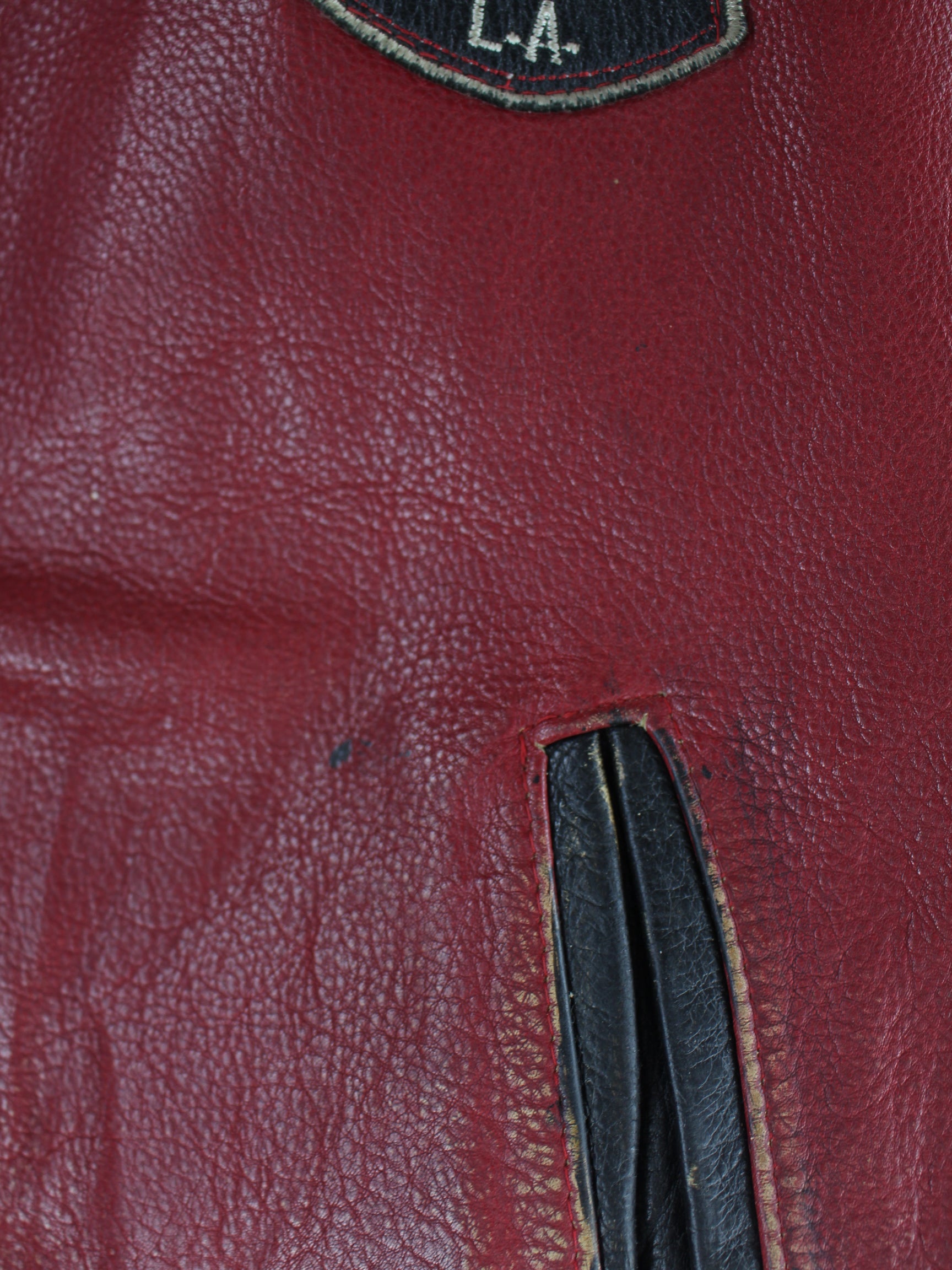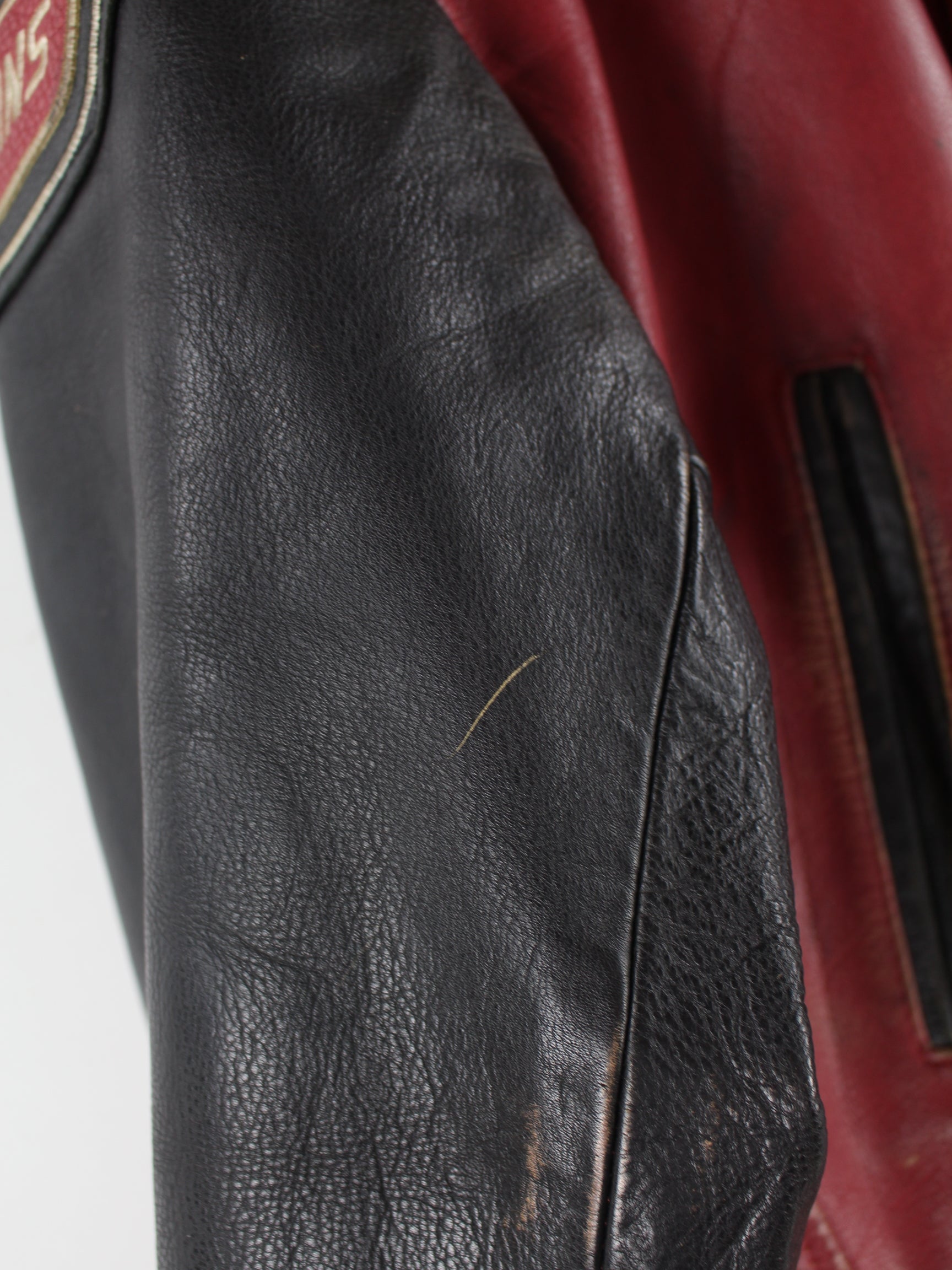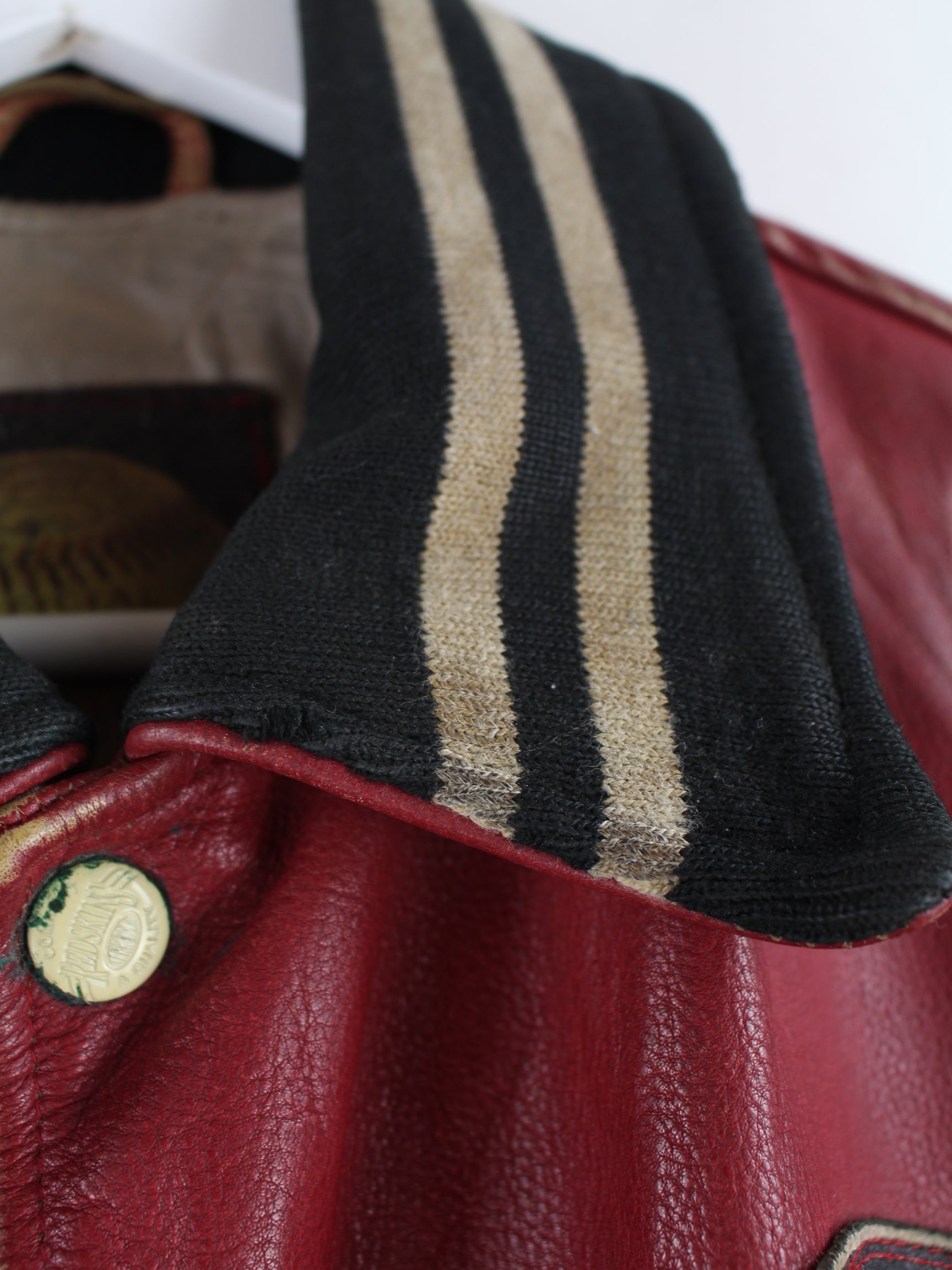 Red jacket with embroidered motifs from the Redskins brand from the 90's in size M. It is made of leather and is available in good condition.
