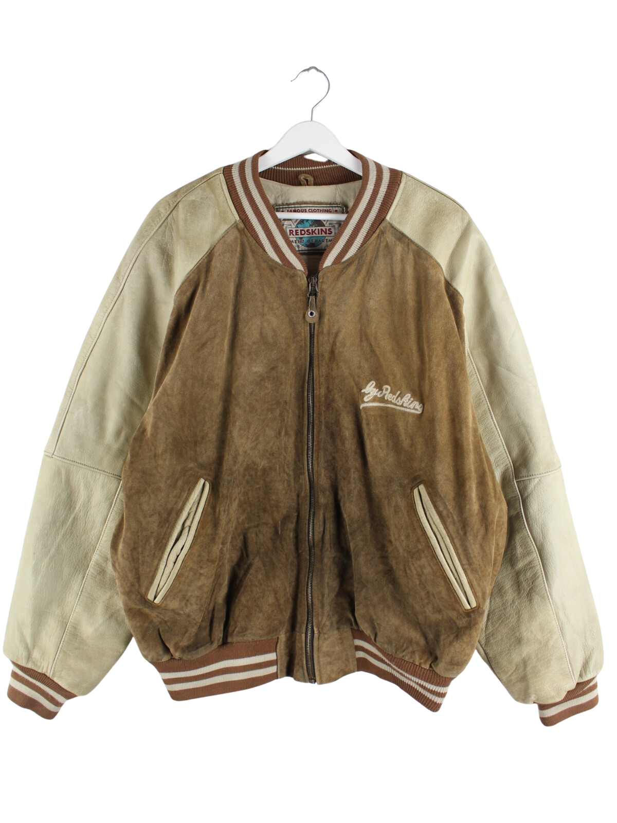 Jacket from the Redskins label with embroidery in size XL from the 90's. It is made of leather and is available in beige.