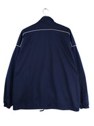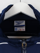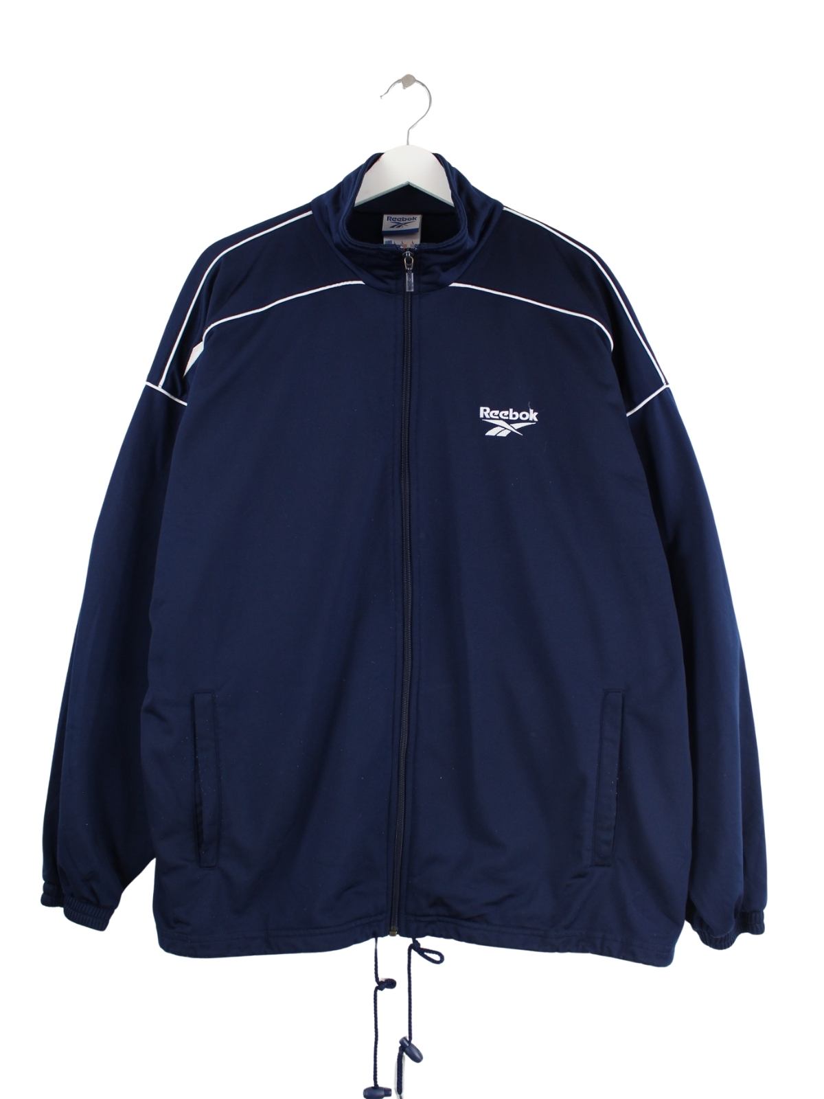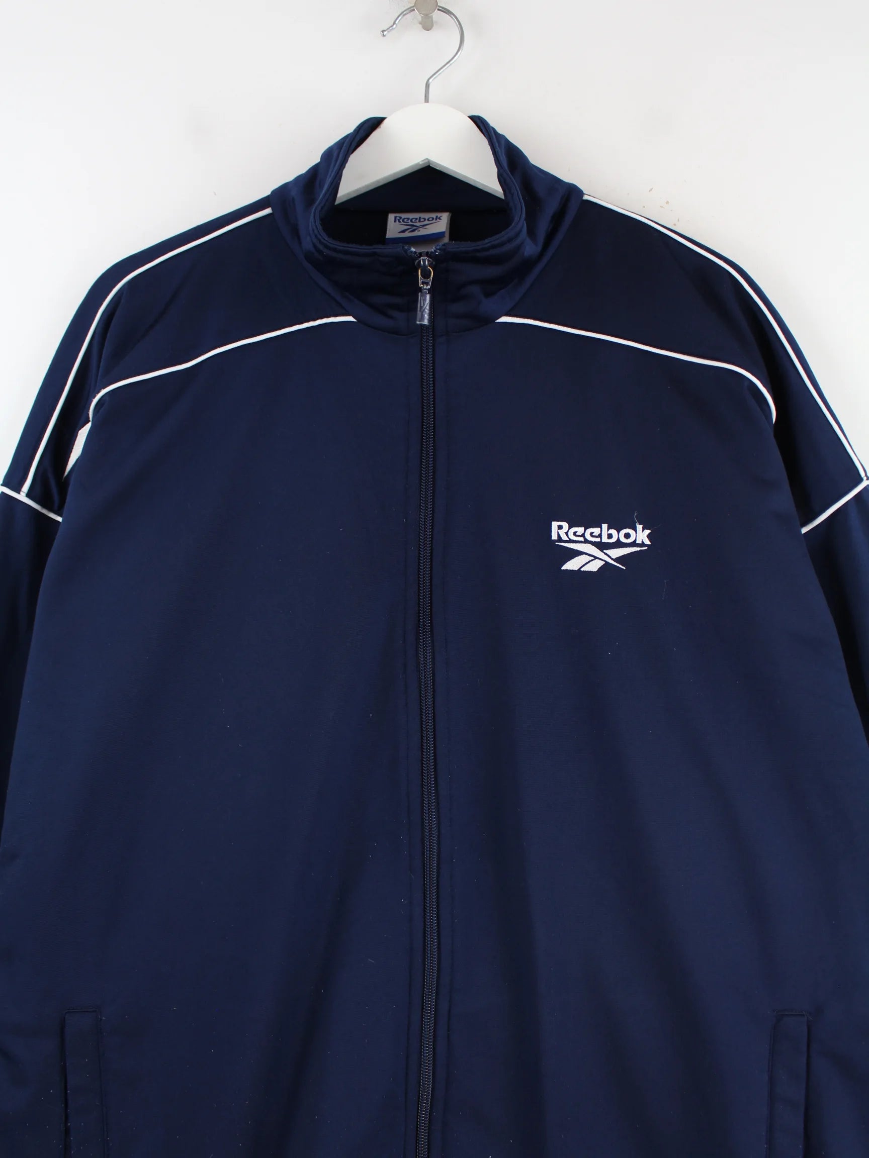 Blaue Trainingsjacke der Marke Reebok in Größe L. Sie ist aus Synthetik gemacht und in gutem Zustand bei uns zu bekommen.