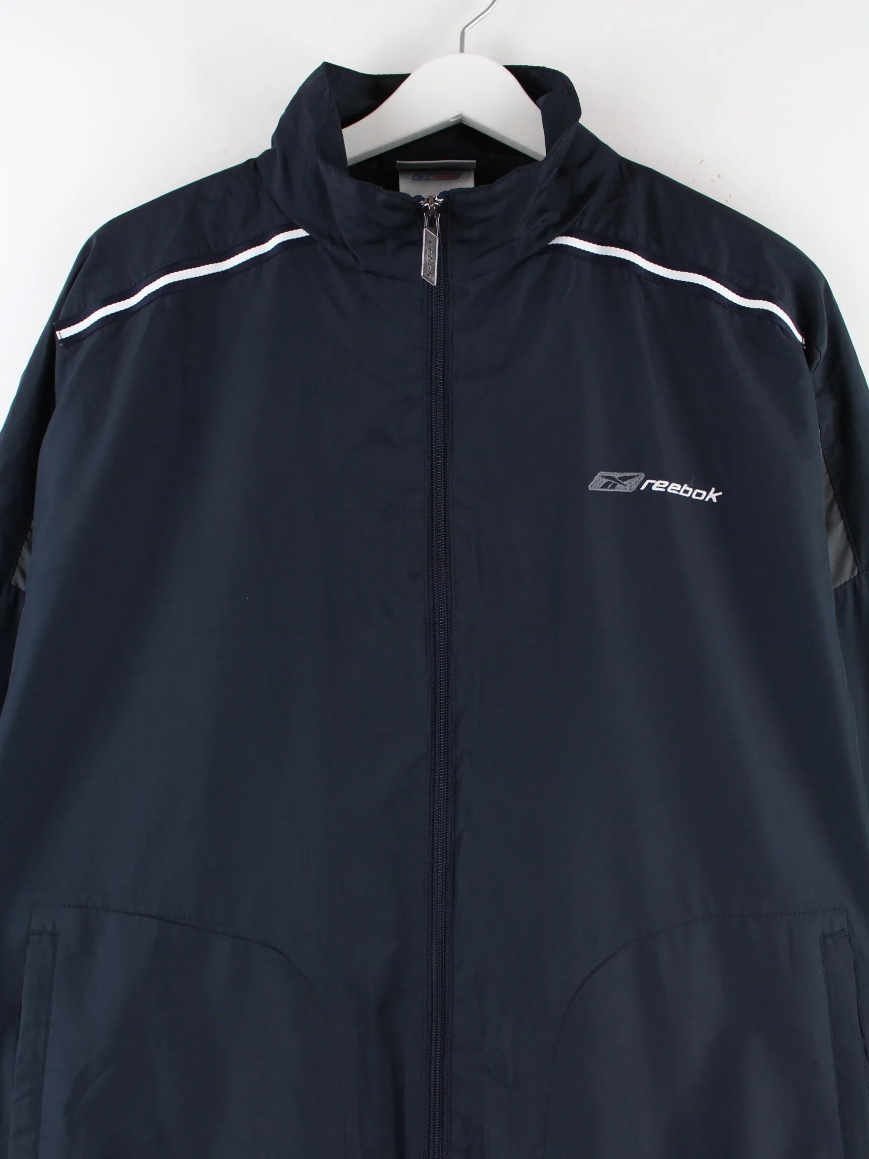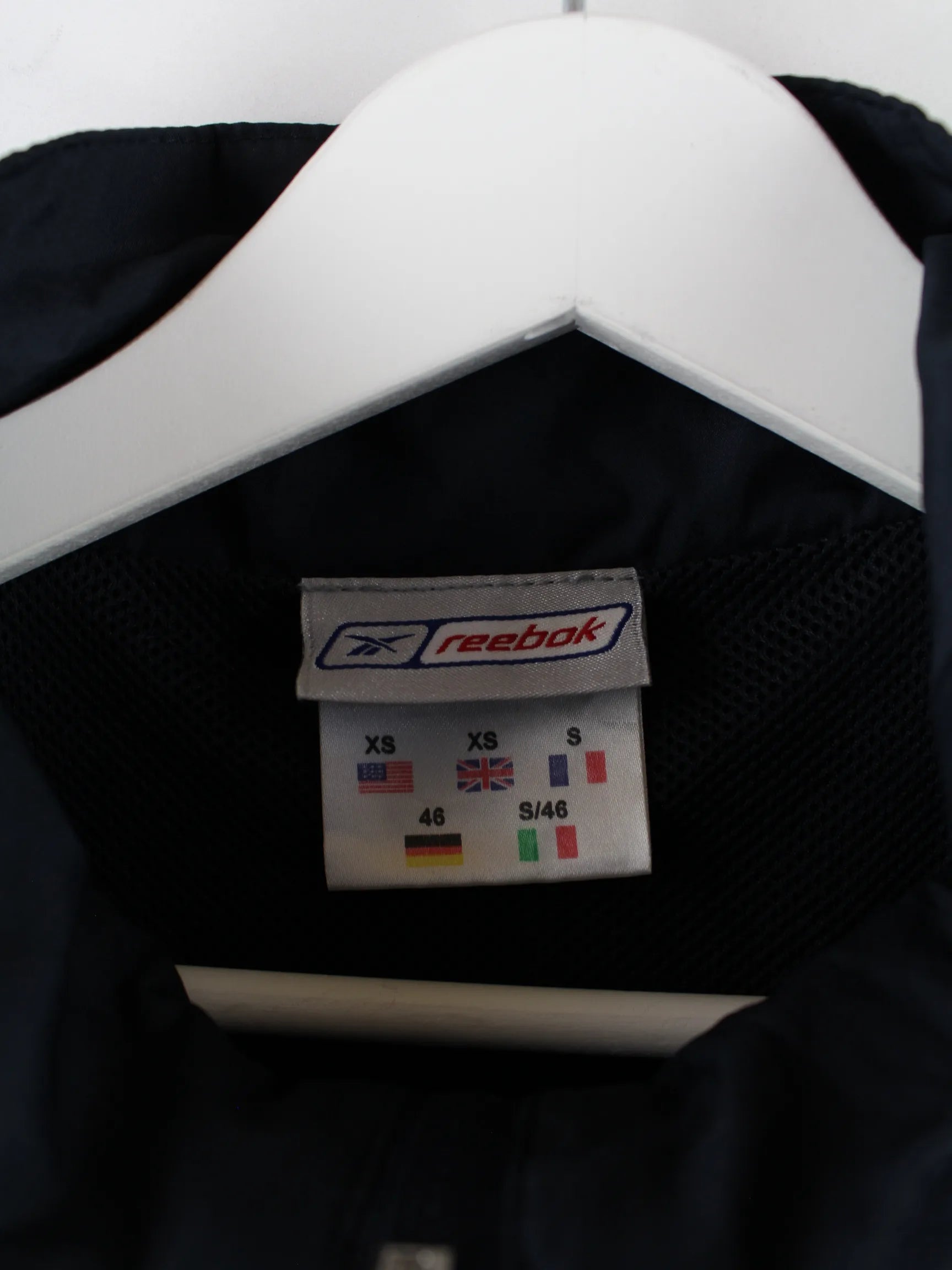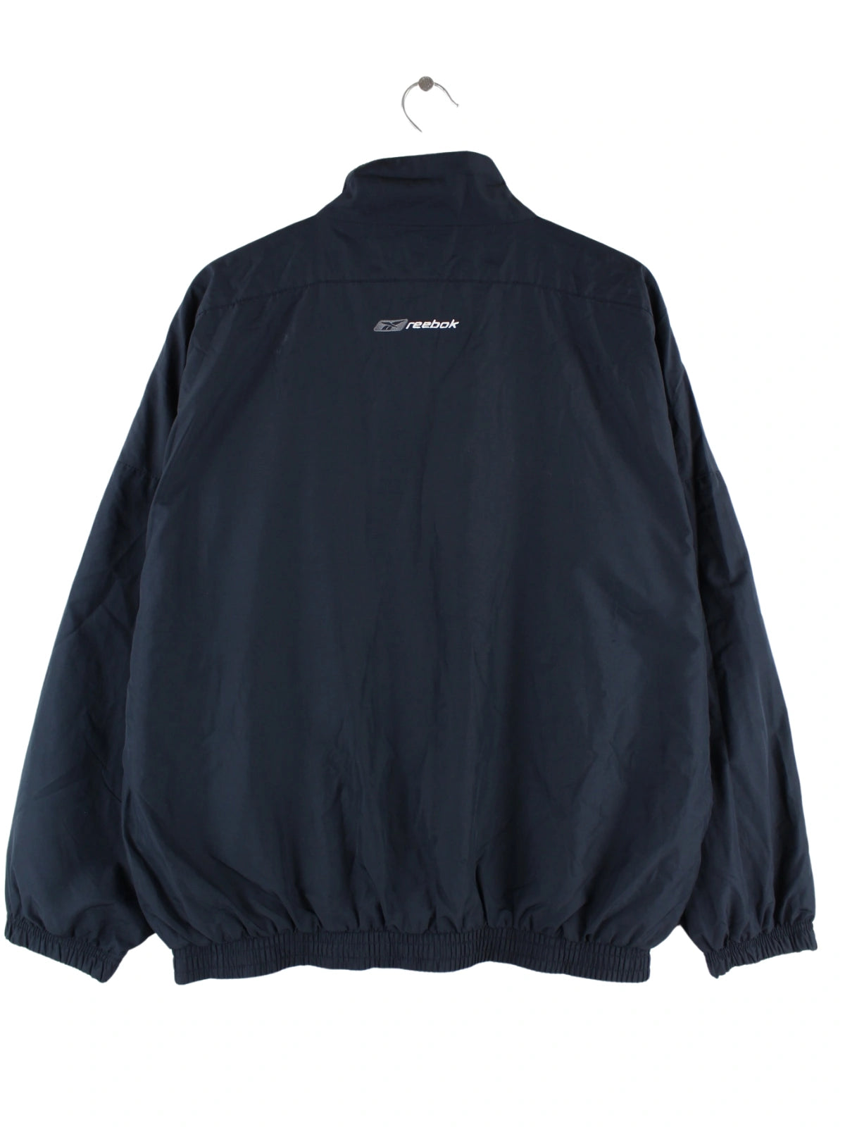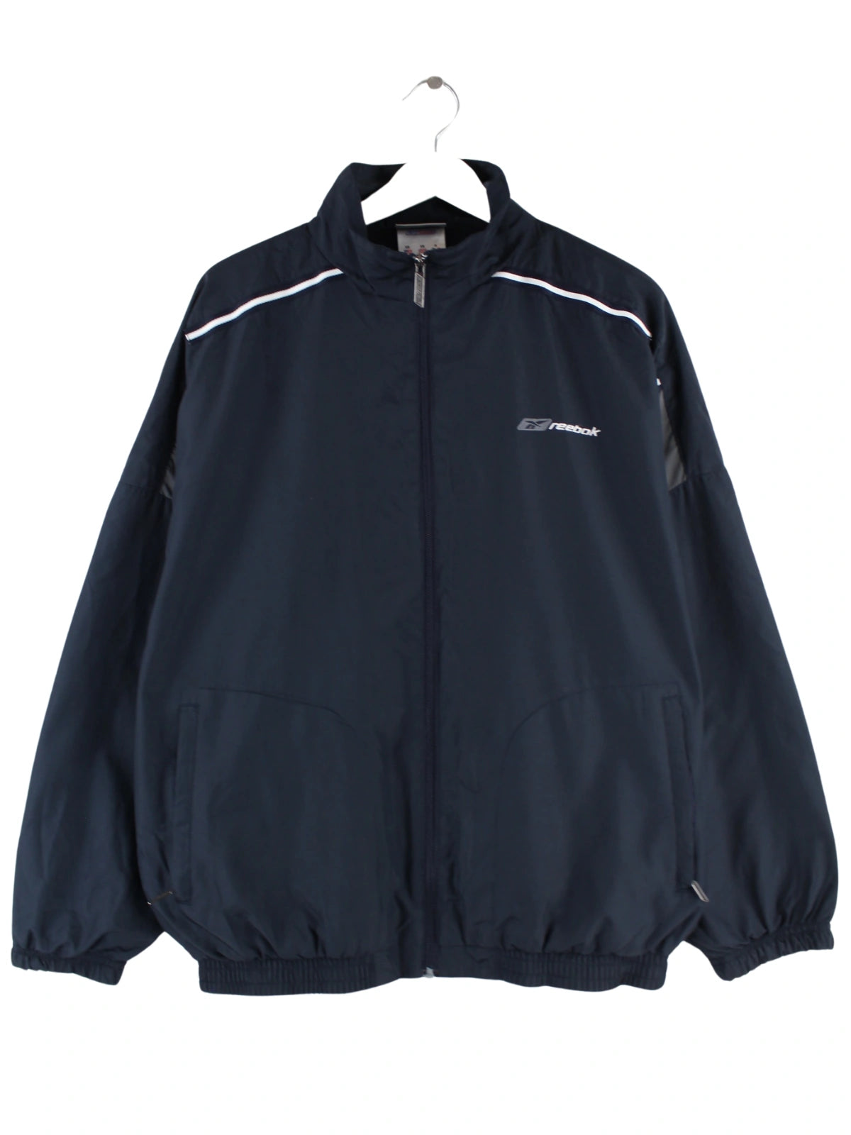 Blaue Trainingsjacke der Brand Reebok in Größe S. Sie ist aus Synthetik und in sehr gutem Zustand im Bestand.