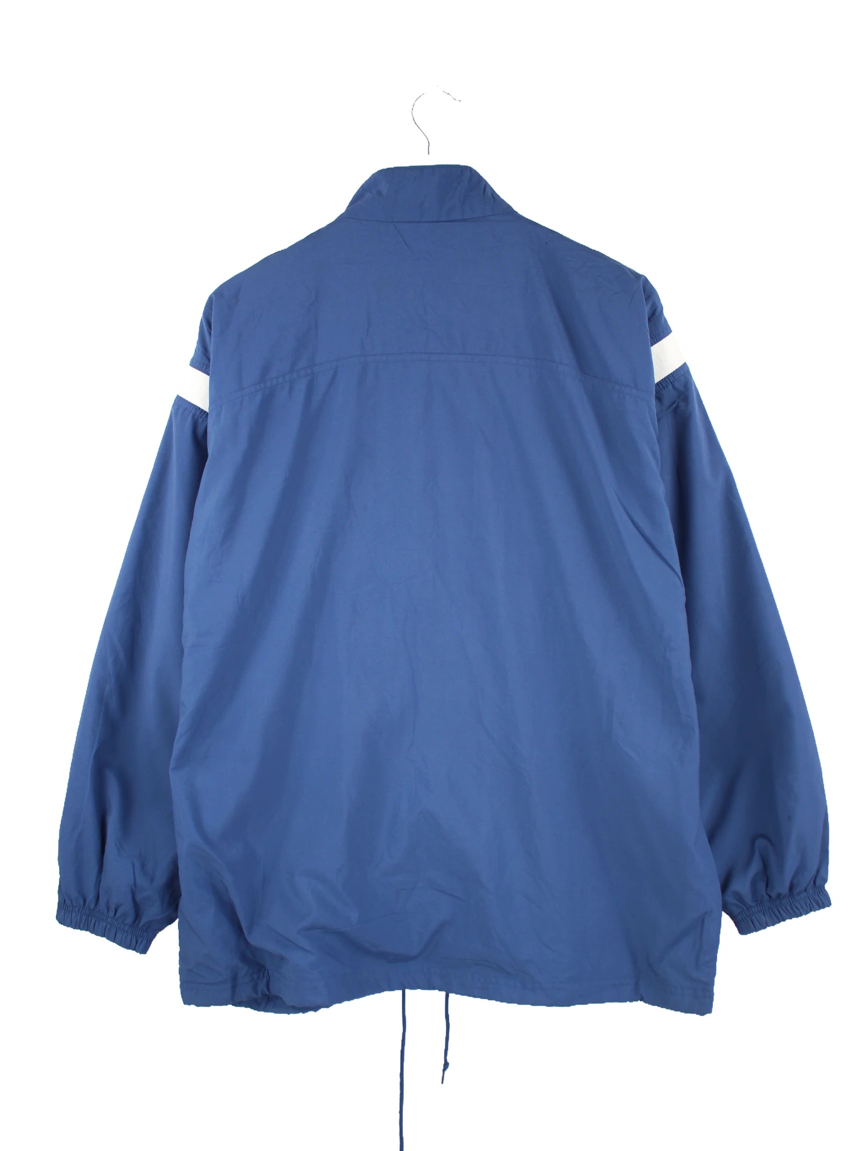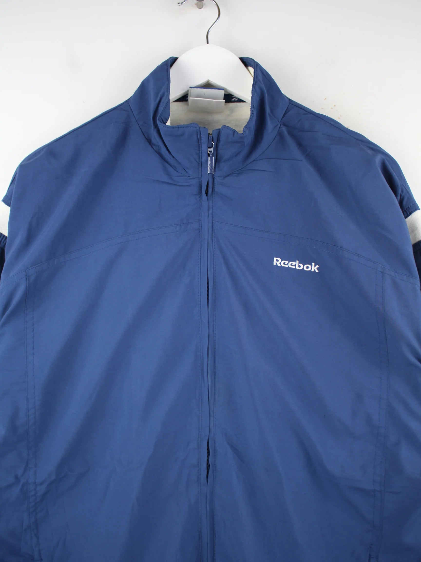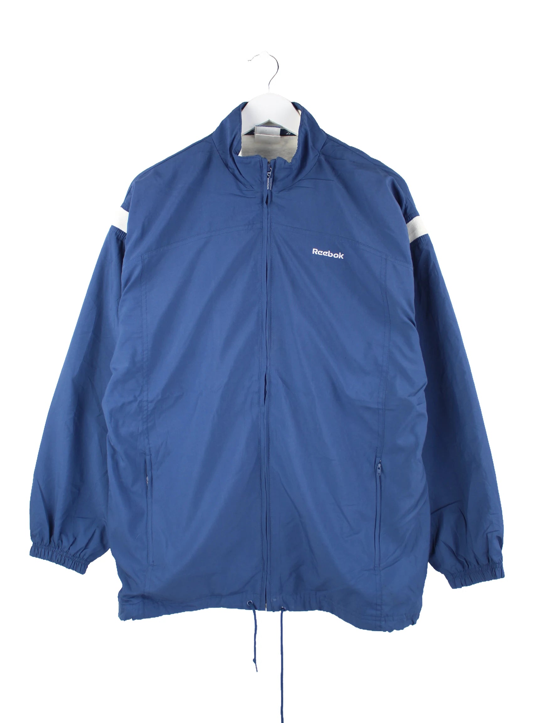 Blaue Trainingsjacke des Labels Reebok in Größe L. Sie ist aus Synthetik und in sehr gutem Zustand bei uns zu bekommen.
