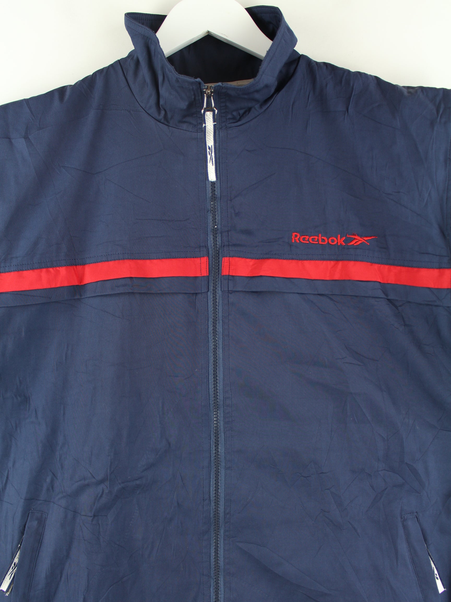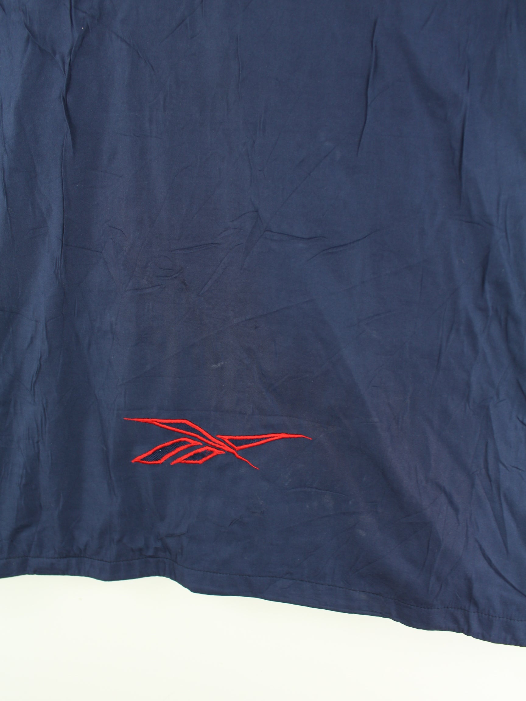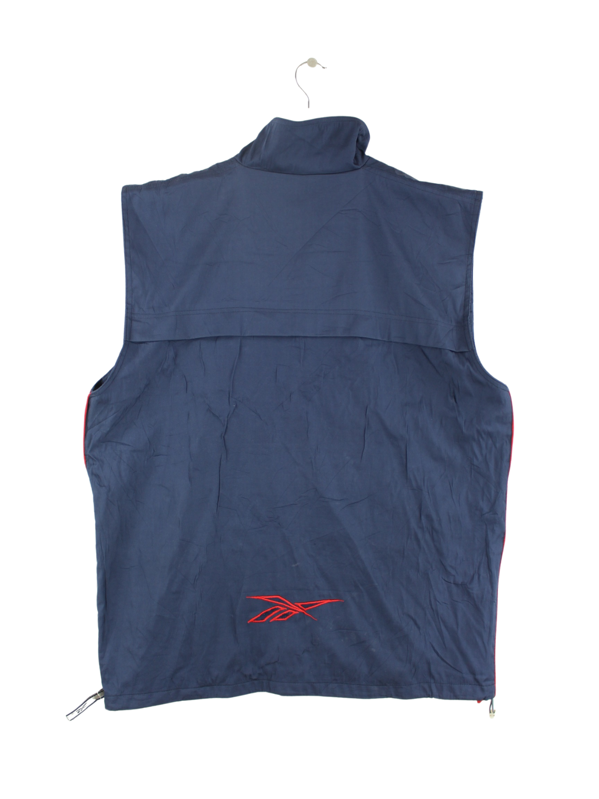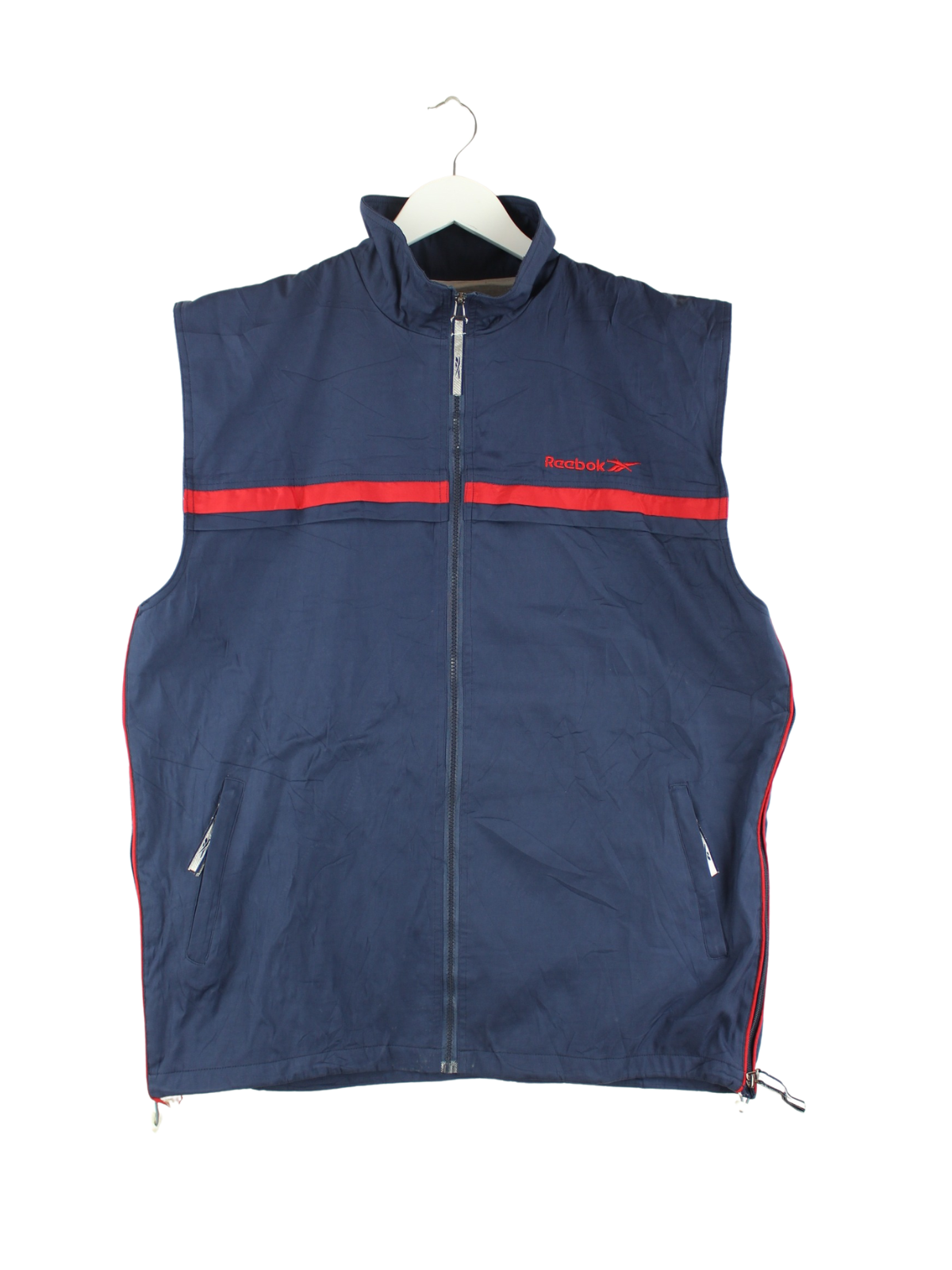 Blue vest with embroidered motifs from the Reebok label from the early 2000s in size XXL. It is made of synthetic material and is in good condition in stock.