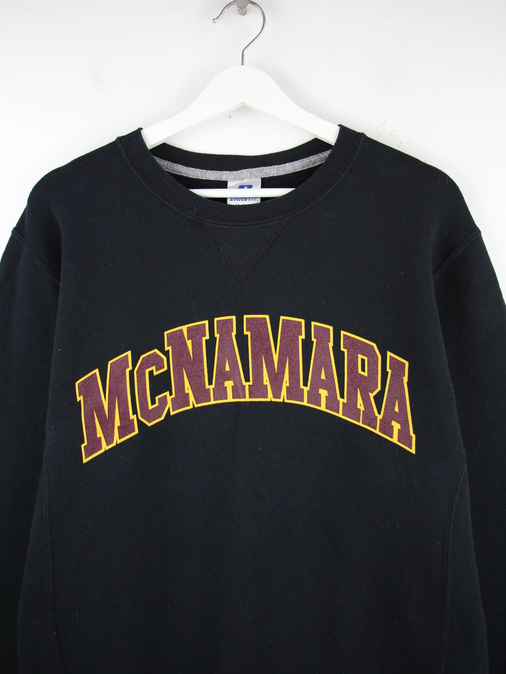Schwarzer Sweater der Marke Russell Athletic in Größe M. Er ist aus einer Baumwollmischung produziert und in gutem Zustand lieferbar. Mit schönem Namara Print.