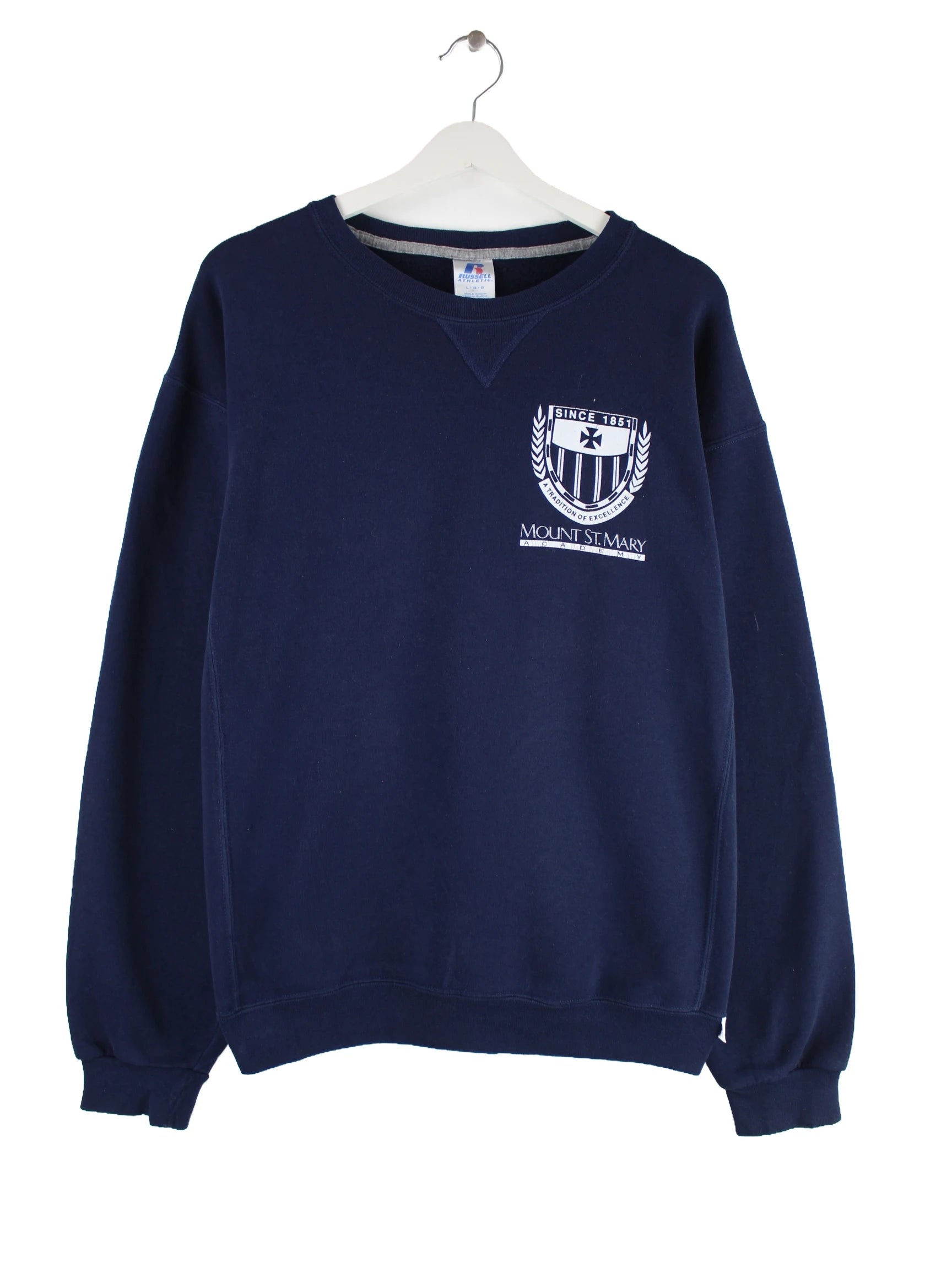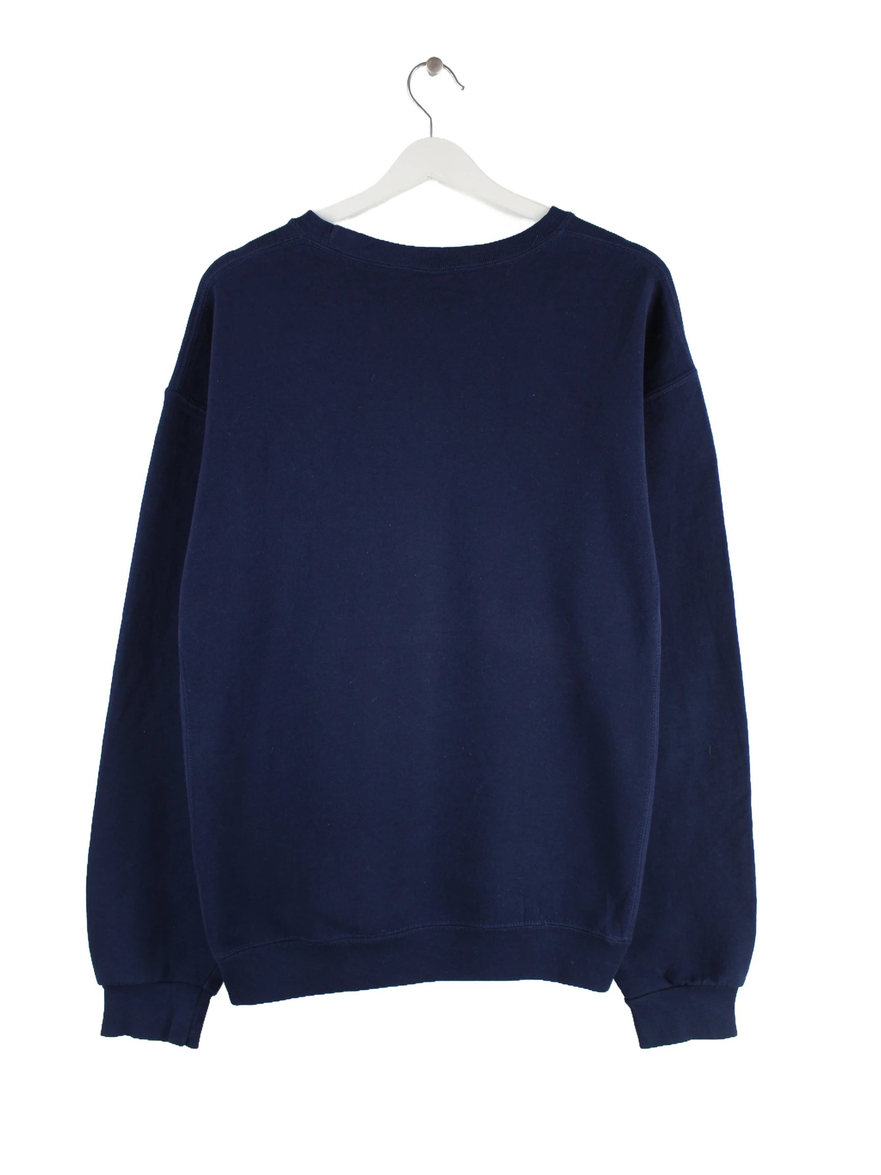 Blauer Sweater der Marke Russell Athletic in Größe L. Er ist aus einer Baumwollmischung produziert und in sehr gutem Zustand im Bestand. Mit chiquem 00s Print.