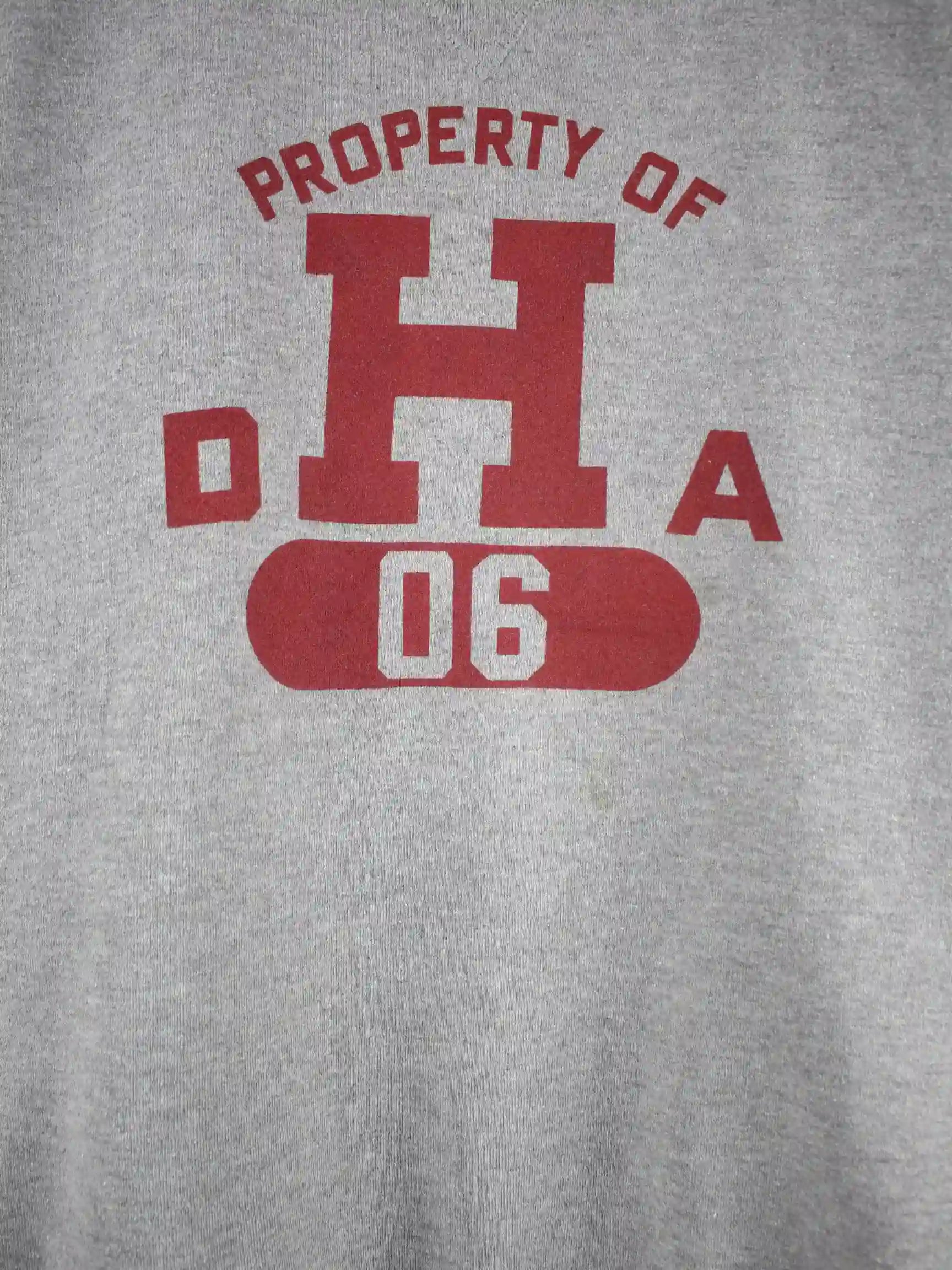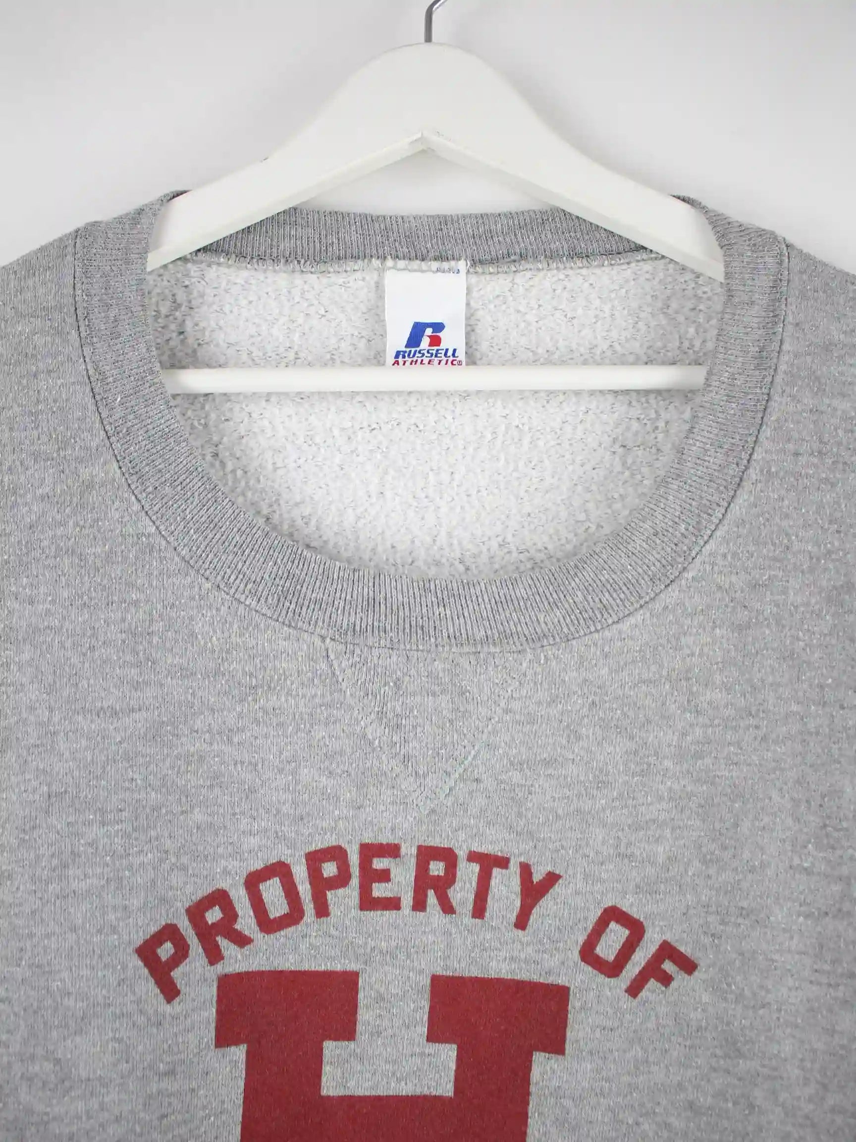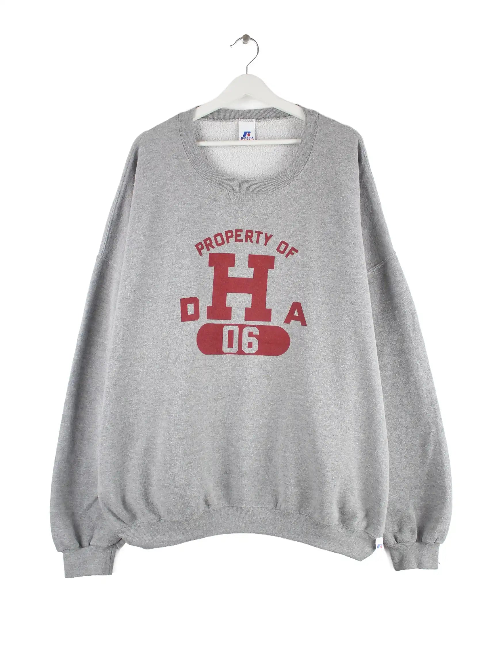Grauer Sweater aus dem Hause Russell Athletic in Größe 3XL. Er ist aus einer Baumwollmischung hergestellt und in gutem Zustand auf Lager. Mit schönem 00s Print.