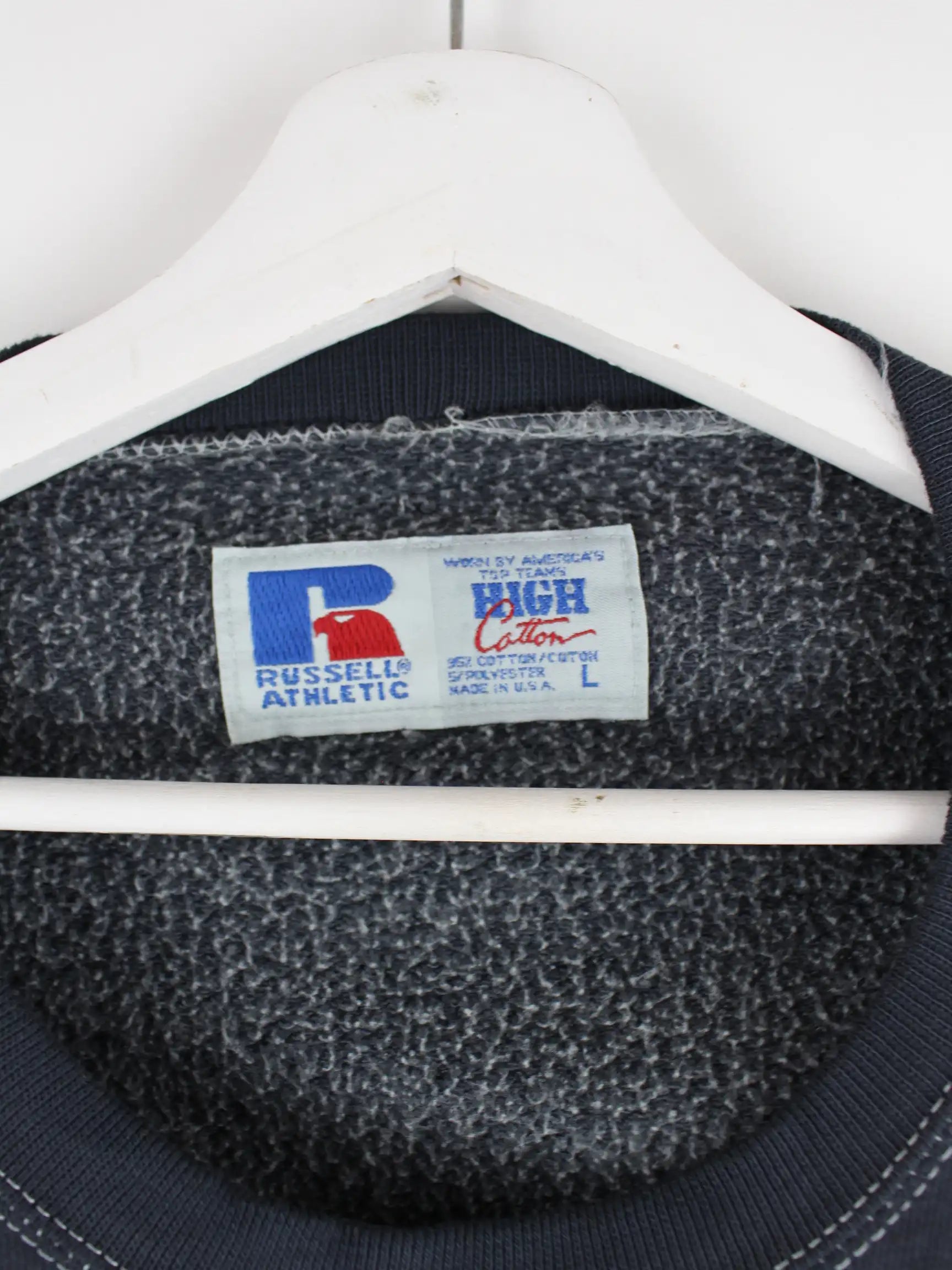 Sweater aus dem Hause Russell Athletic in Größe L aus den 90'ern. Er ist aus einer Baumwollmischung gemacht und in Schwarz auf Lager.
