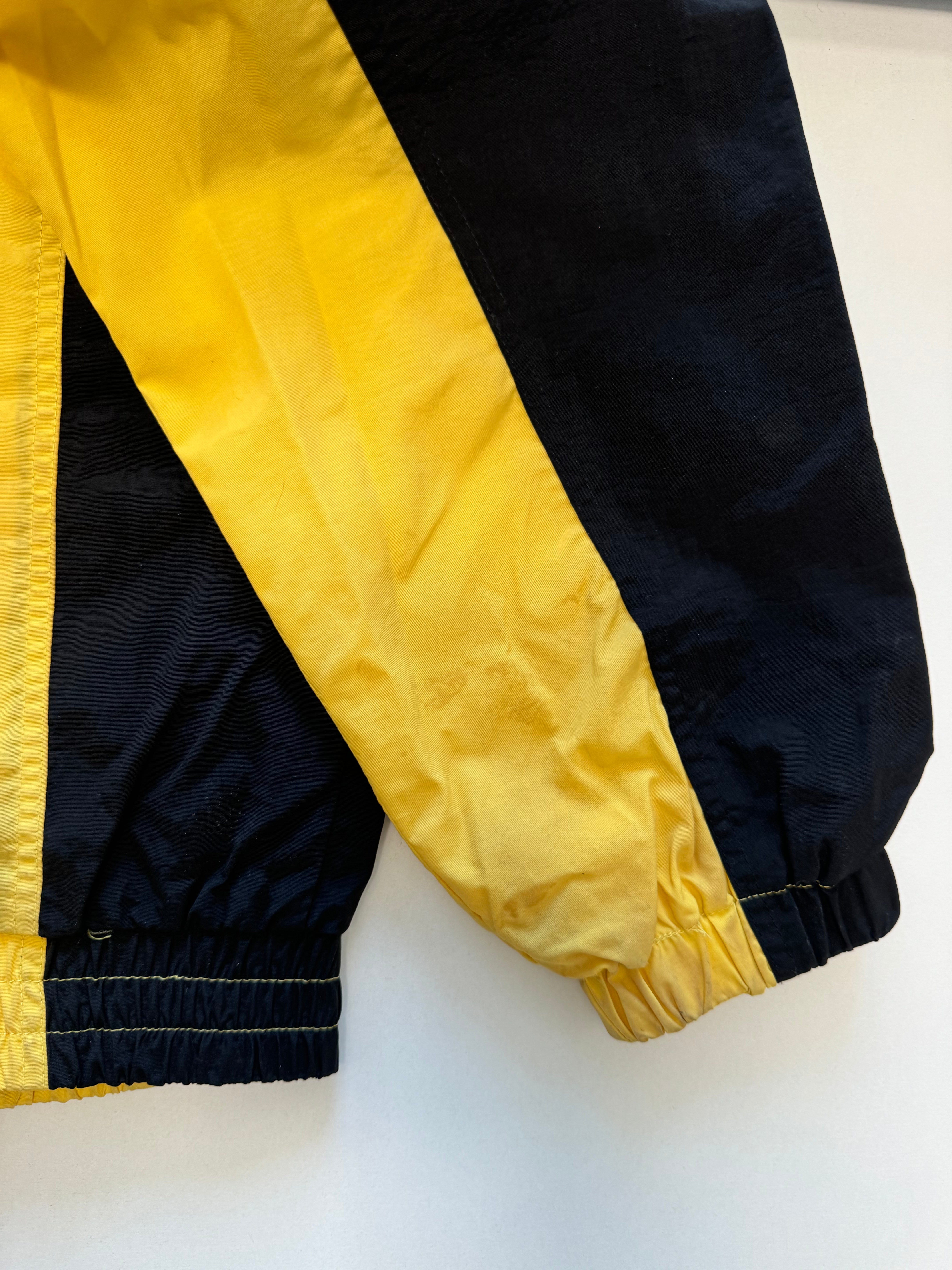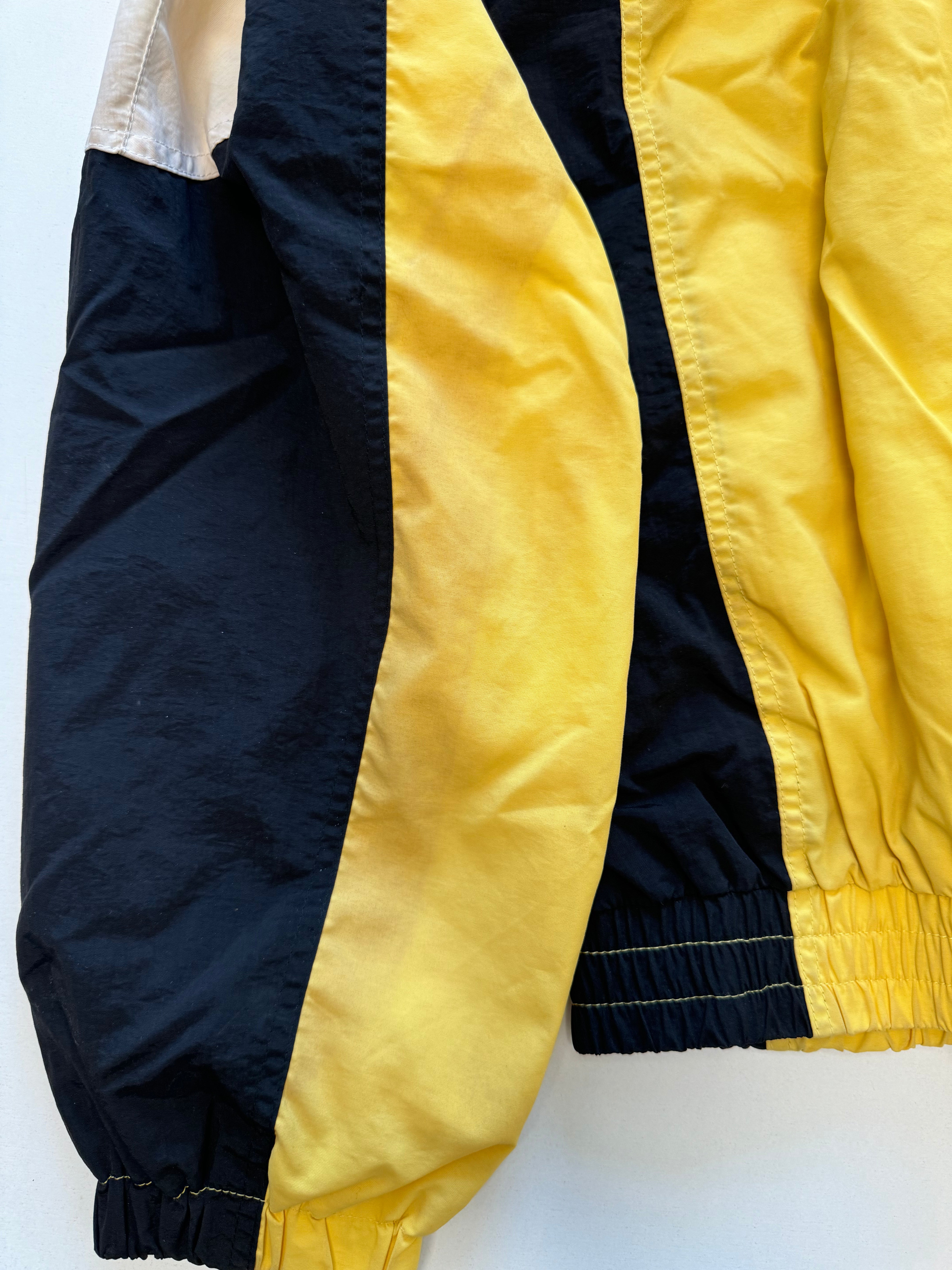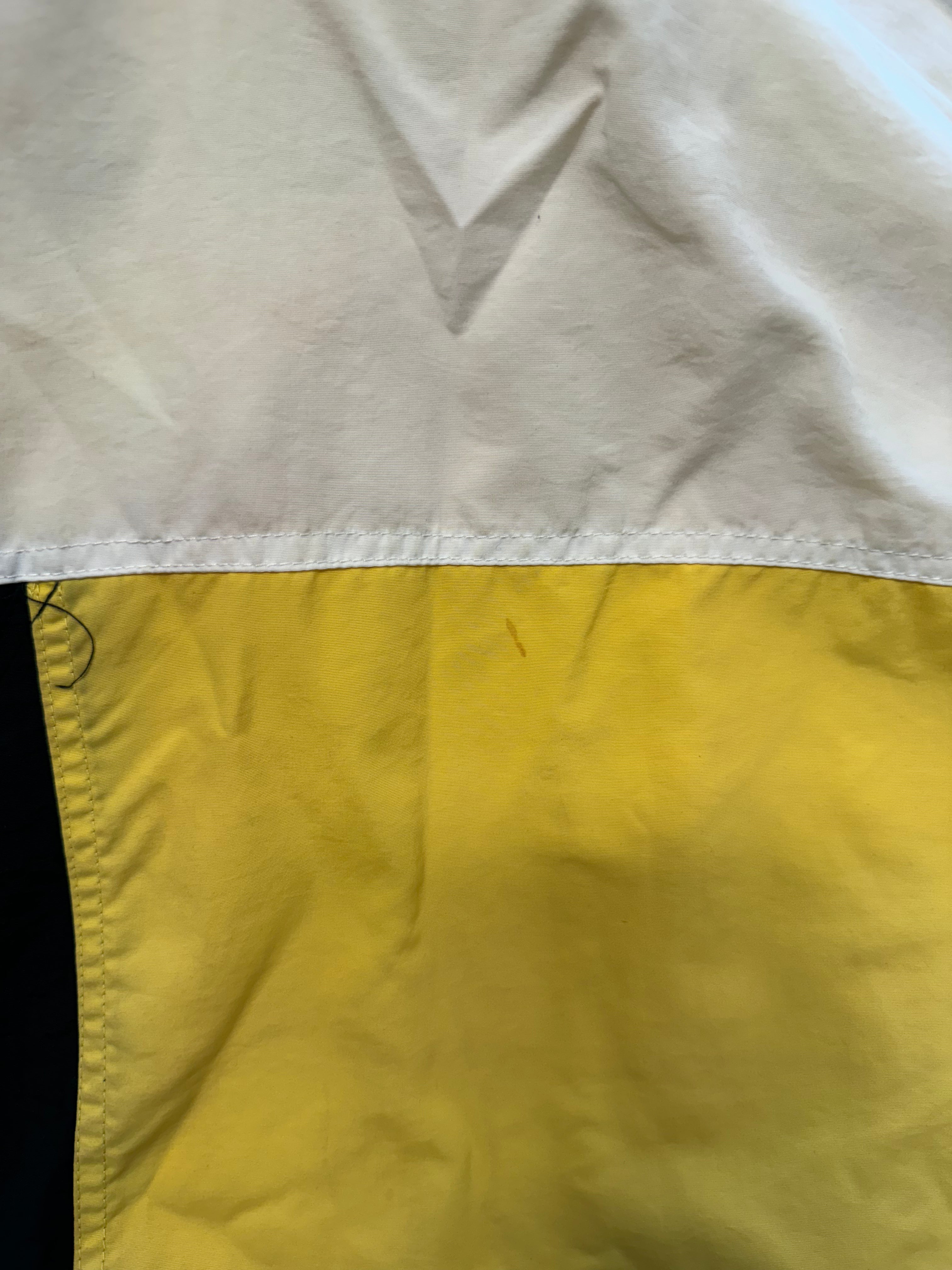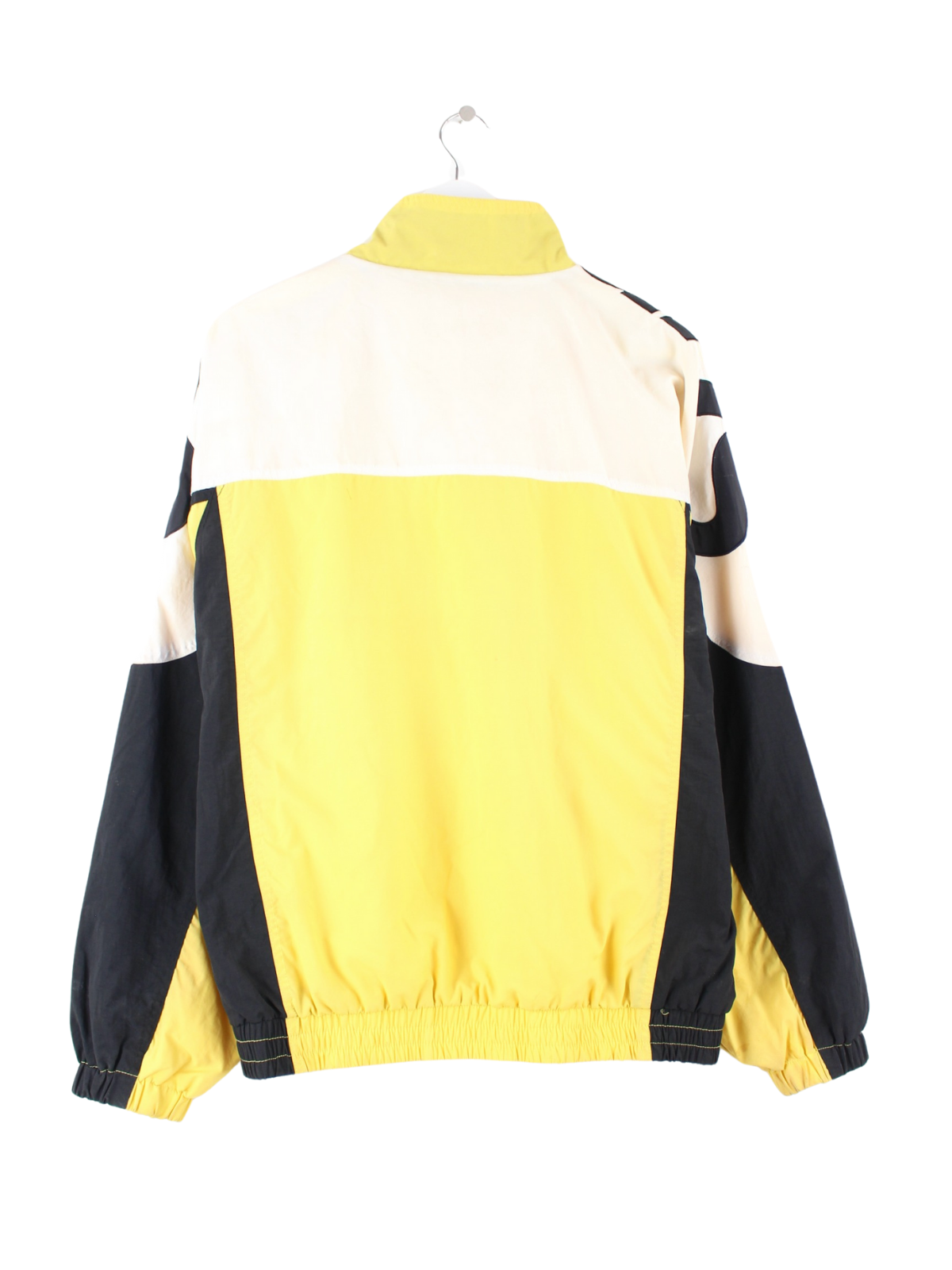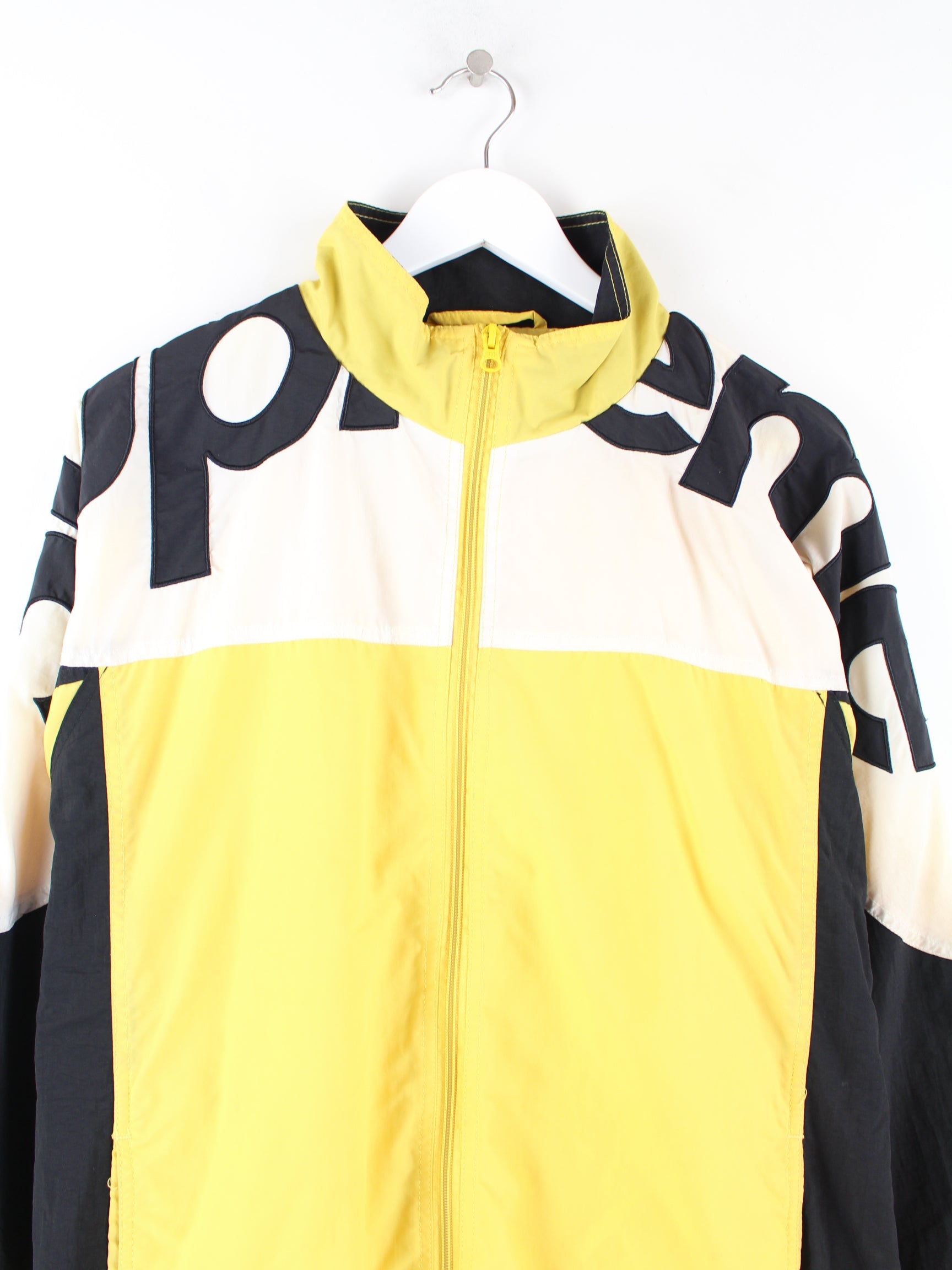 Yellow lightweight jacket with embroidered motifs and zipper from the brand Supreme in size L. It is made of synthetic material and is in stock in good condition.