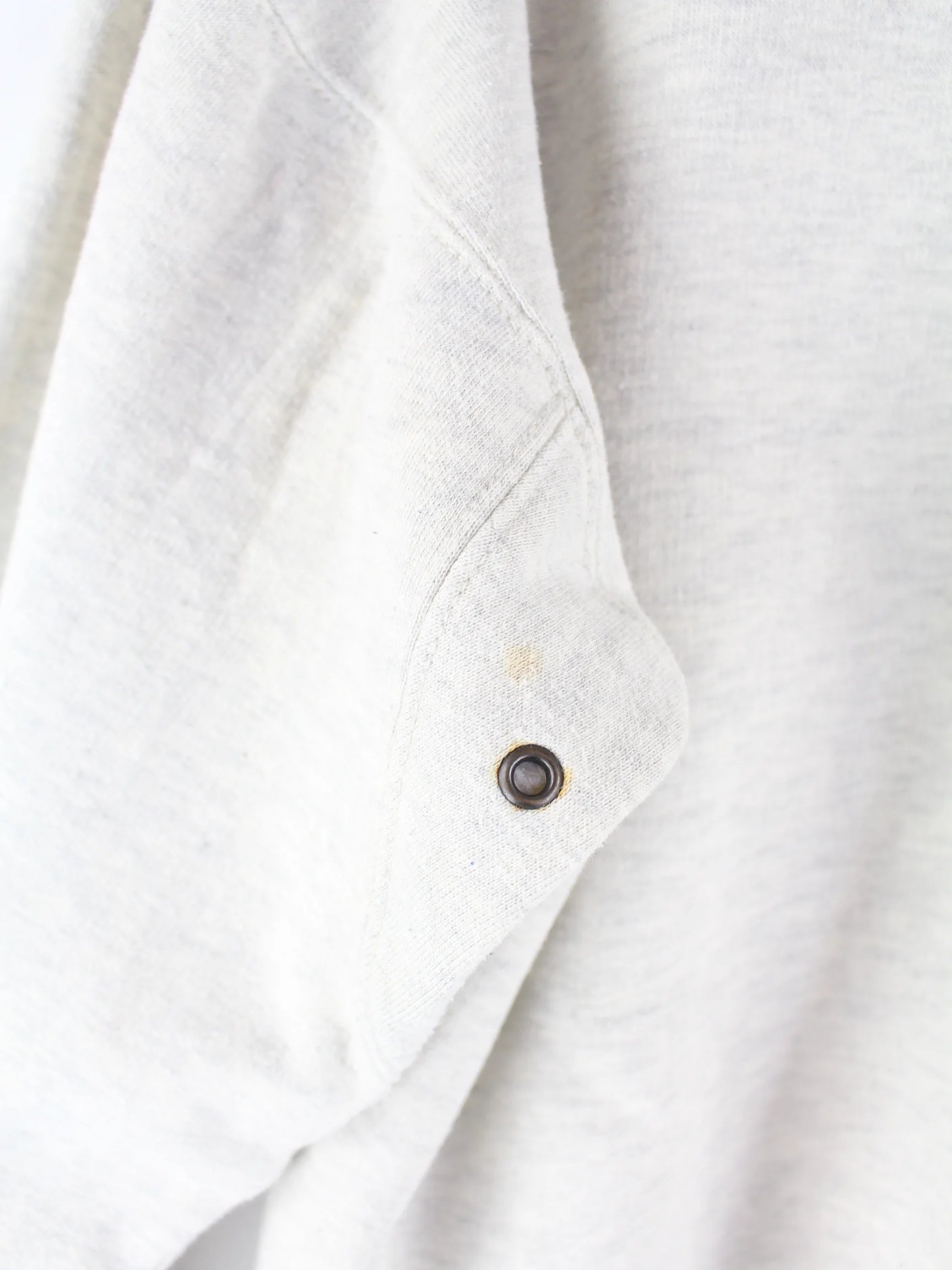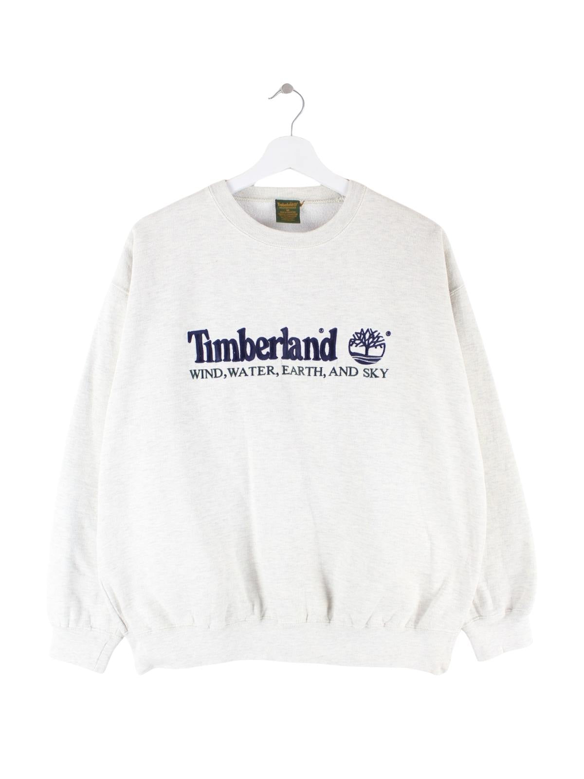 Grauer Sweater mit gestickten Motiven der Marke Timberland in Größe M. Er ist aus einer Baumwollmischung gefertigt und in gutem Zustand vorrätig.