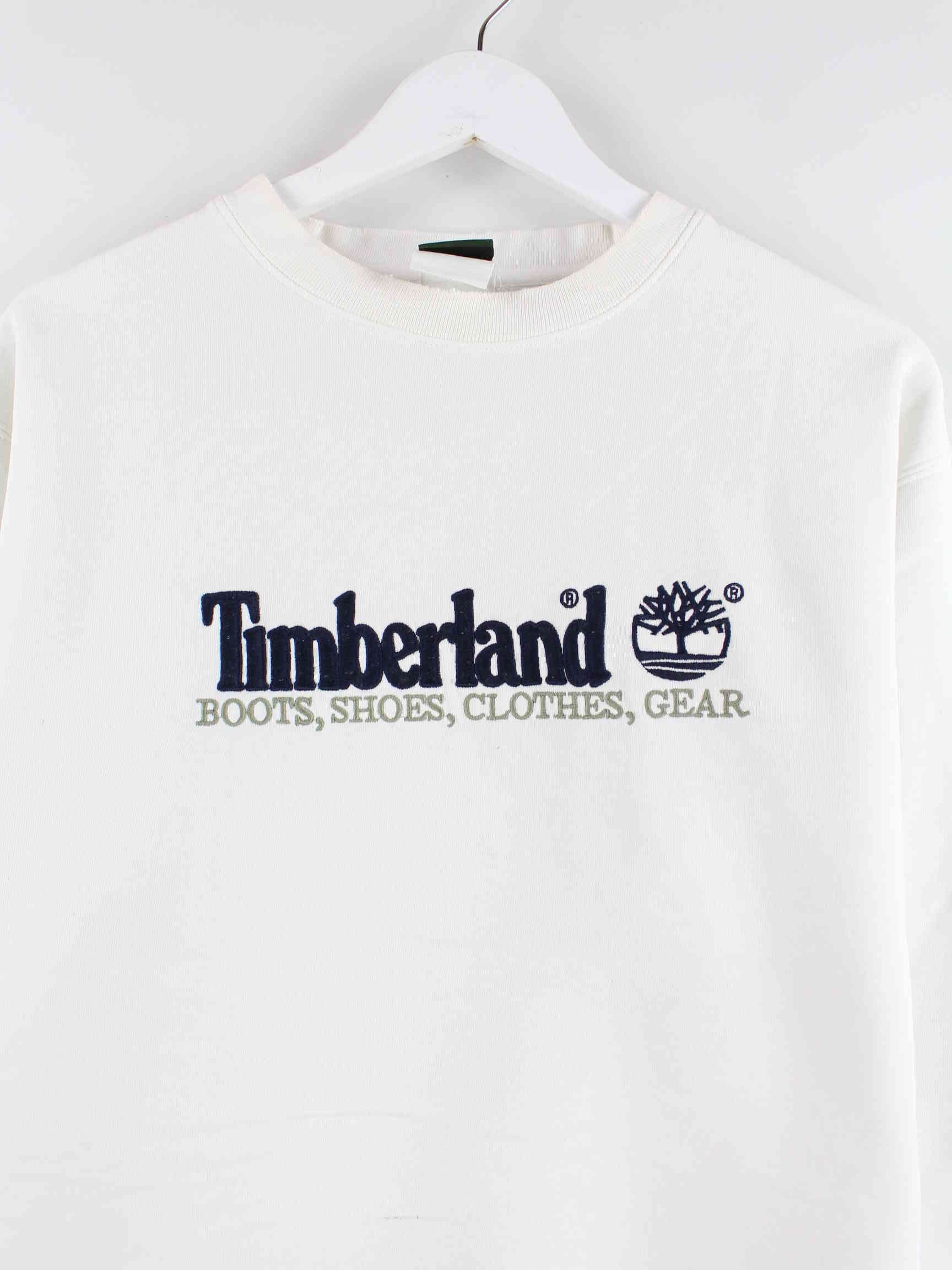 Timberland sweater with embroidered logo in size S from the 90s. It is made from a cotton blend and is available in white.