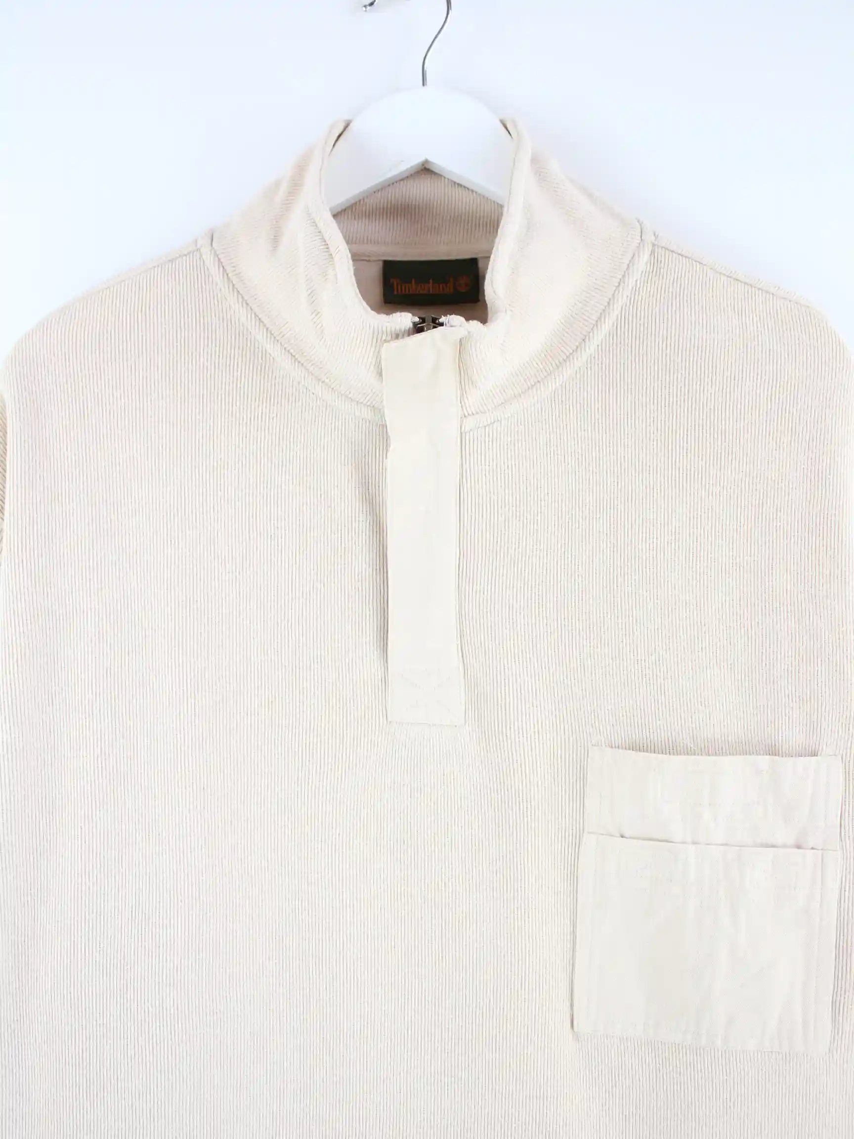 Sweater von Timberland mit halbem Reißverschluß in Größe XXL. Er ist aus einer Baumwollmischung hergestellt und in Beige bei uns vorrätig.