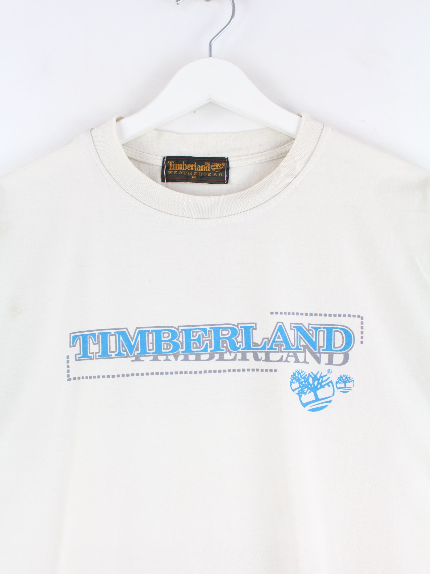Beige T-shirt from the brand Timberland in size M. It is made of cotton. We would describe the condition as 'fine' (see pictures). With a beautiful vintage print.