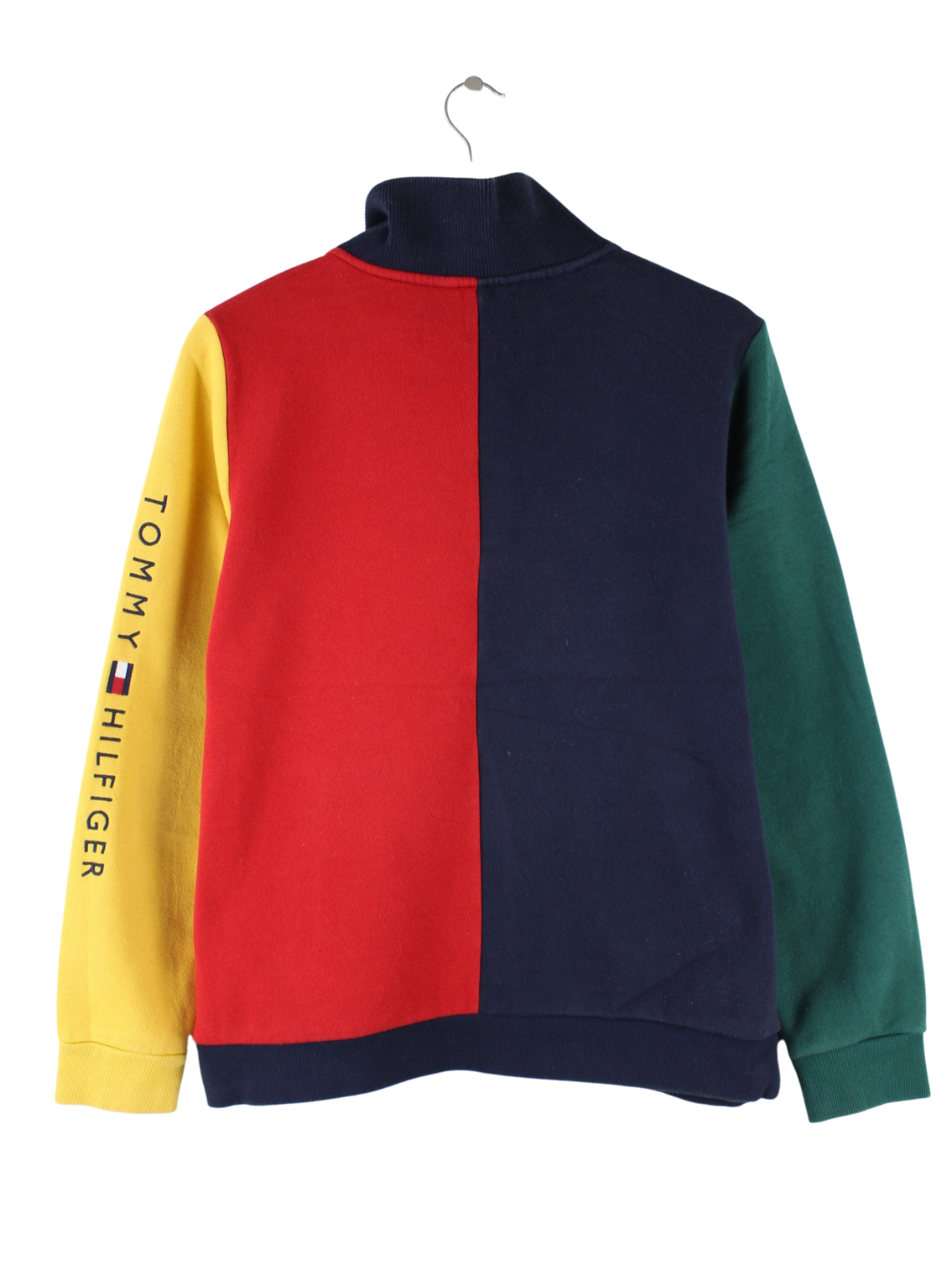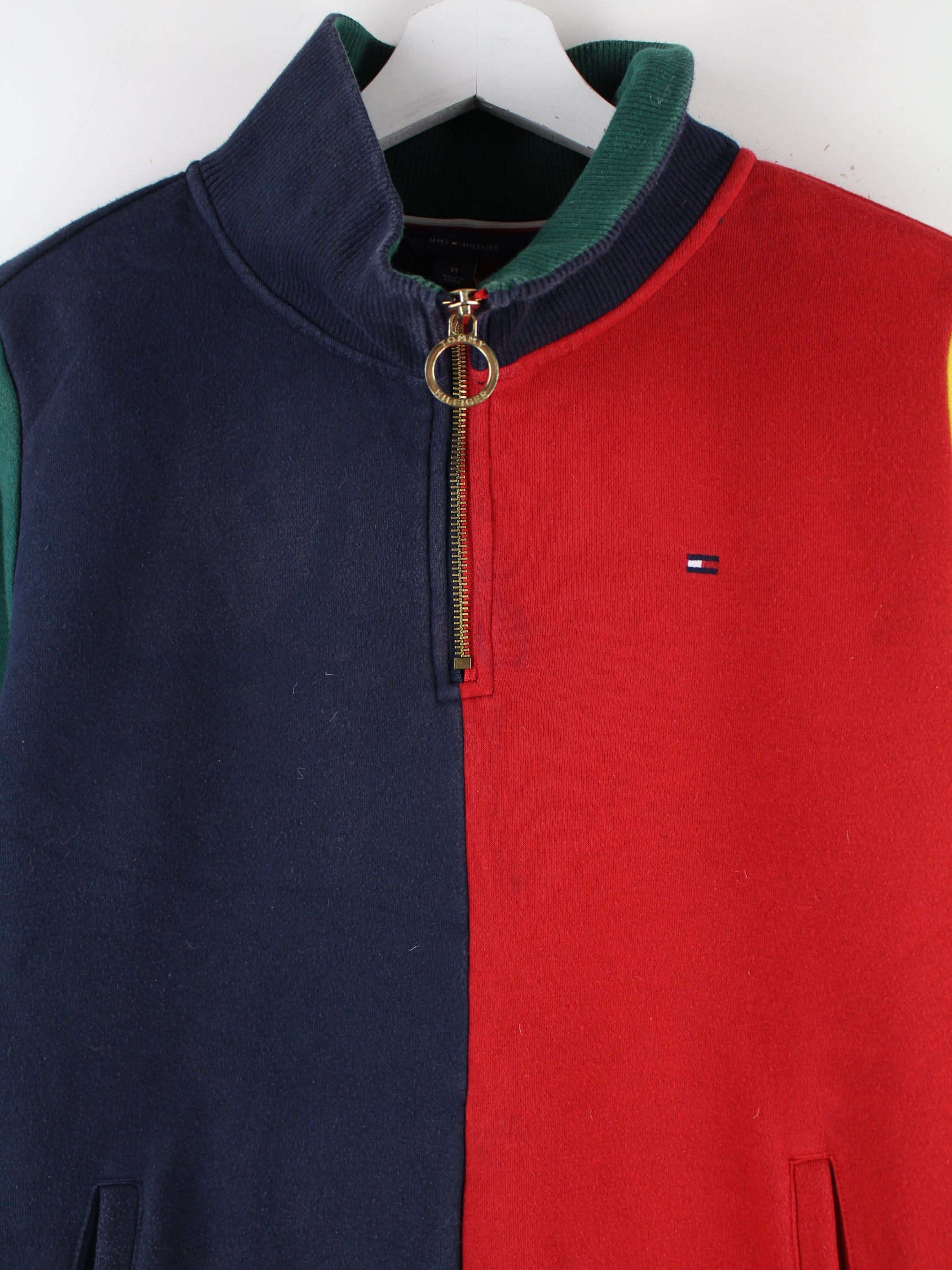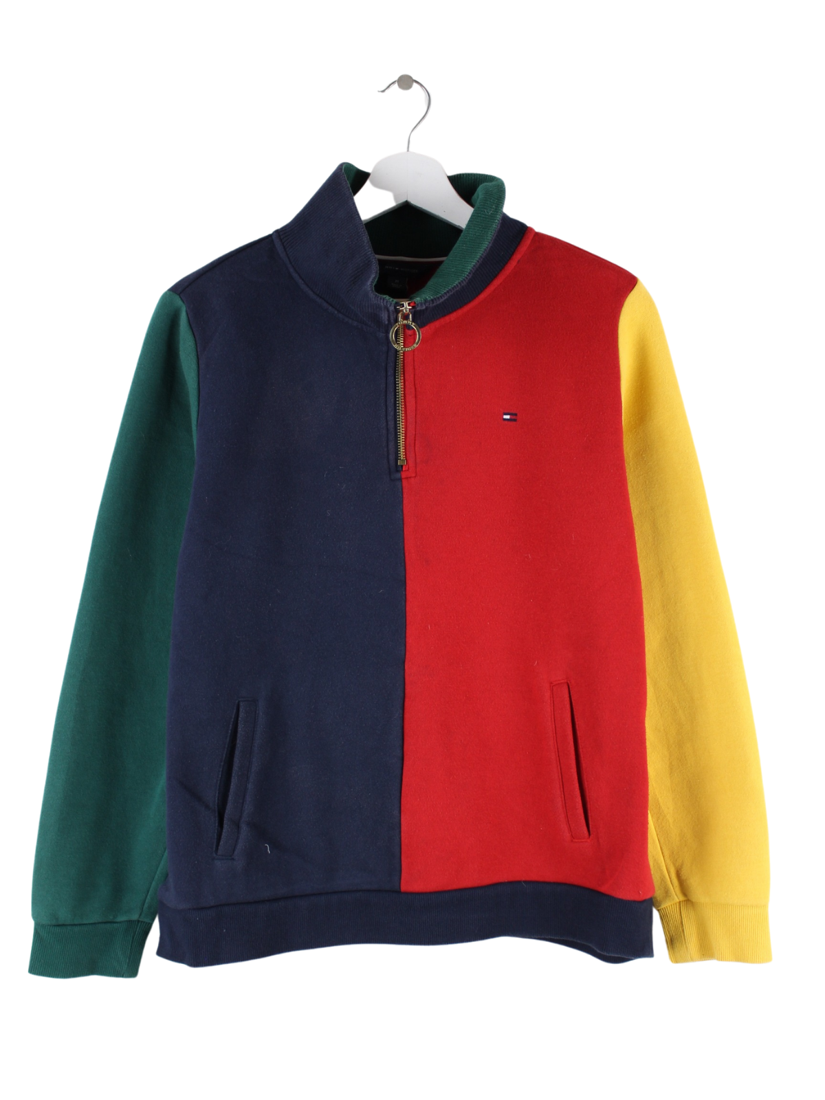 Mehrfarbiger Sweater mit halbem Reißverschluß der Marke Tommy Hilfiger in Größe M. Er ist aus einer Baumwollmischung produziert und in sehr gutem Zustand im Bestand.