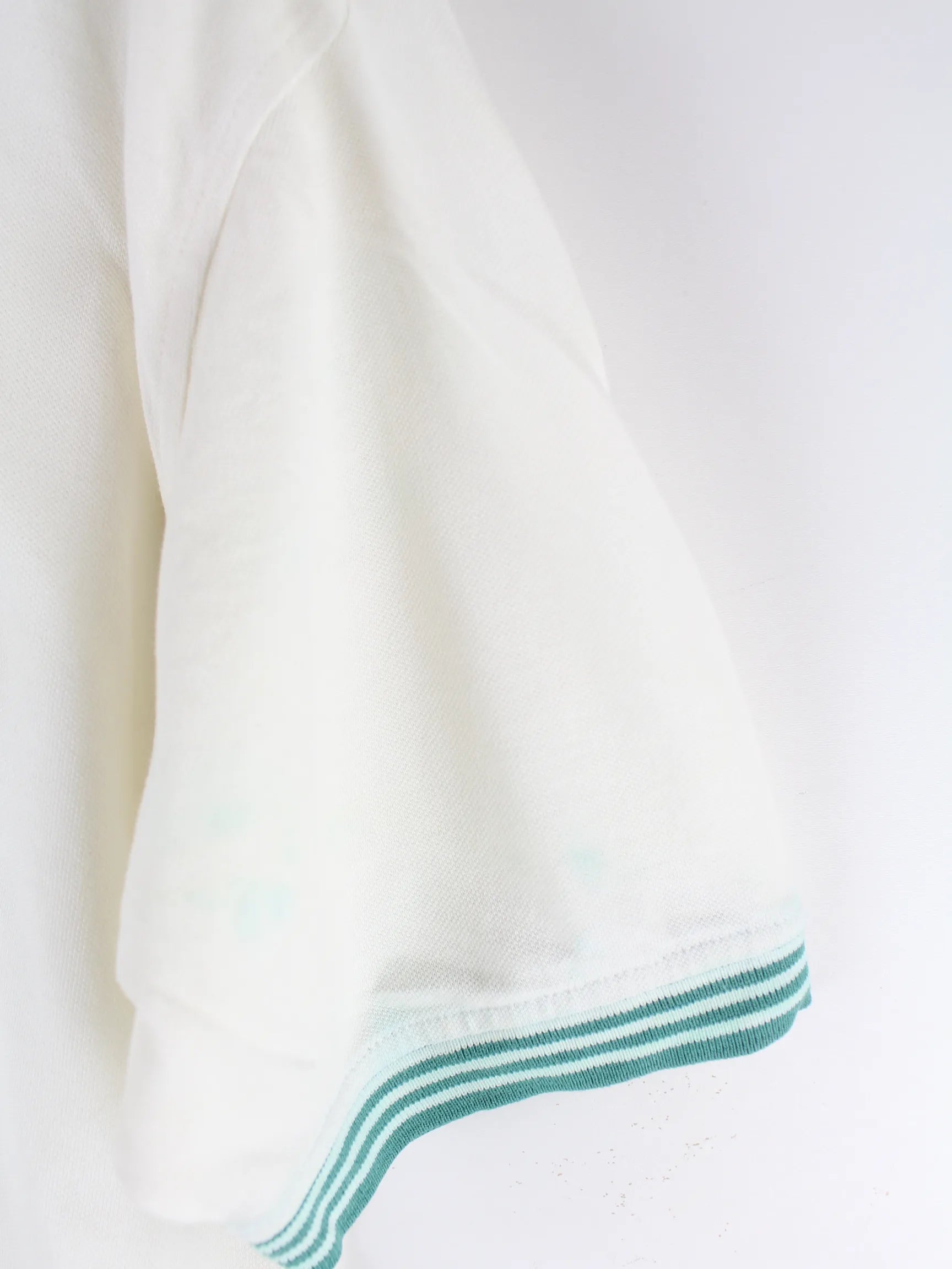 Weißes Poloshirt der Marke Tommy Hilfiger aus den 90'ern in Größe L. Es ist aus Baumwolle hergestellt. Den Zustand würden wir als 'In Ordnung' bezeichnen (vergl. Bilder).