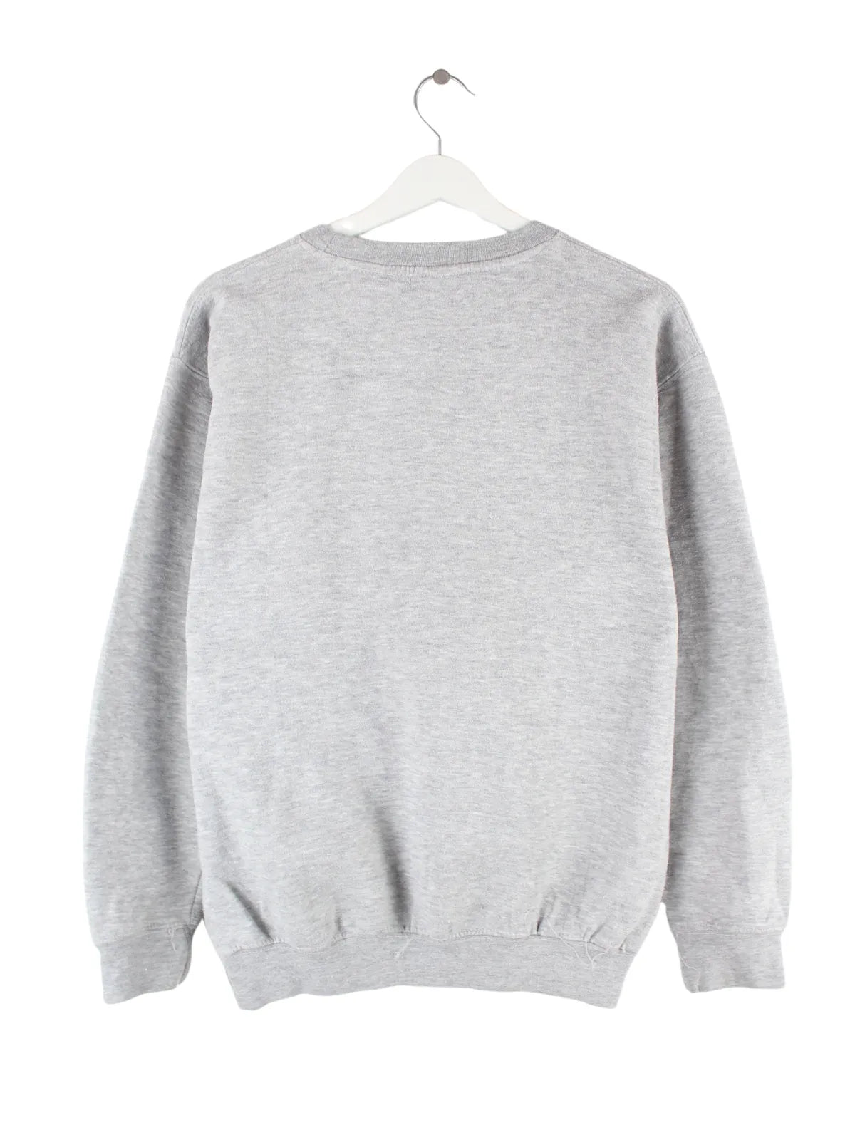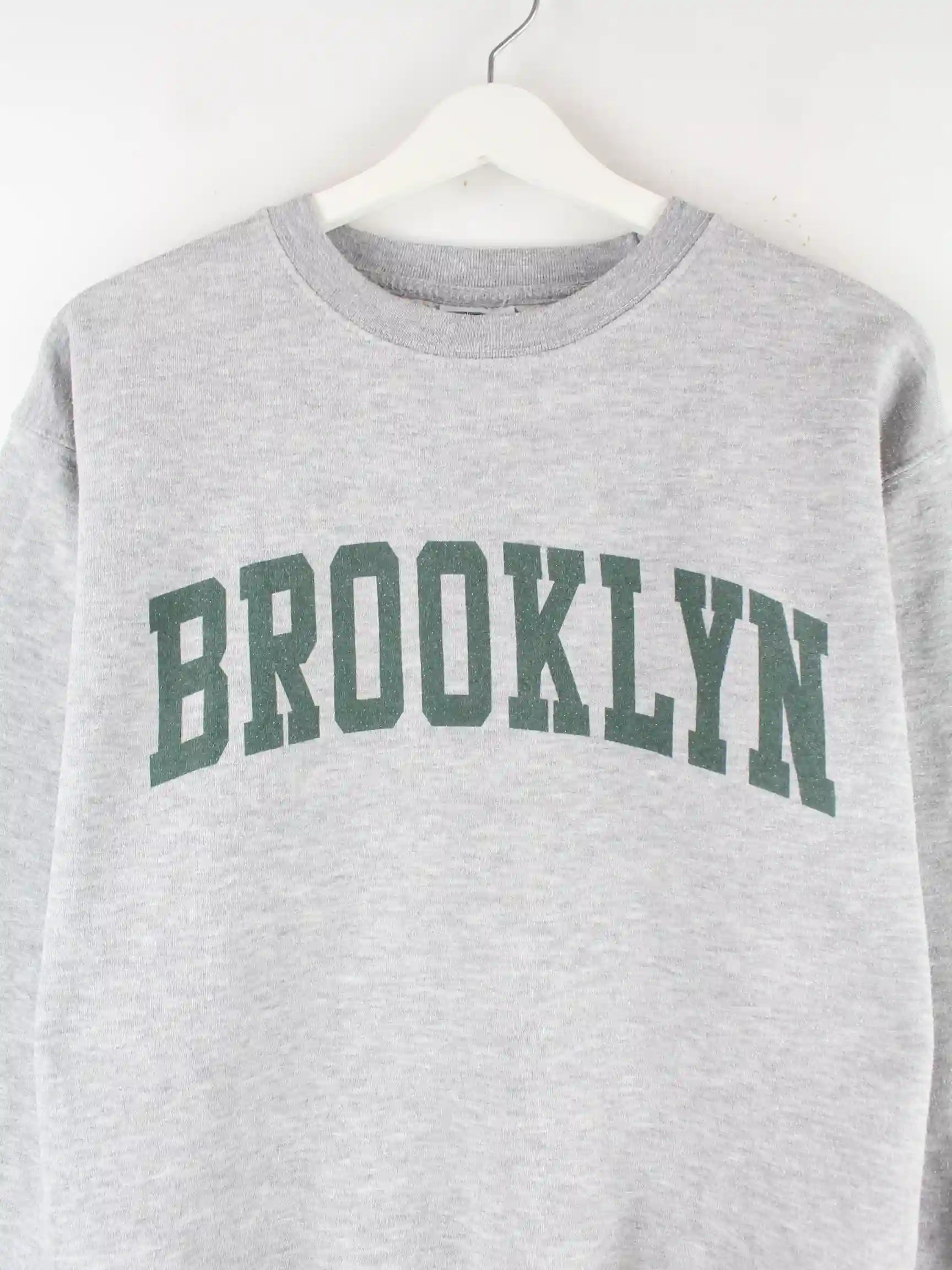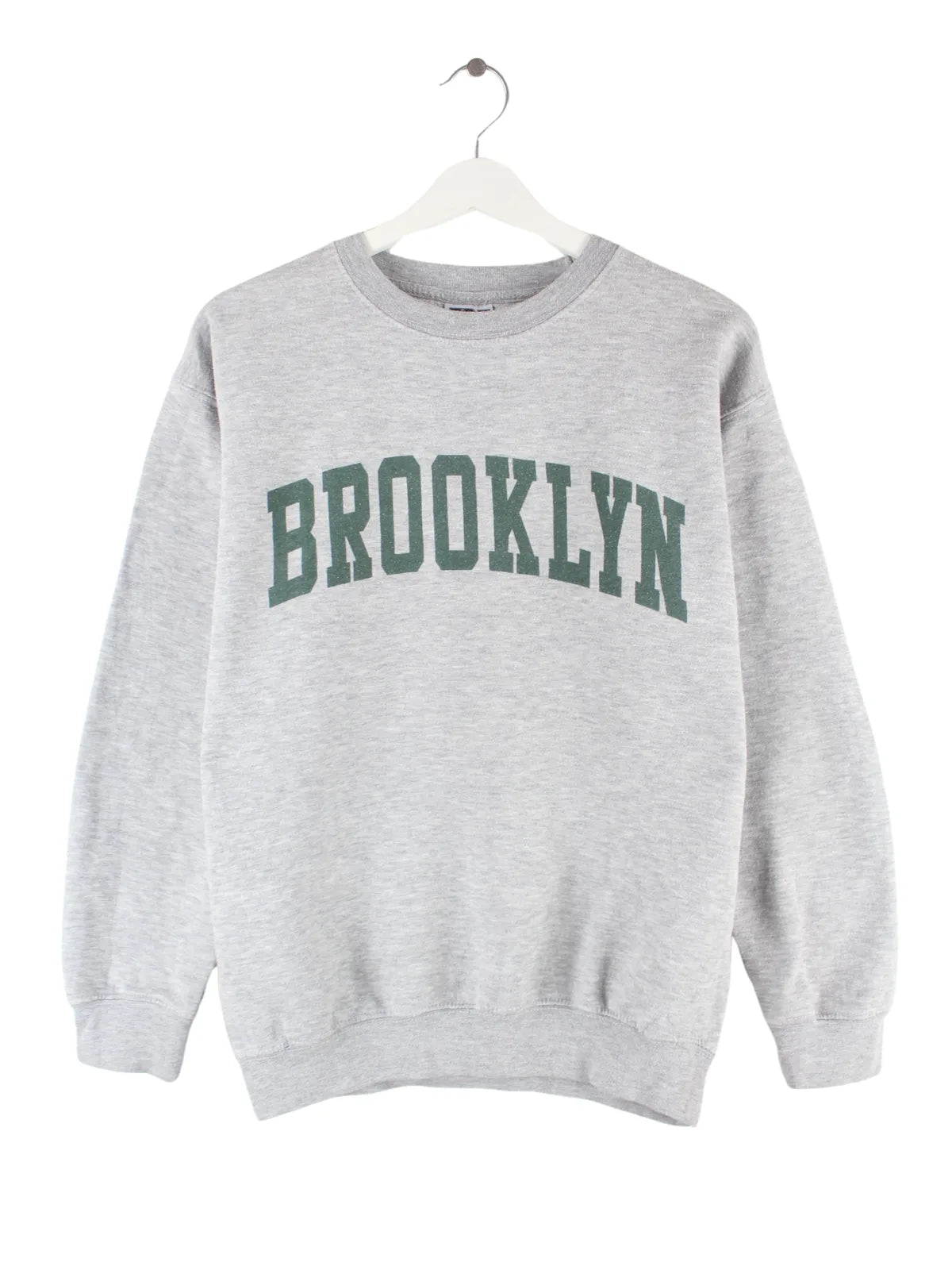 Grauer Vintage Sweater in Größe S. Er ist aus einer Baumwollmischung produziert und in sehr gutem Zustand bei uns vorrätig. Mit schickem Brooklyn Print.