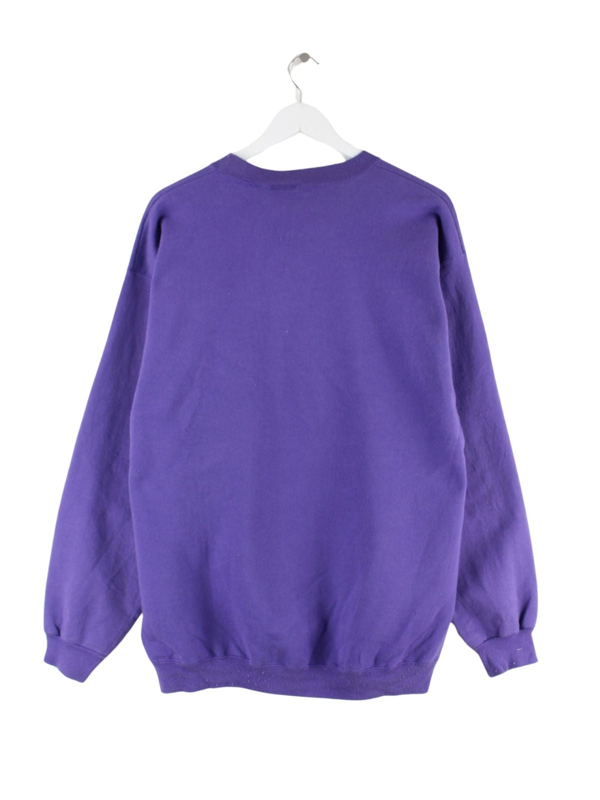 Vintage Sweater mit gesticktem Logo in Größe XL. Er ist aus einer Baumwollmischung hergestellt und in Lila lieferbar.