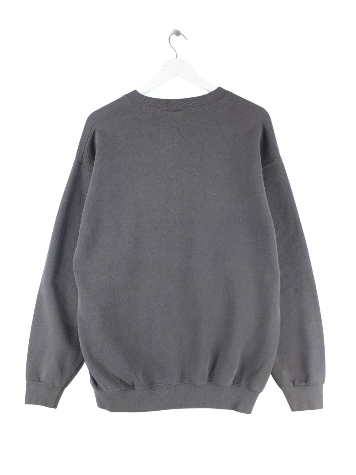 Vintage Sweater mit Stick in Größe L. Er ist aus einer Baumwollmischung gefertigt und in Grau zu haben.