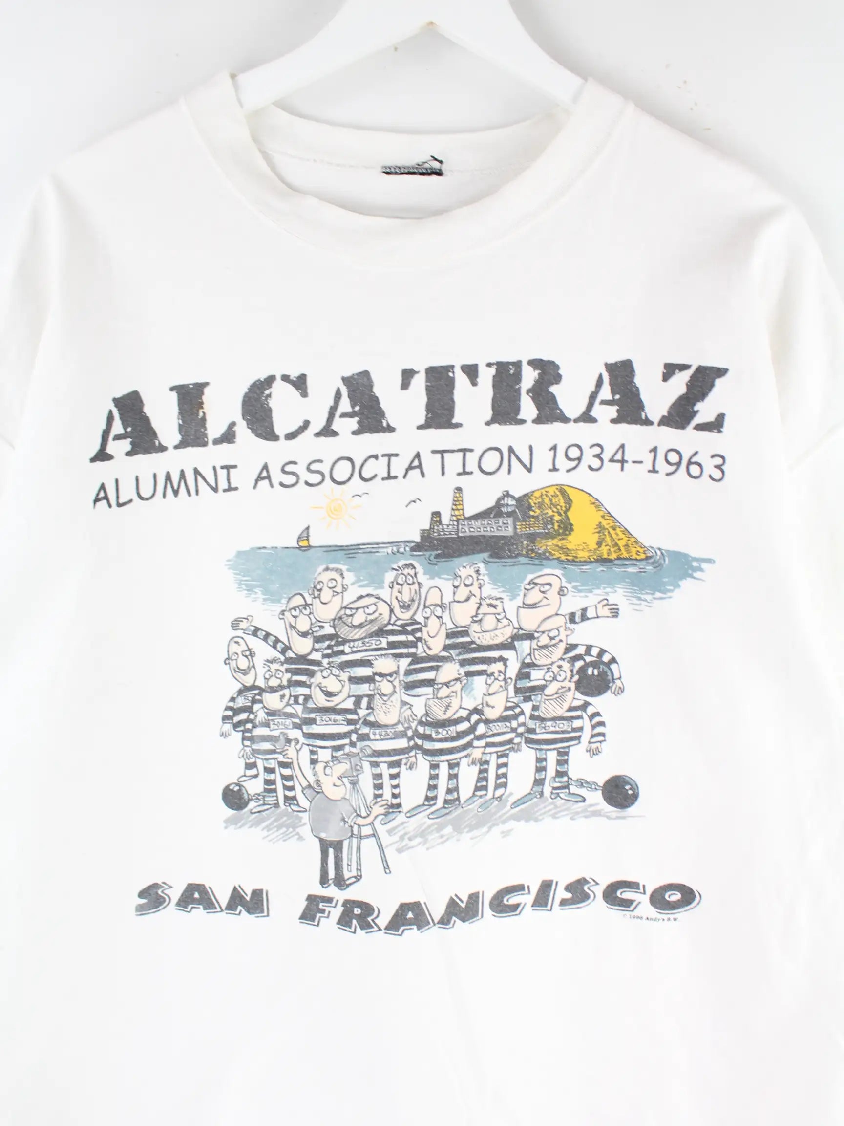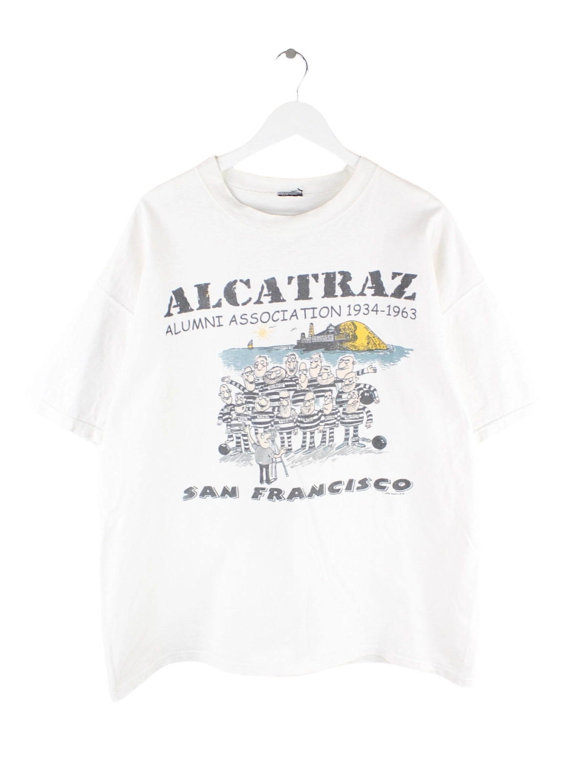Weißes Vintage T-Shirt in Größe XXL. Es ist aus einer Baumwollmischung gemacht und in sehr gutem Zustand lieferbar. Mit seltenem Alcatraz Print.