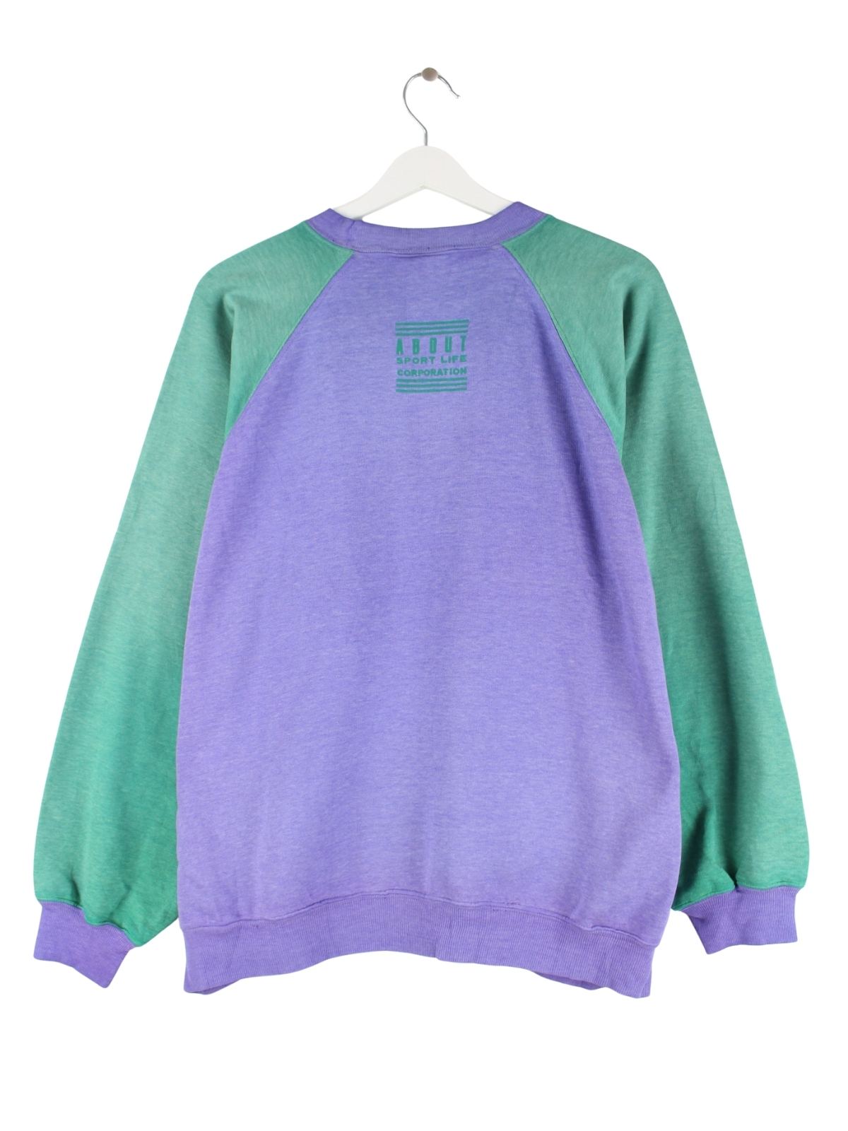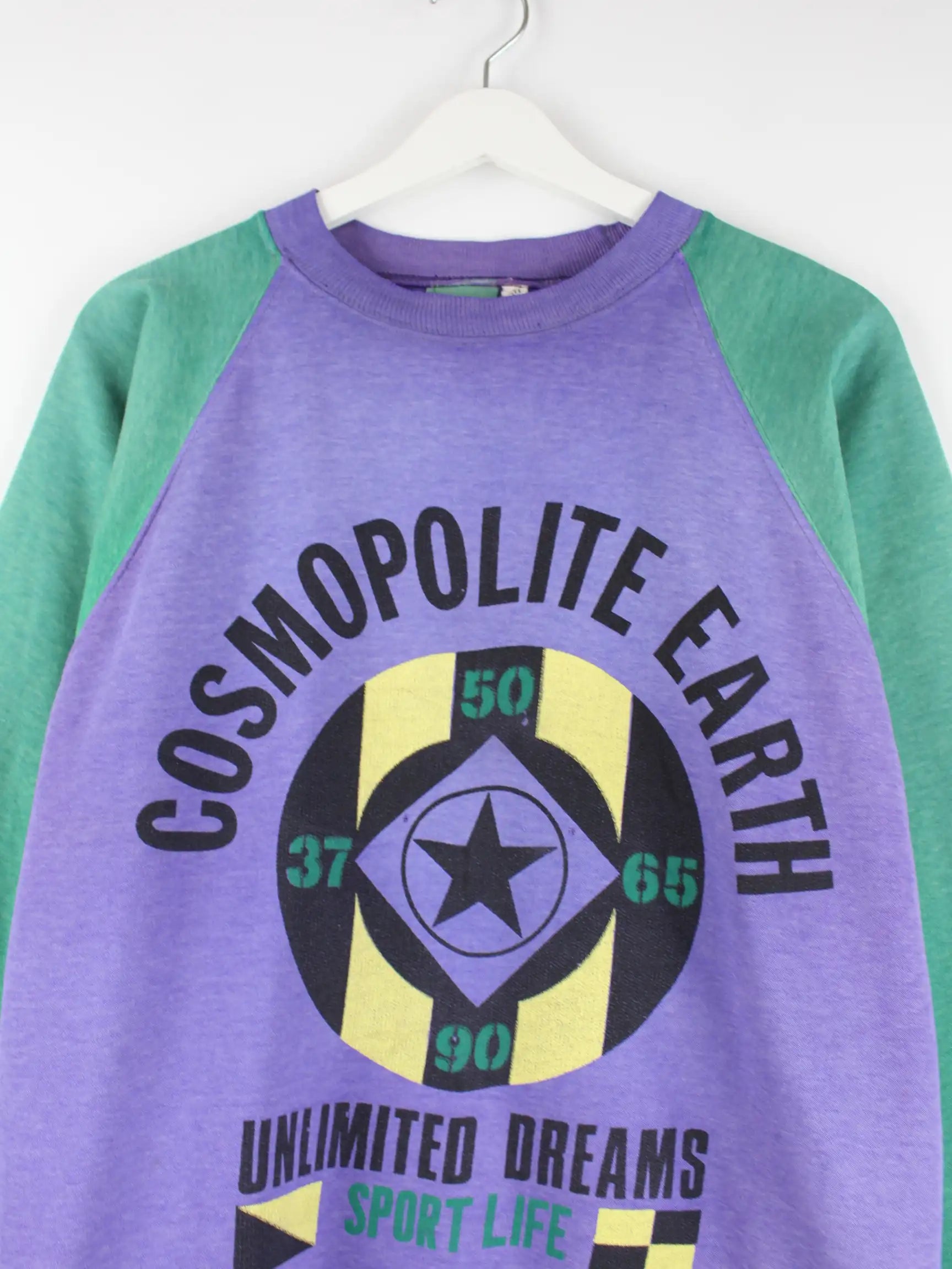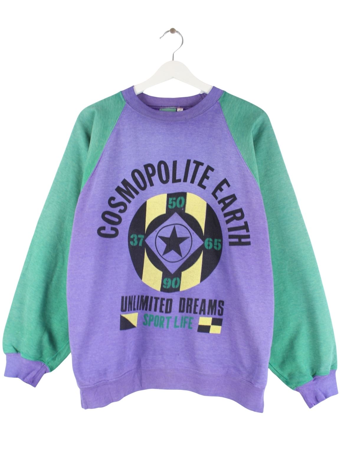 Vintage Sweater in Größe M aus den 80'ern. Er ist aus einer Baumwollmischung hergestellt und in Lila zu bekommen. Mit schönem Cosmopolite Print.