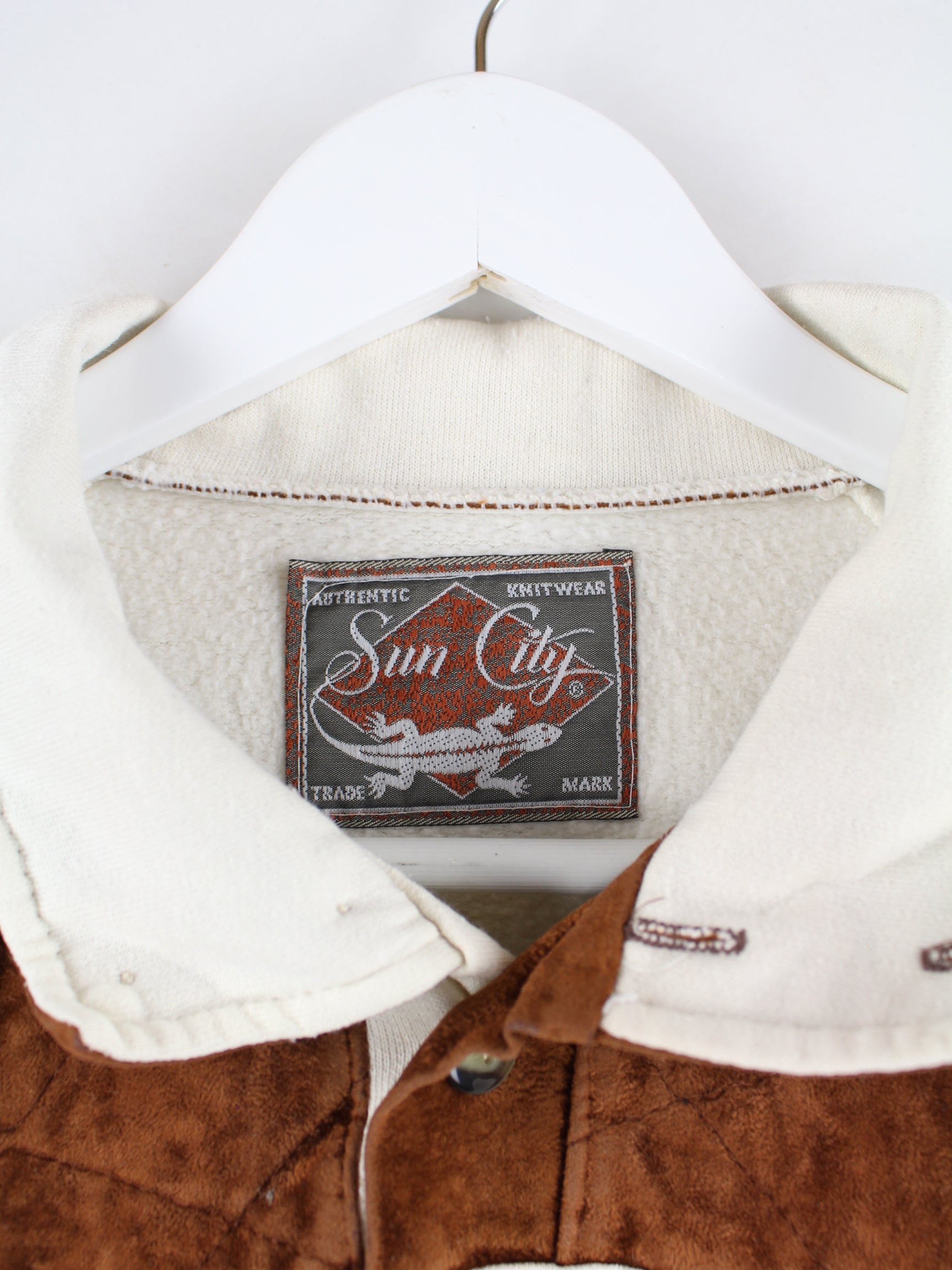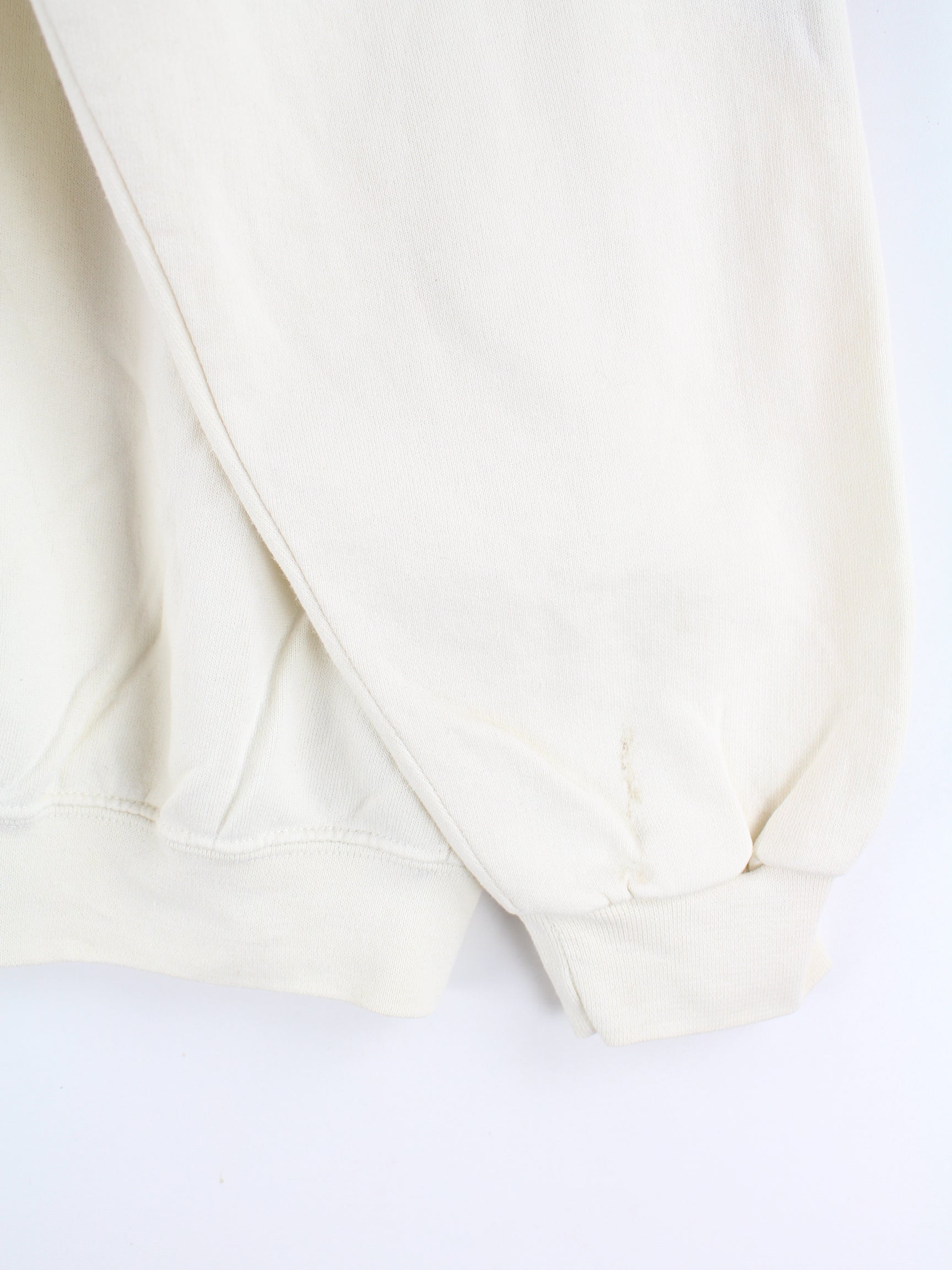 Weißer Vintage Sweater mit gesticktem Logo aus den 80'ern in Größe M. Er ist aus einer Baumwollmischung und in gutem Zustand bei uns zu bekommen.