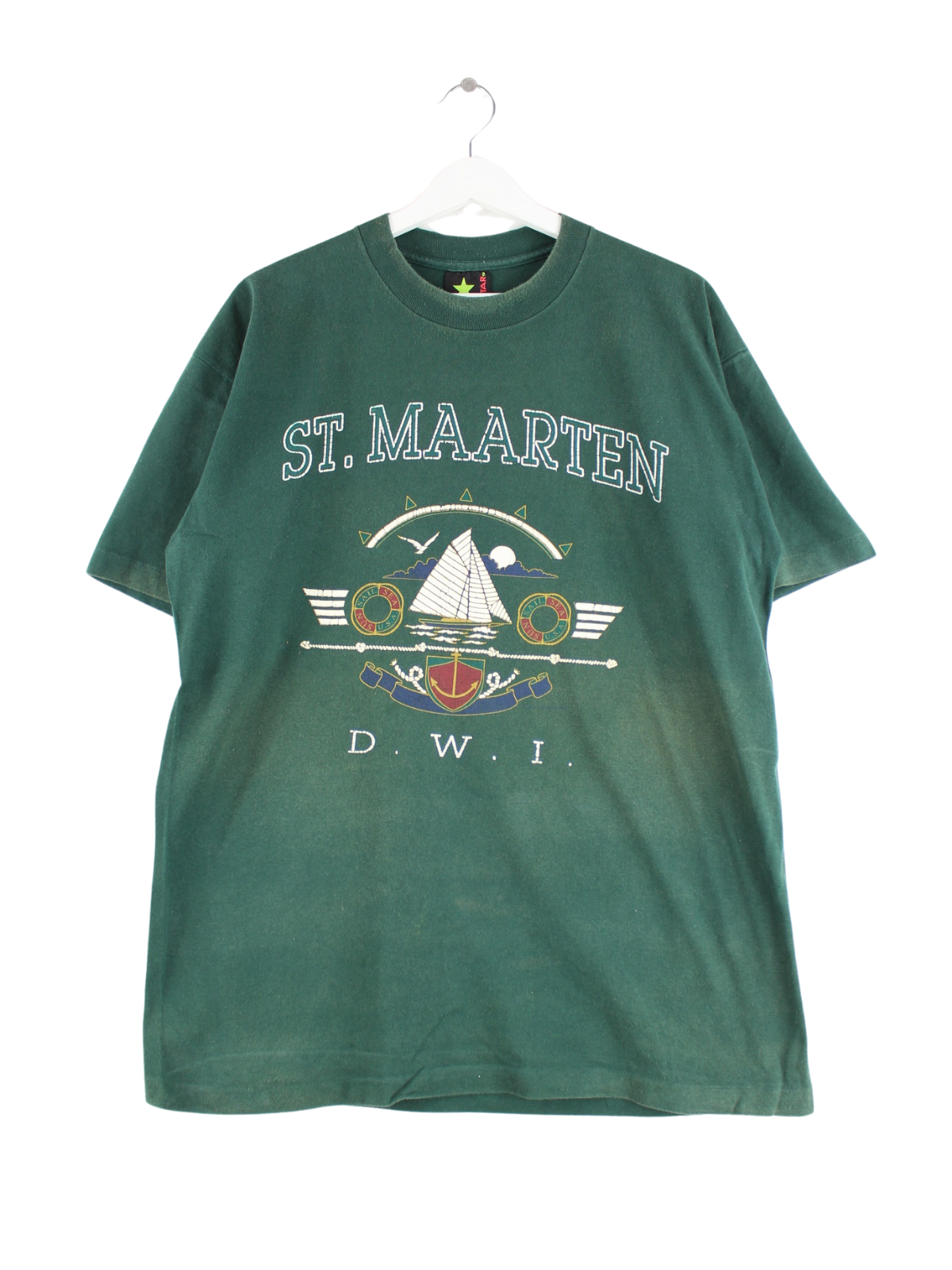 Vintage T-shirt in size L from the 80's. It is made of cotton and comes in green. With a chic 80's print.