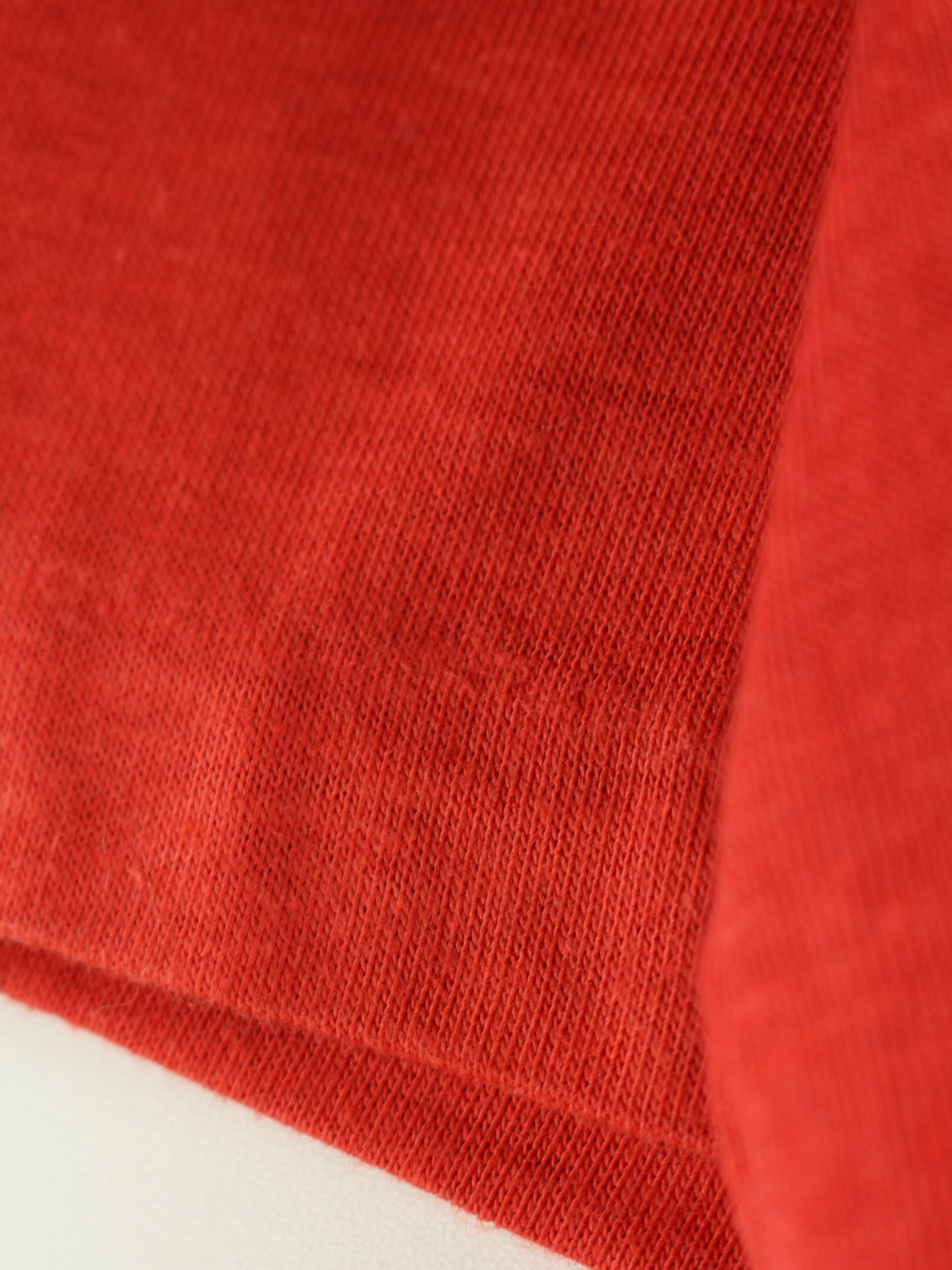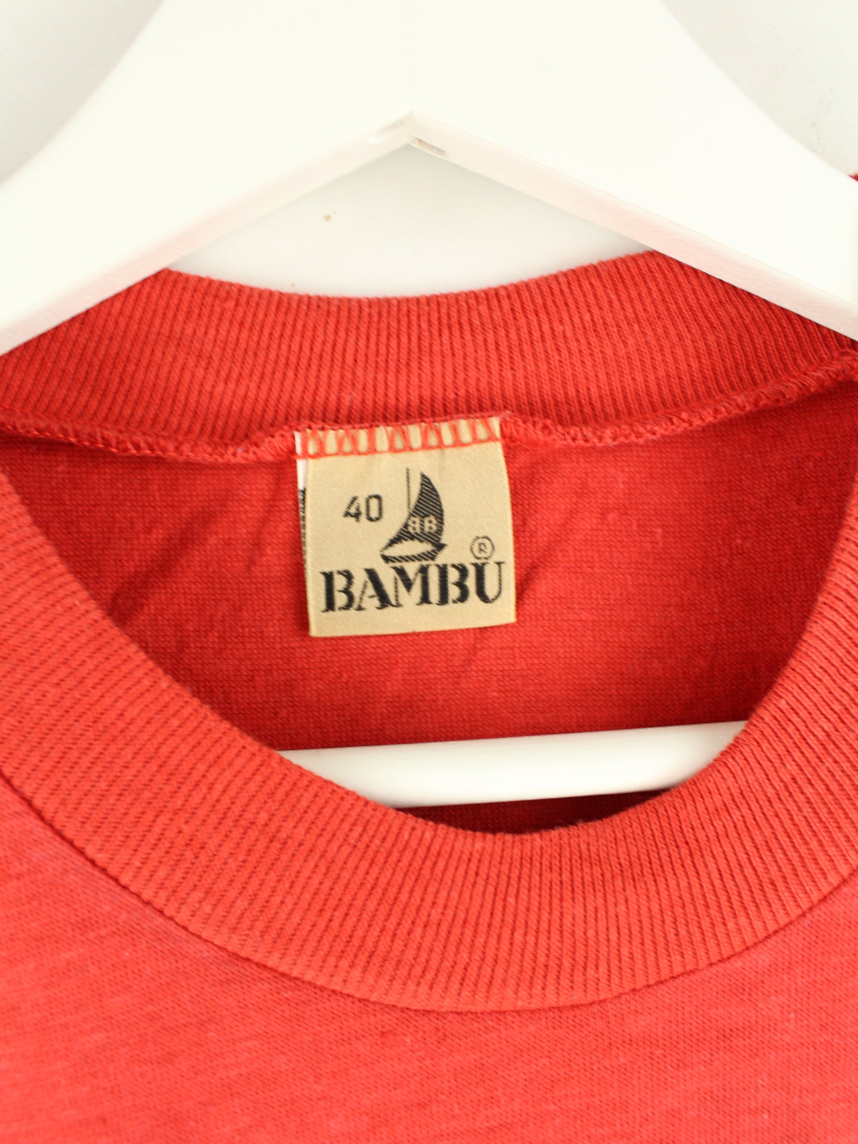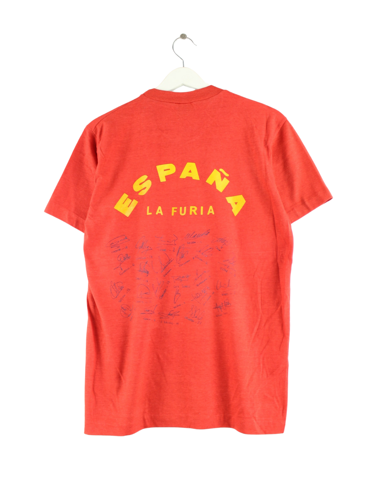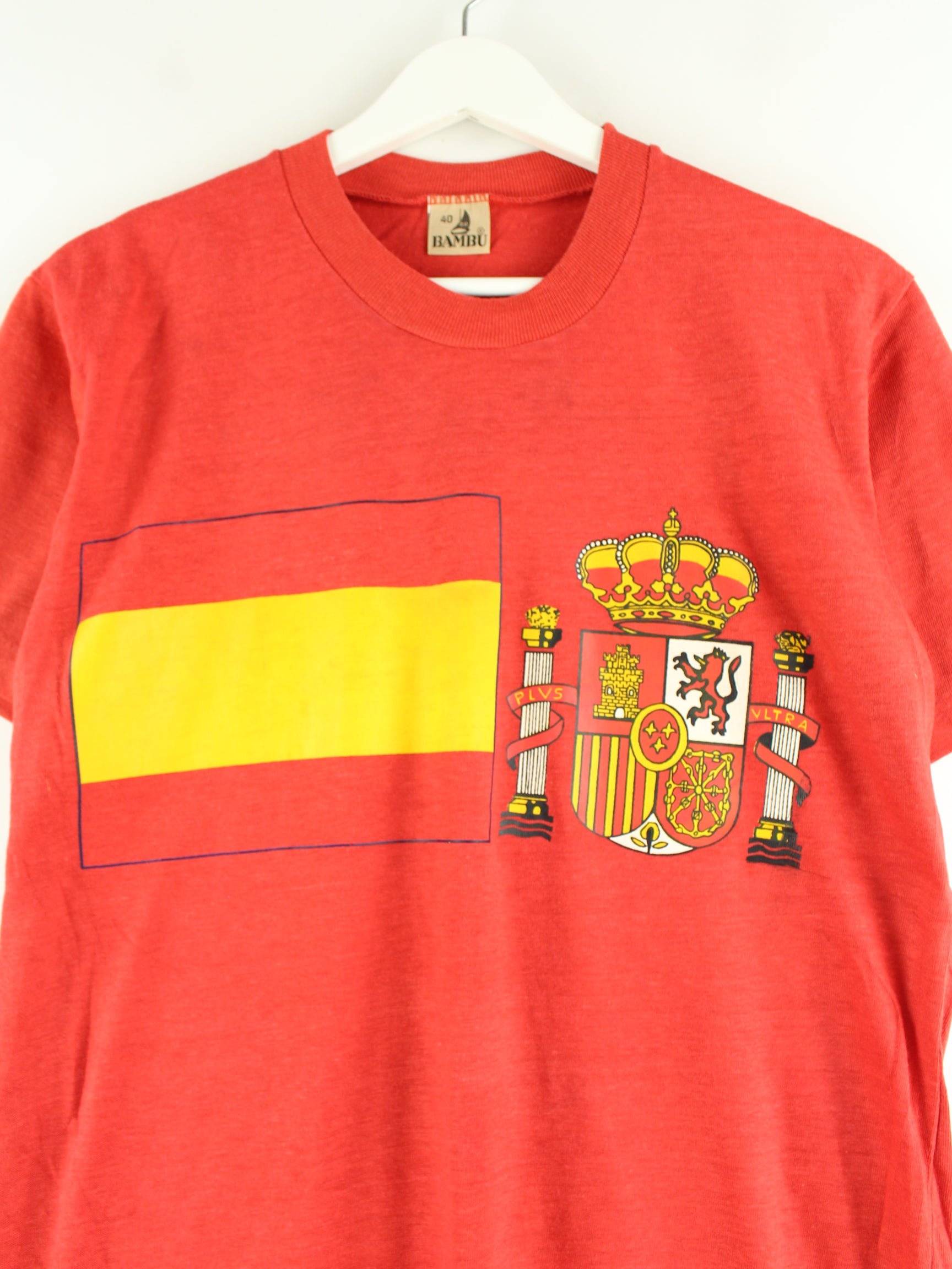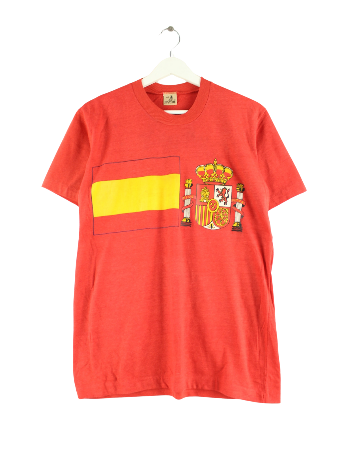 Red vintage T-shirt from the 80's in size S. It is made from a cotton blend and is in stock in very good condition. With a chic Espana print.