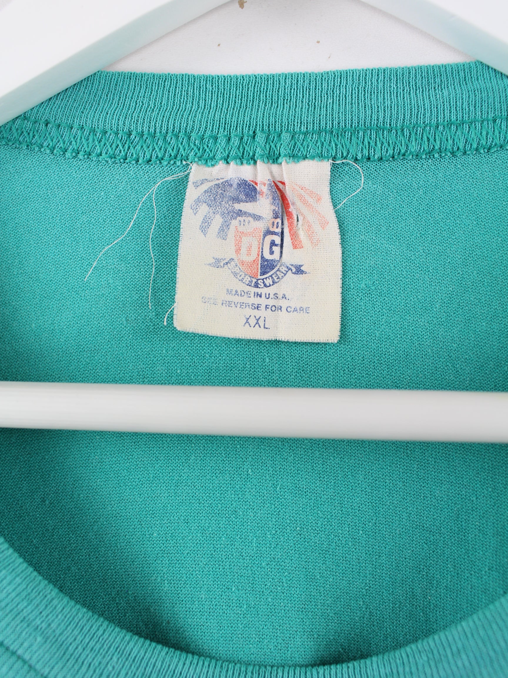 Türkisfarbenes Vintage T-Shirt aus den 90'ern in Größe L. Es ist aus Baumwolle produziert und in sehr gutem Zustand auf Lager. Mit schickem Animal Print.