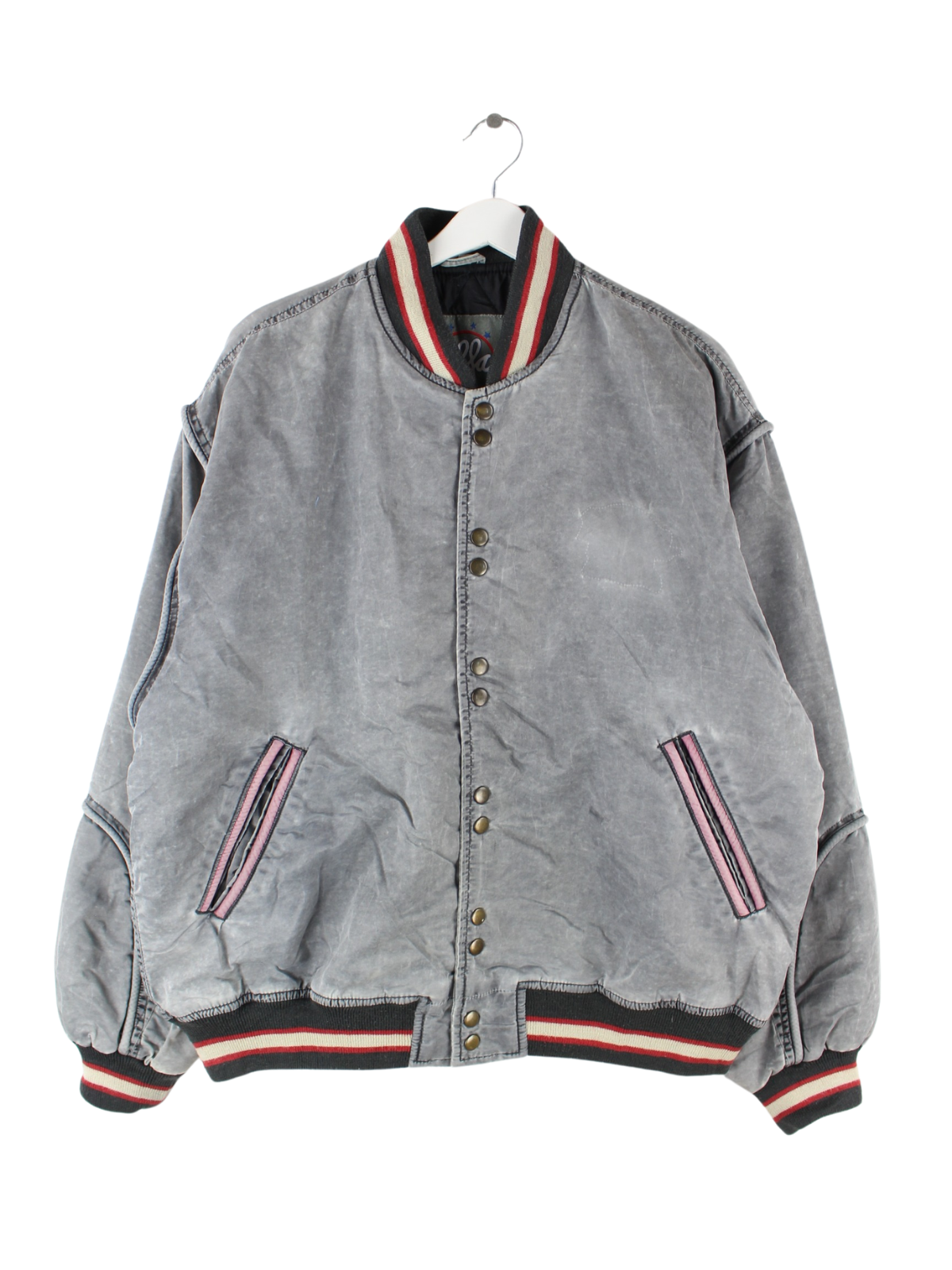 Graue Vintage Jacke aus den 90'ern in Größe L. Sie ist aus Synthetik und in gutem Zustand zu bekommen.