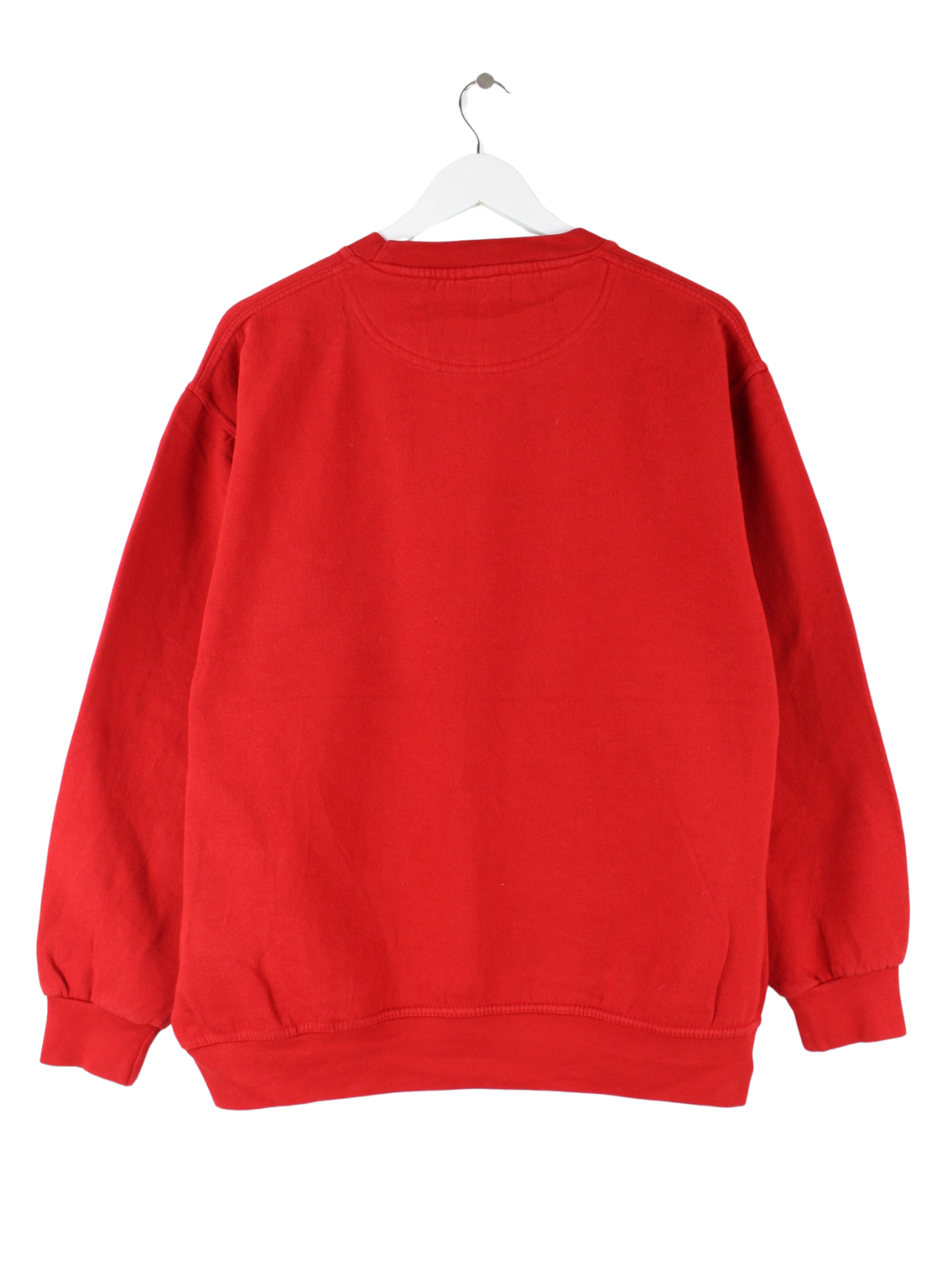 Roter Vintage Sweater mit Stickereien aus den 90'ern in Größe M. Er ist aus einer Baumwollmischung gemacht und in sehr gutem Zustand bei uns zu bekommen.