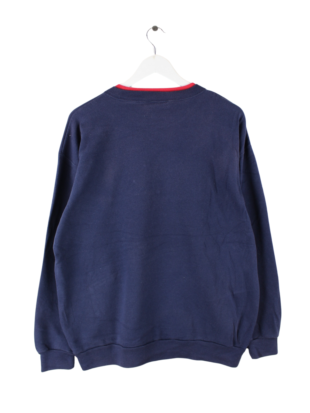 Blauer Vintage Sweater mit gestickten Motiven aus den 90'ern in Größe L. Er ist aus einer Baumwollmischung hergestellt und in sehr gutem Zustand im Angebot.