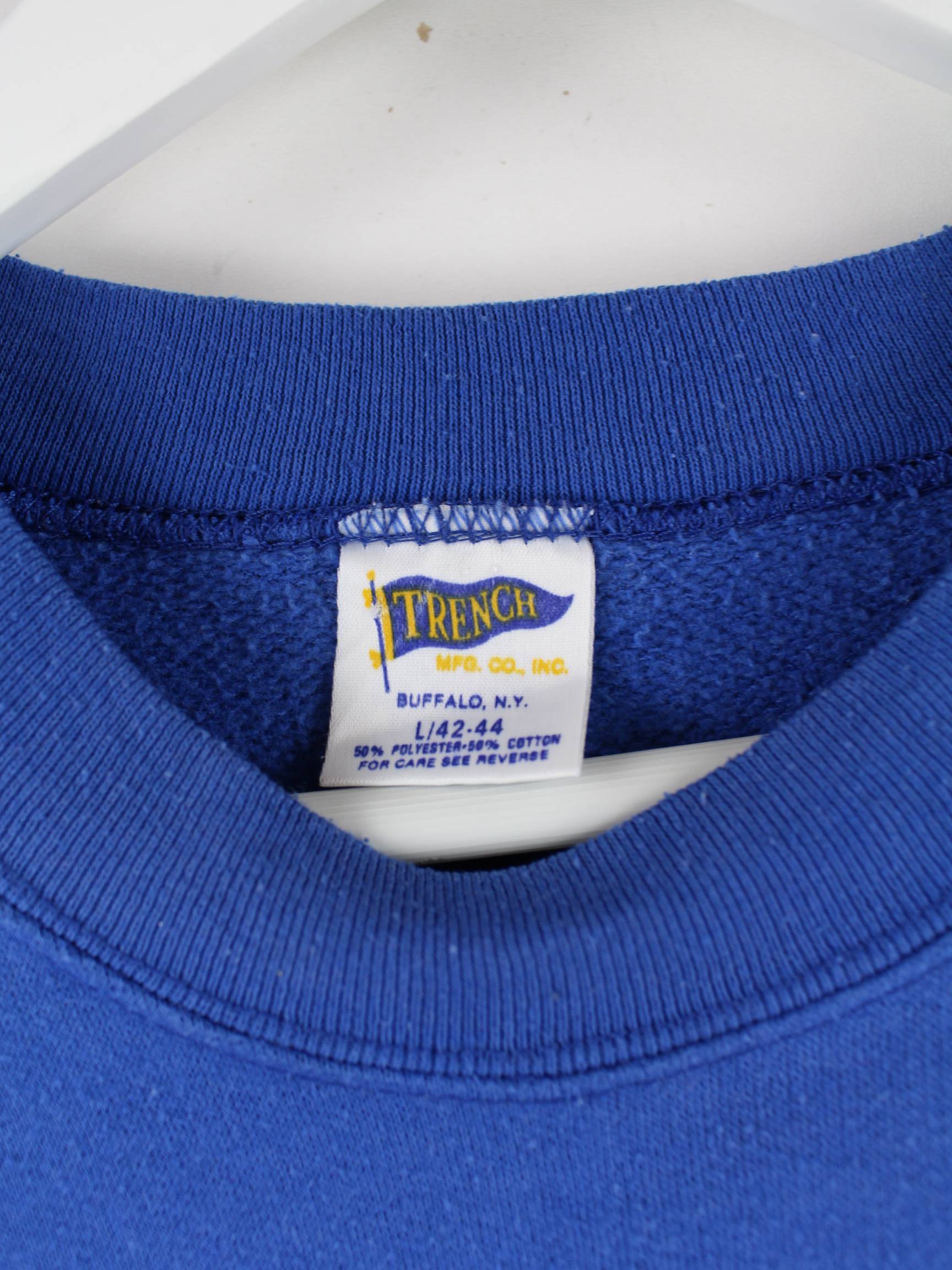 Blauer Vintage Sweater aus den 90'ern in Größe L. Er ist aus einer Baumwollmischung produziert und in sehr gutem Zustand zu haben. Mit chiquem Pistons Print.
