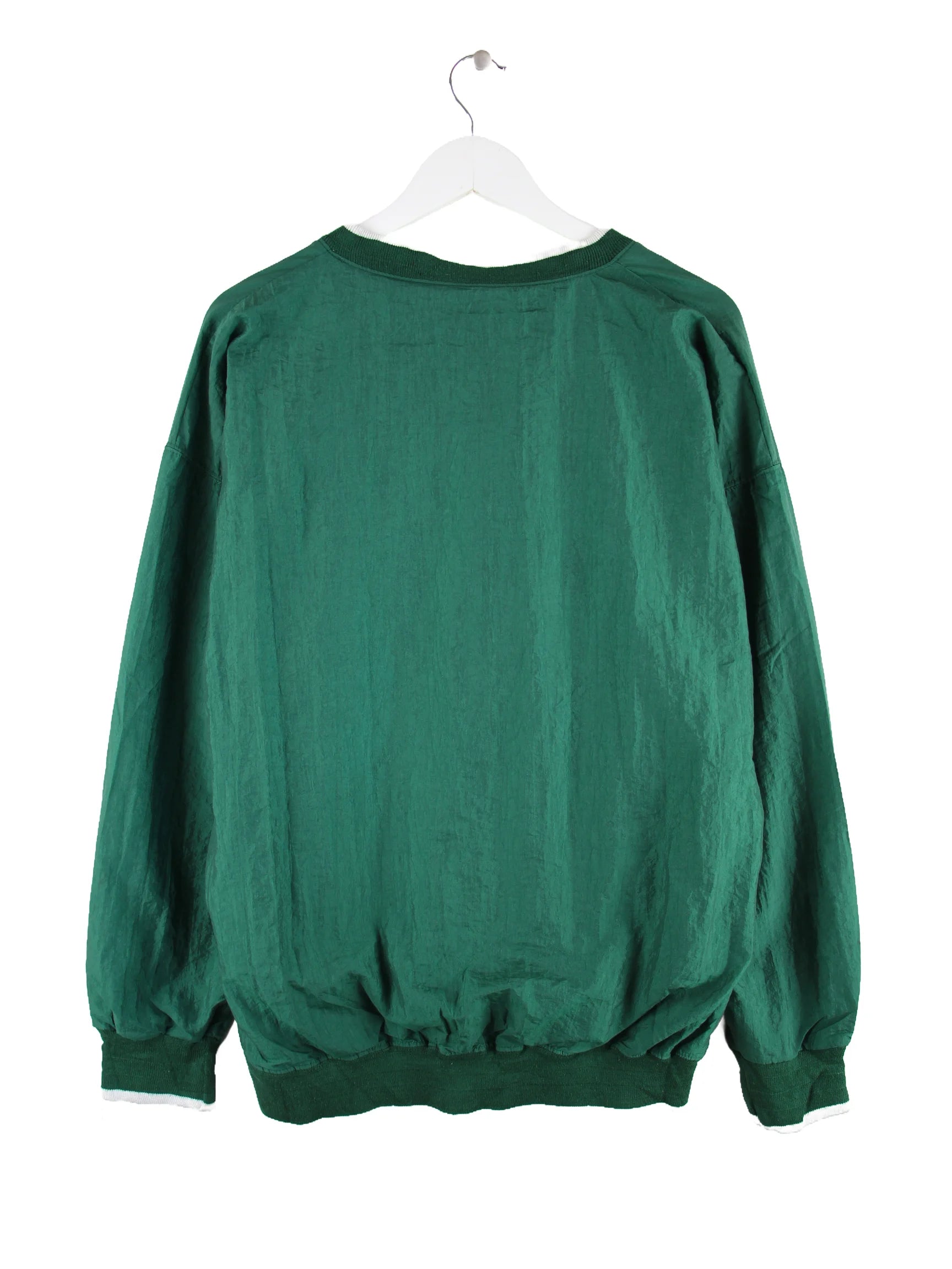 Grüner Vintage Sweater aus den 90'ern in Größe L. Er ist aus Synthetik und in sehr gutem Zustand vorrätig.