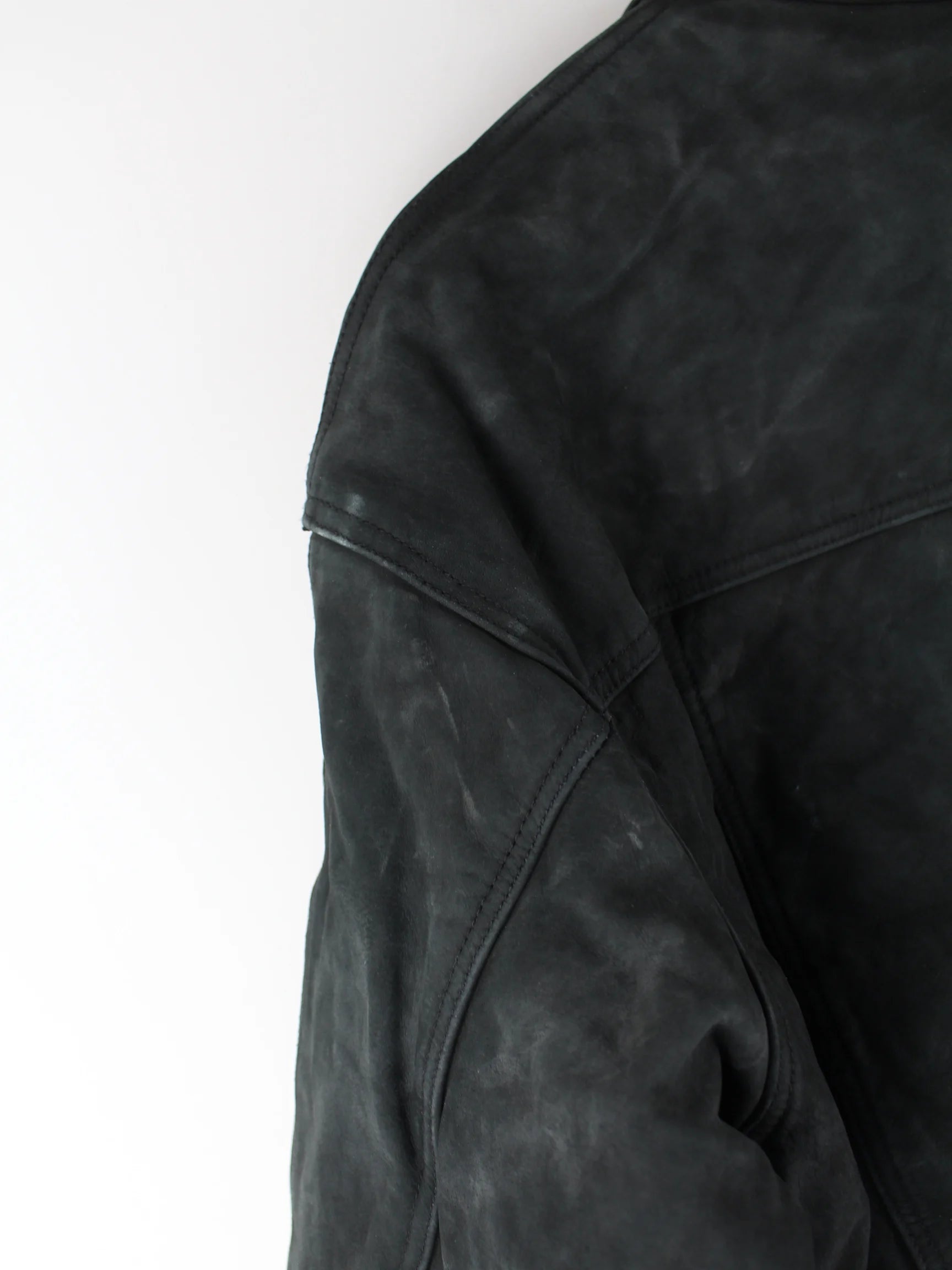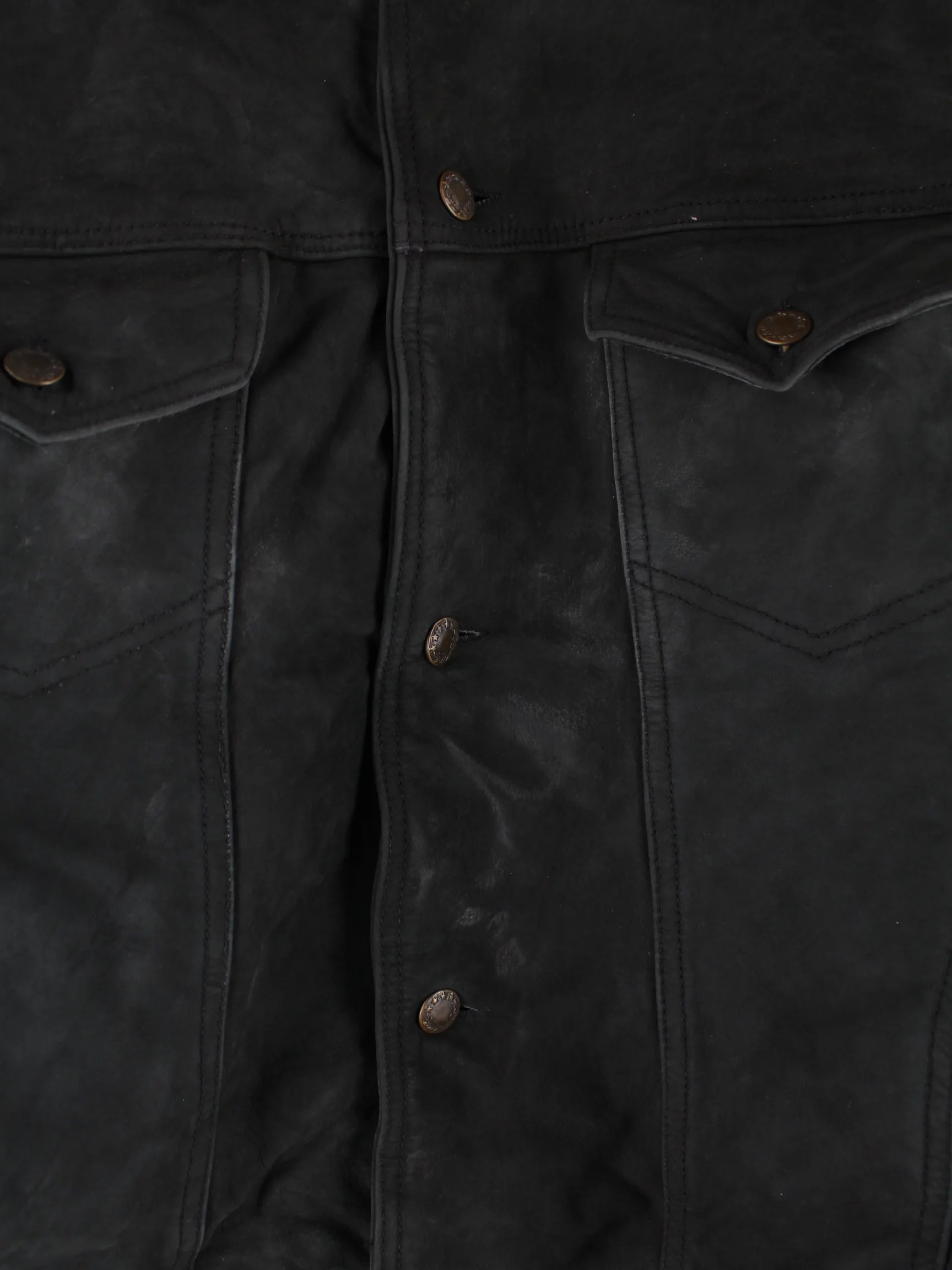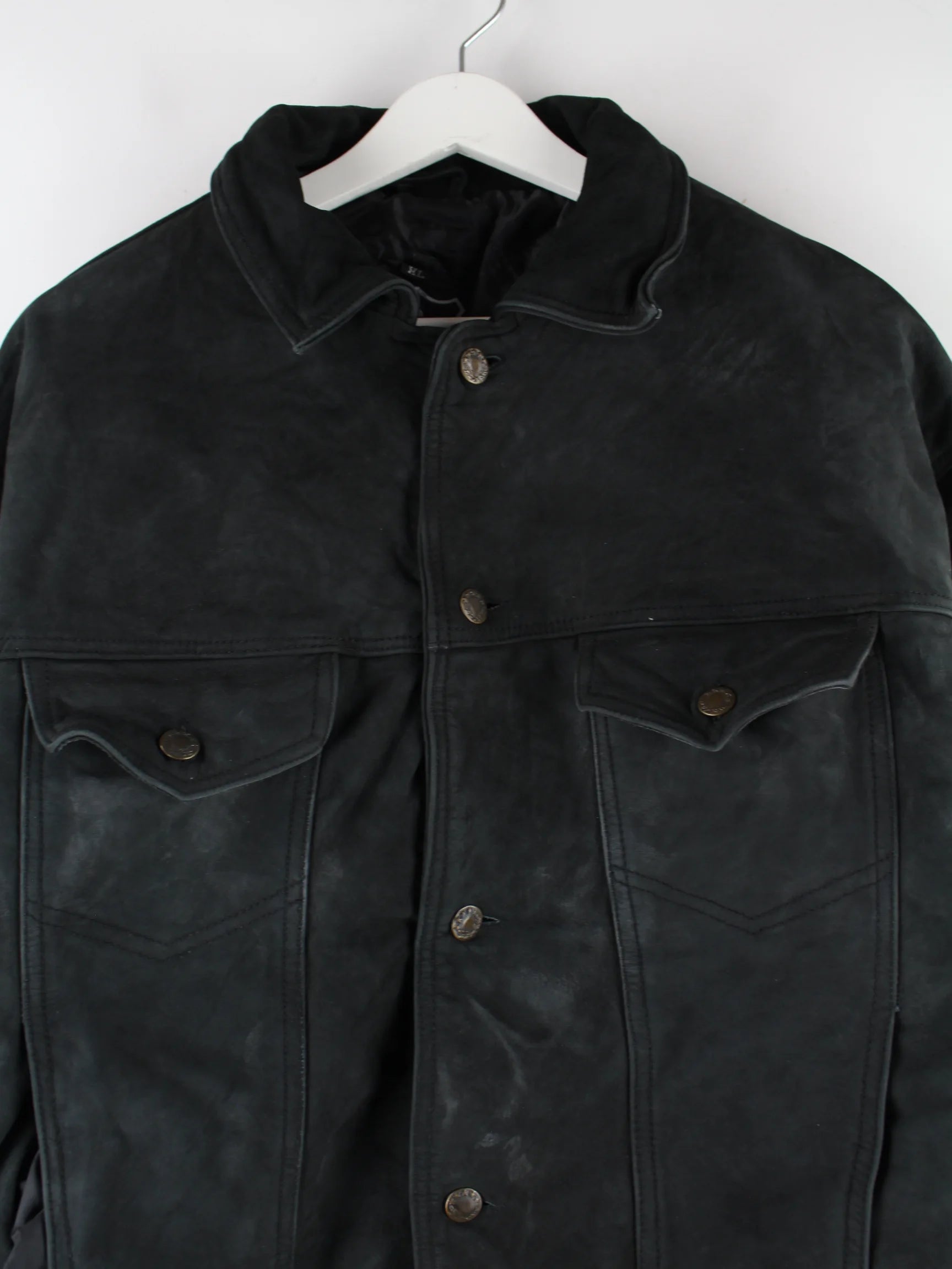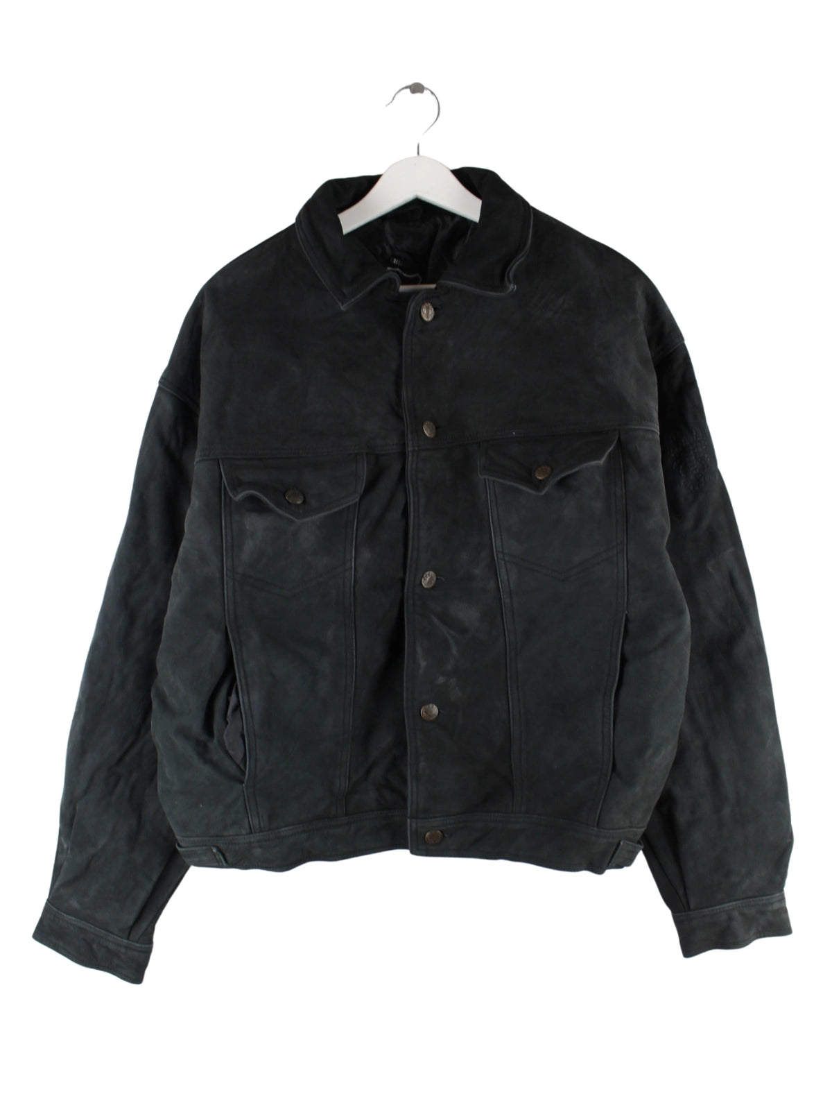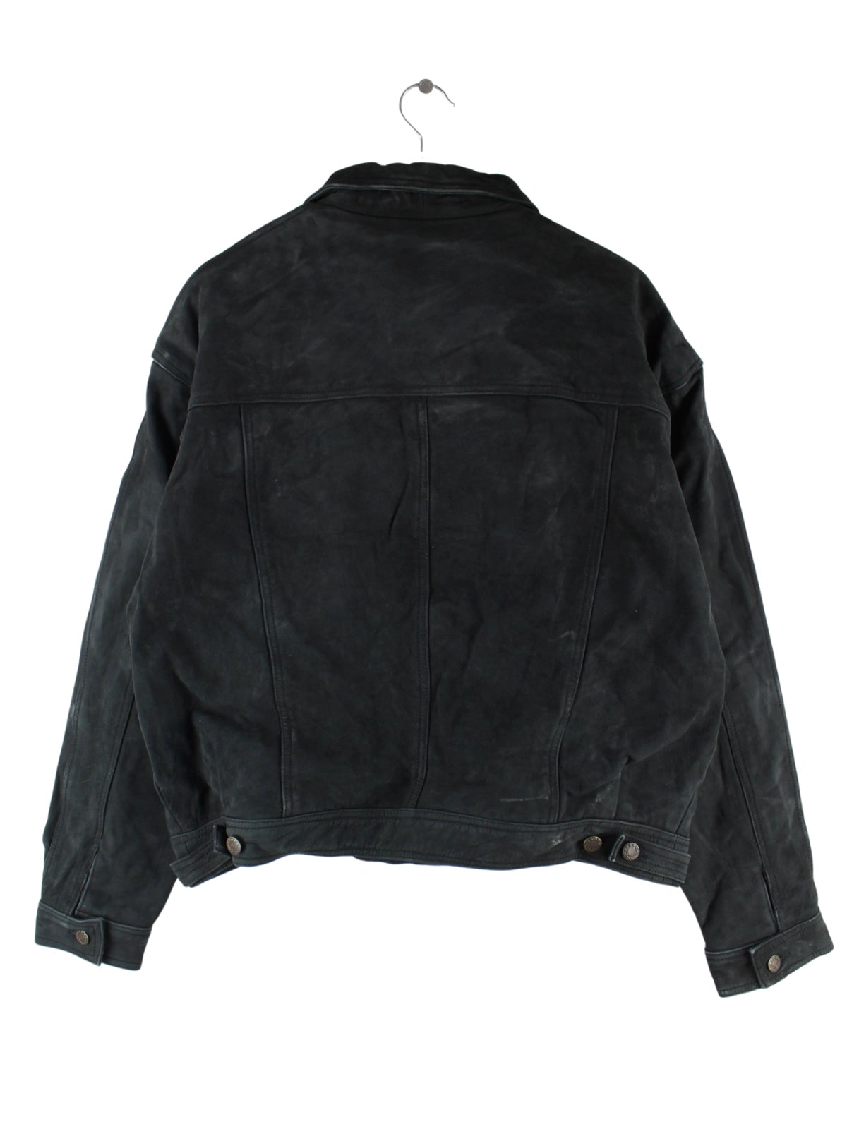 Schwarze Vintage Jacke aus den 90'ern in Größe L. Sie ist aus Leder hergestellt und in gutem Zustand zu haben.