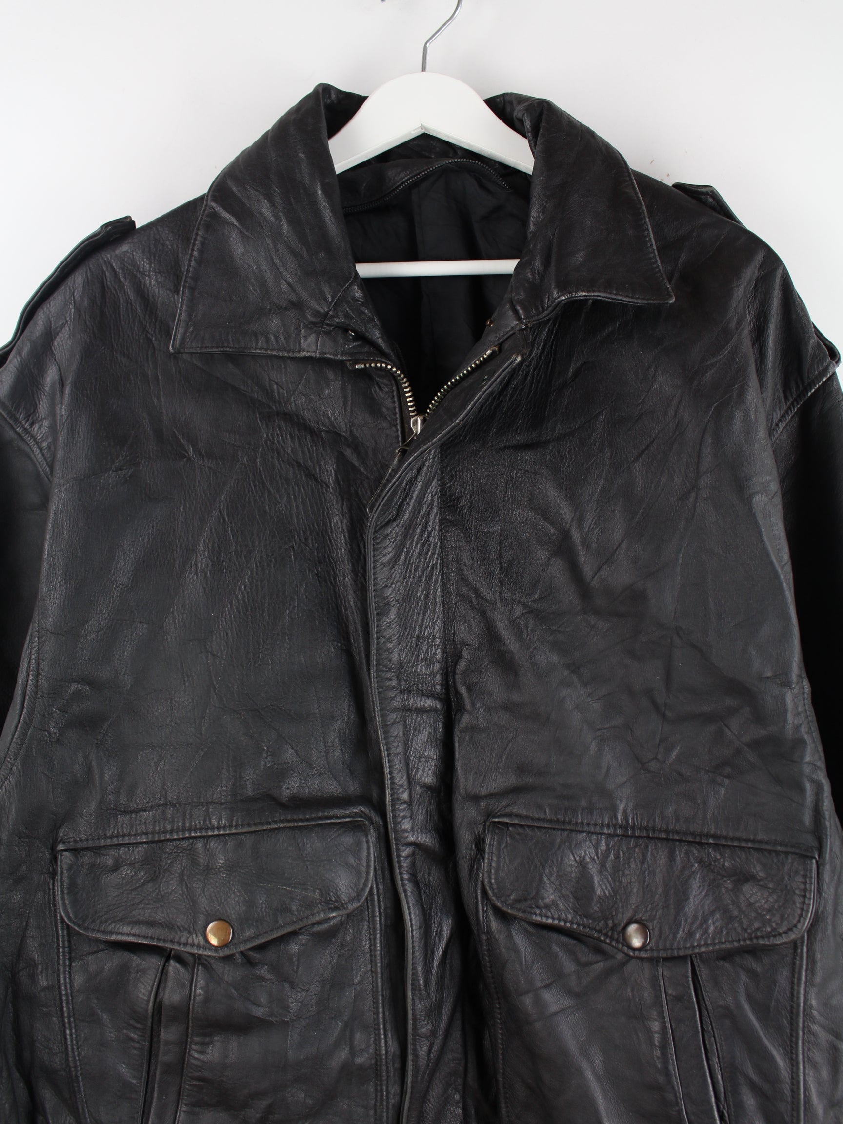 Vintage Jacke in Größe XL aus den 90'ern. Sie ist aus Leder gemacht und in Schwarz auf Lager.