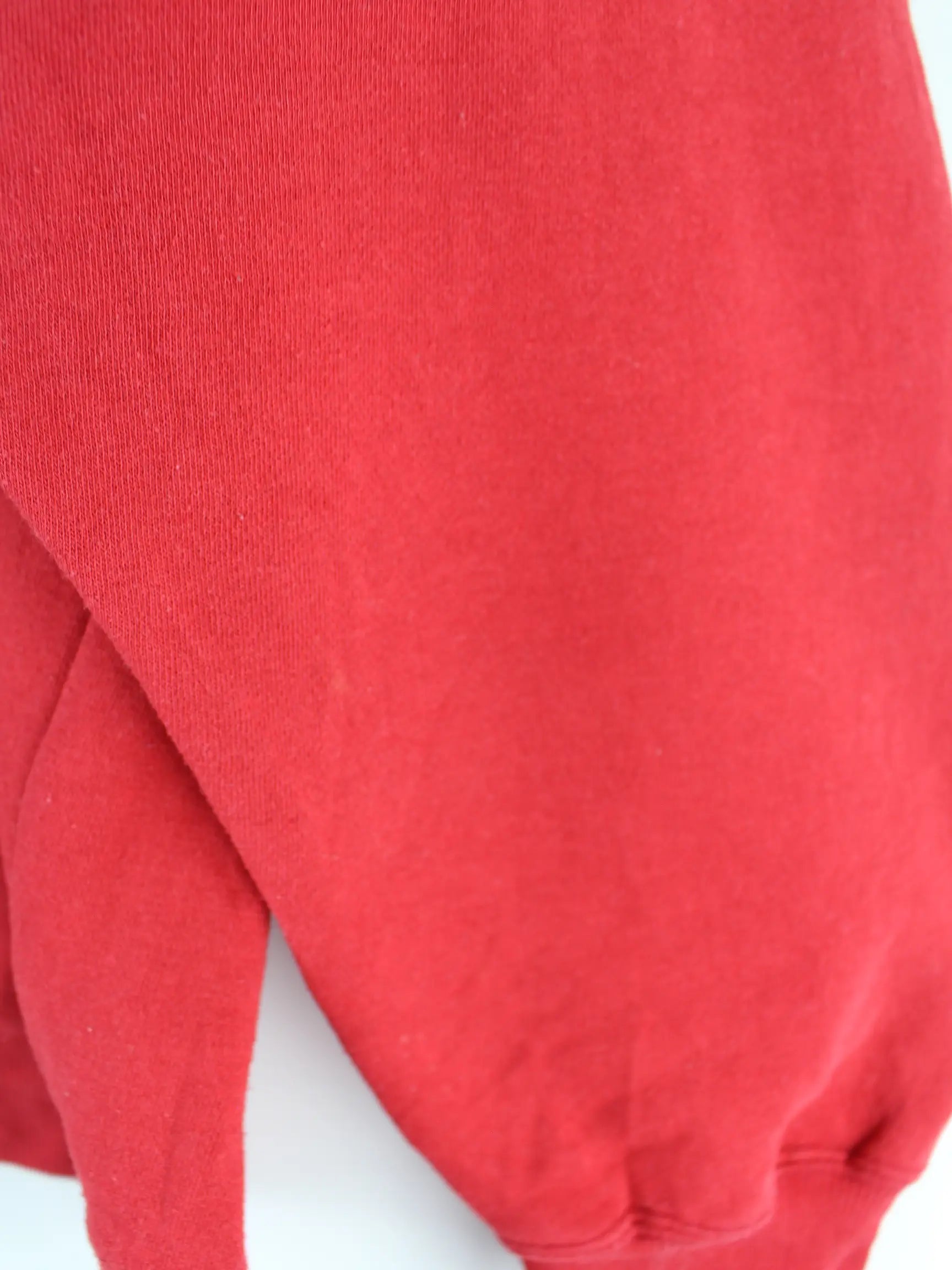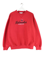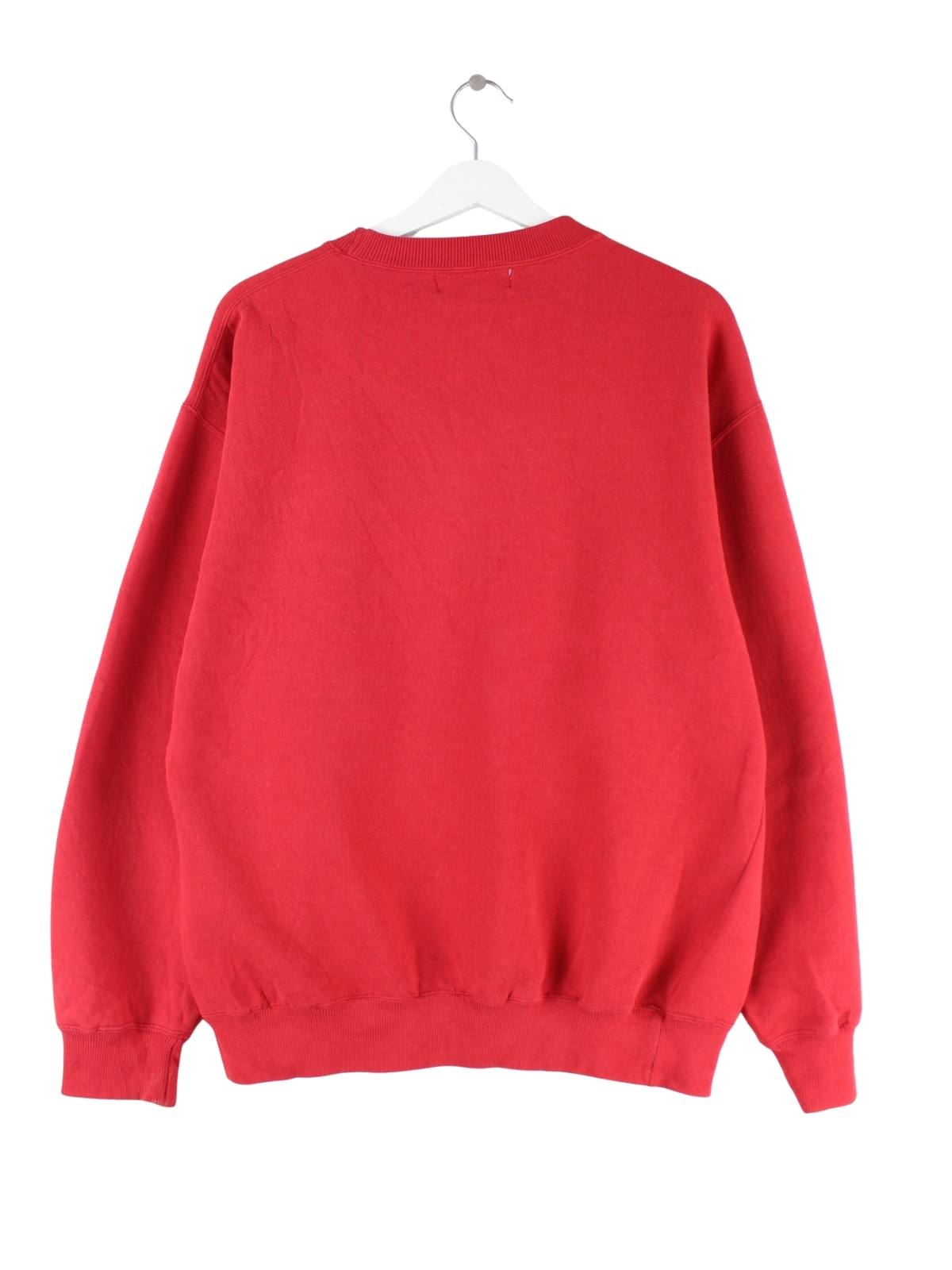 Roter Vintage Sweater mit Stickereien aus den 90'ern in Größe L. Er ist aus einer Baumwollmischung hergestellt. Den Zustand würden wir als 'In Ordnung' bezeichnen (vergl. Bilder).