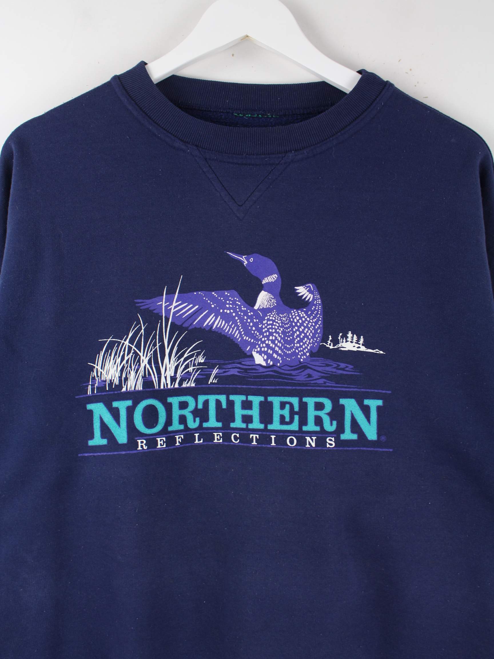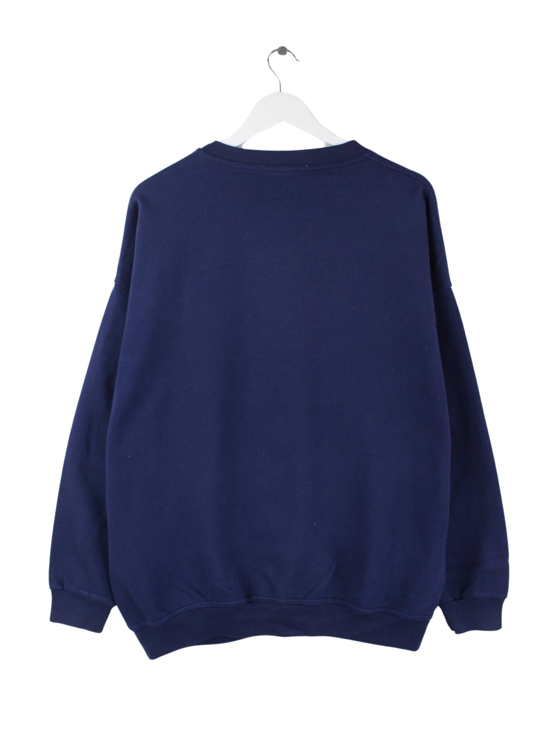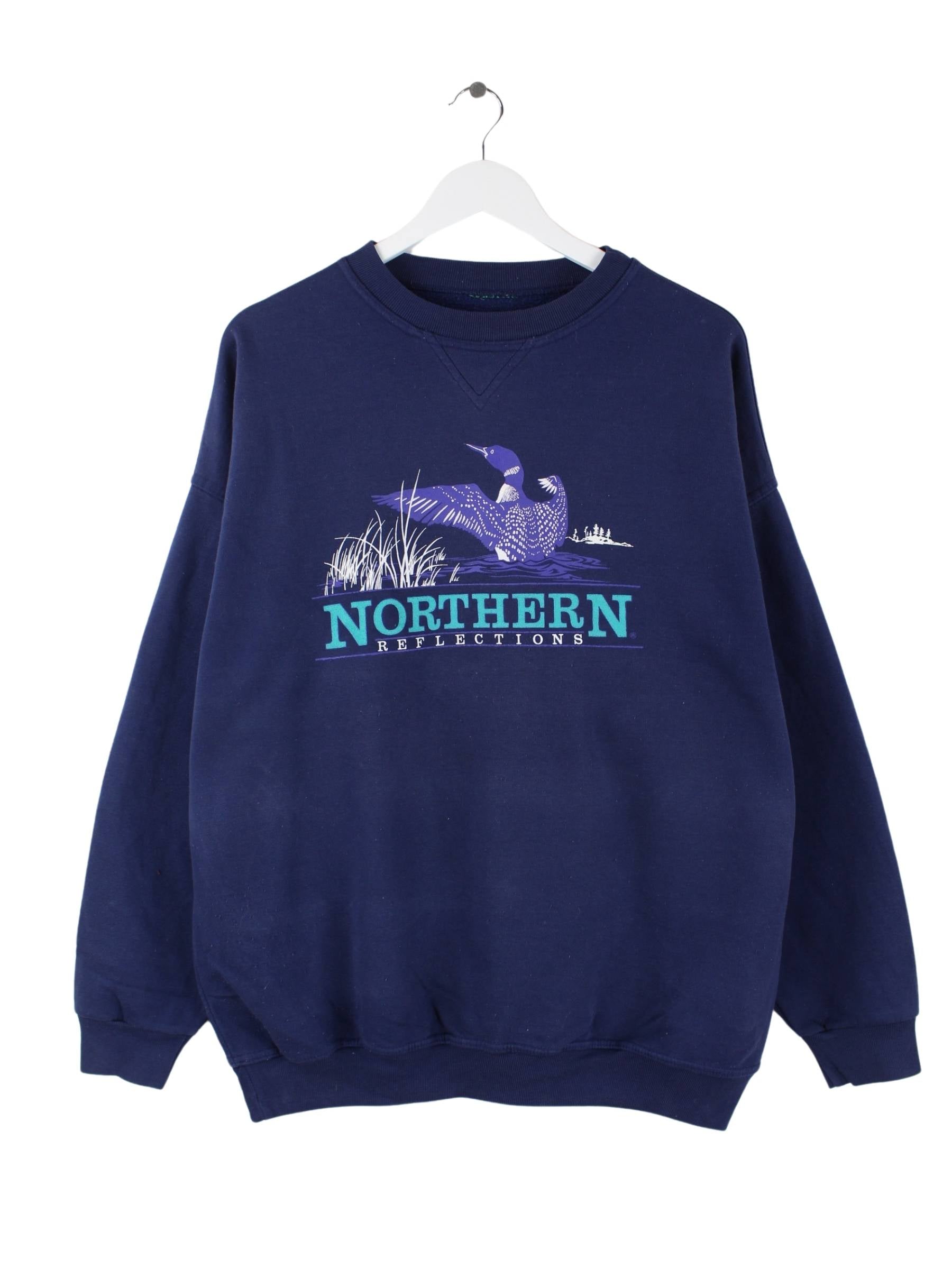 Blauer Vintage Sweater aus den 90'ern in Größe XL. Er ist aus einer Baumwollmischung angefertigt und in sehr gutem Zustand im Angebot. Mit tollem Northern Print.