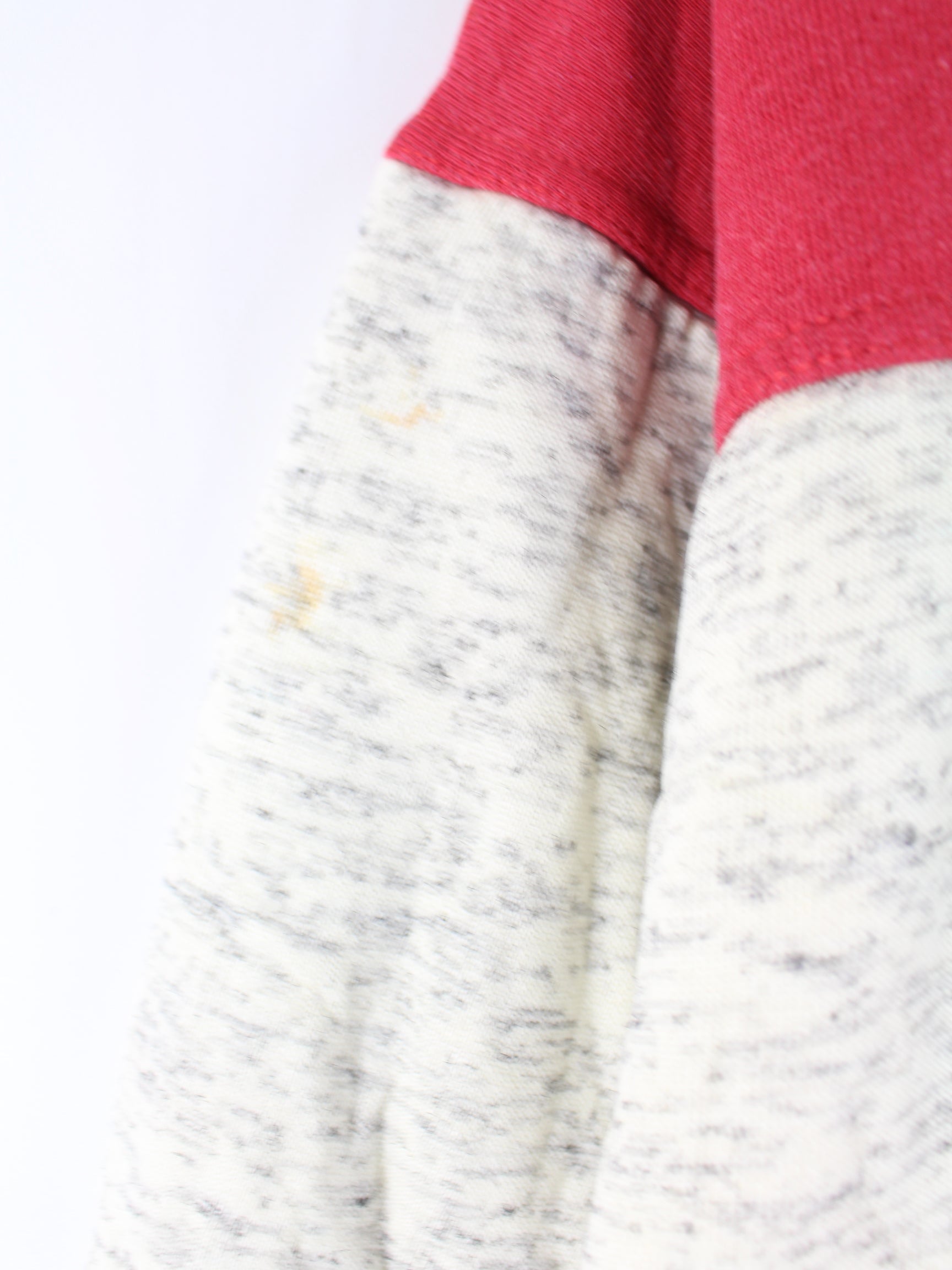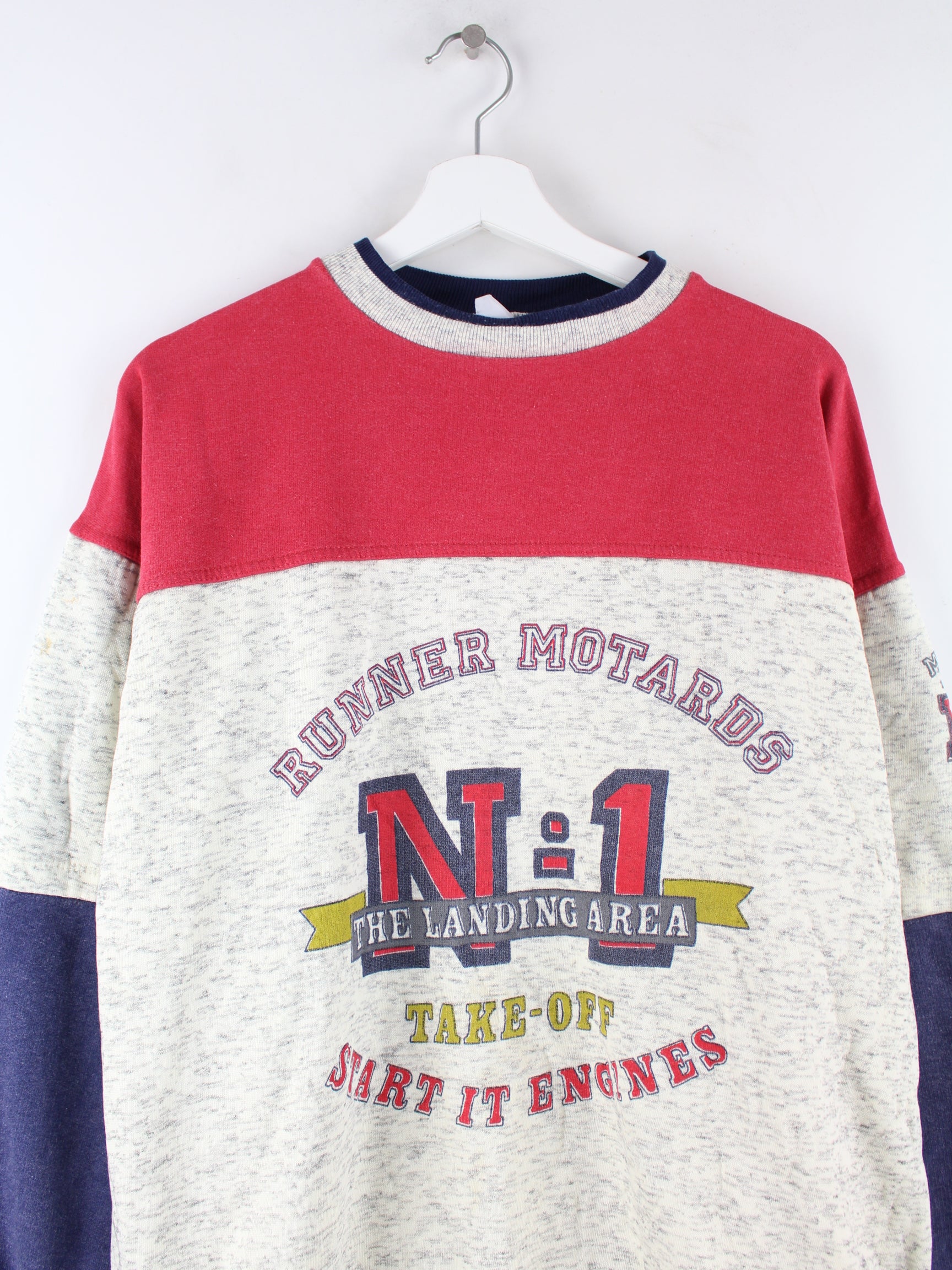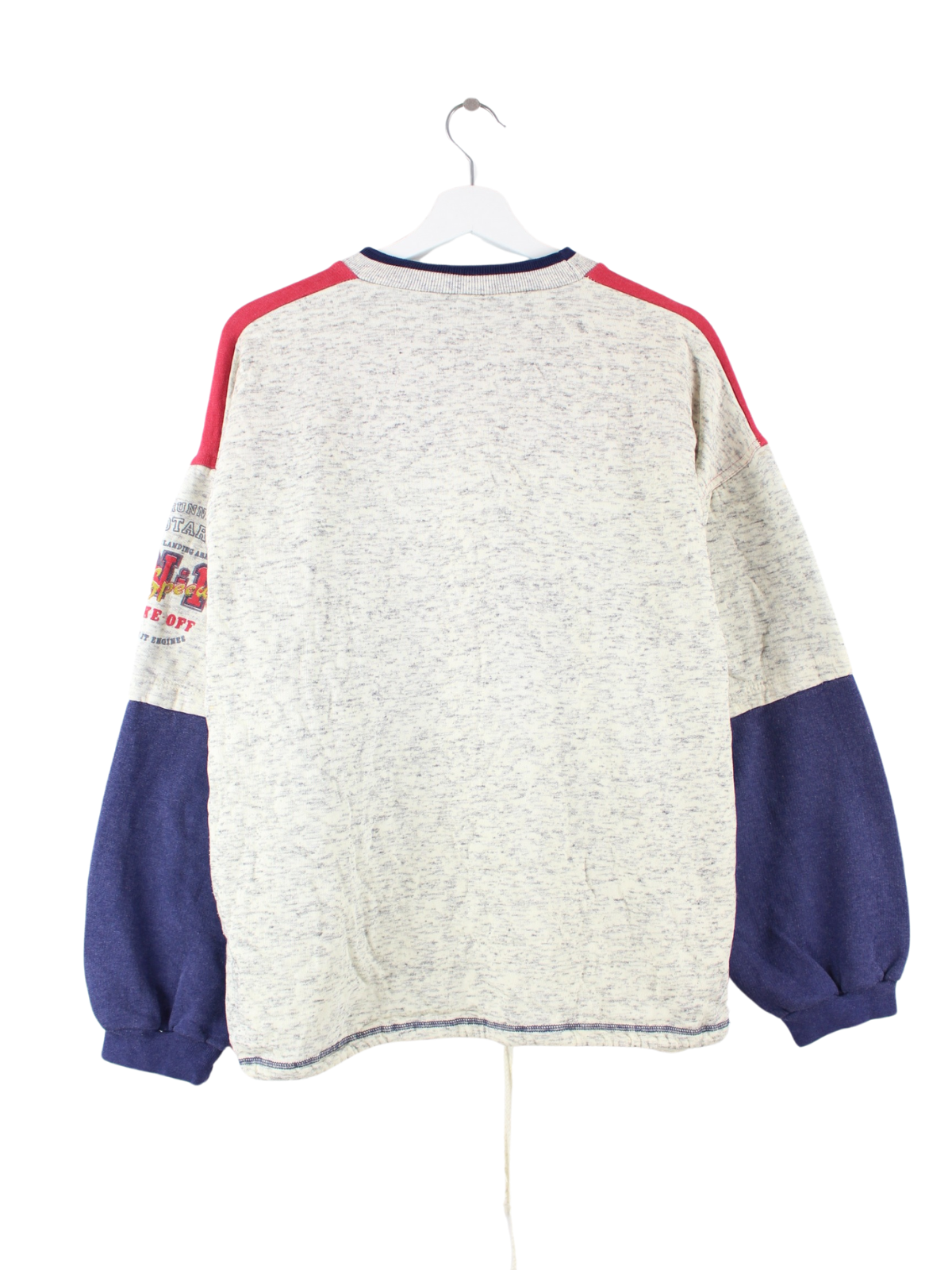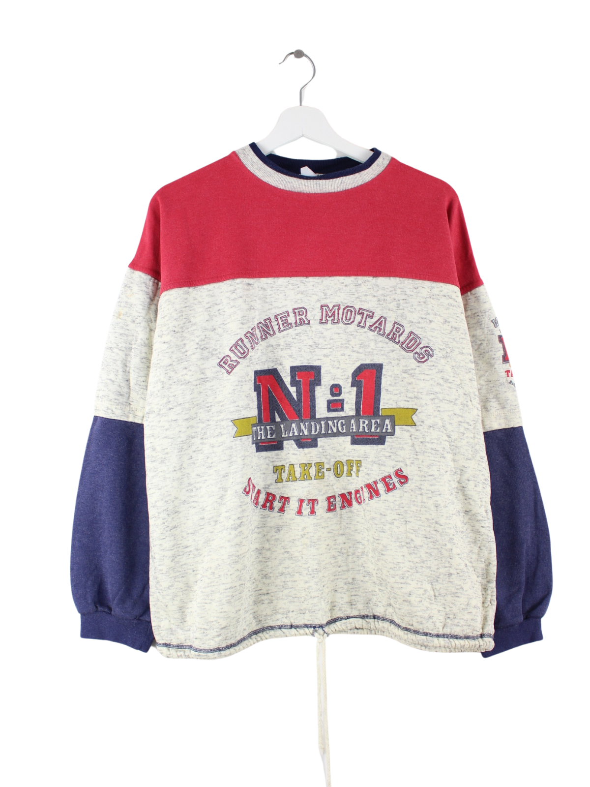 Vintage sweater in size L from the 80's. It is made from a cotton blend and is available in beige. With a beautiful 80's print.