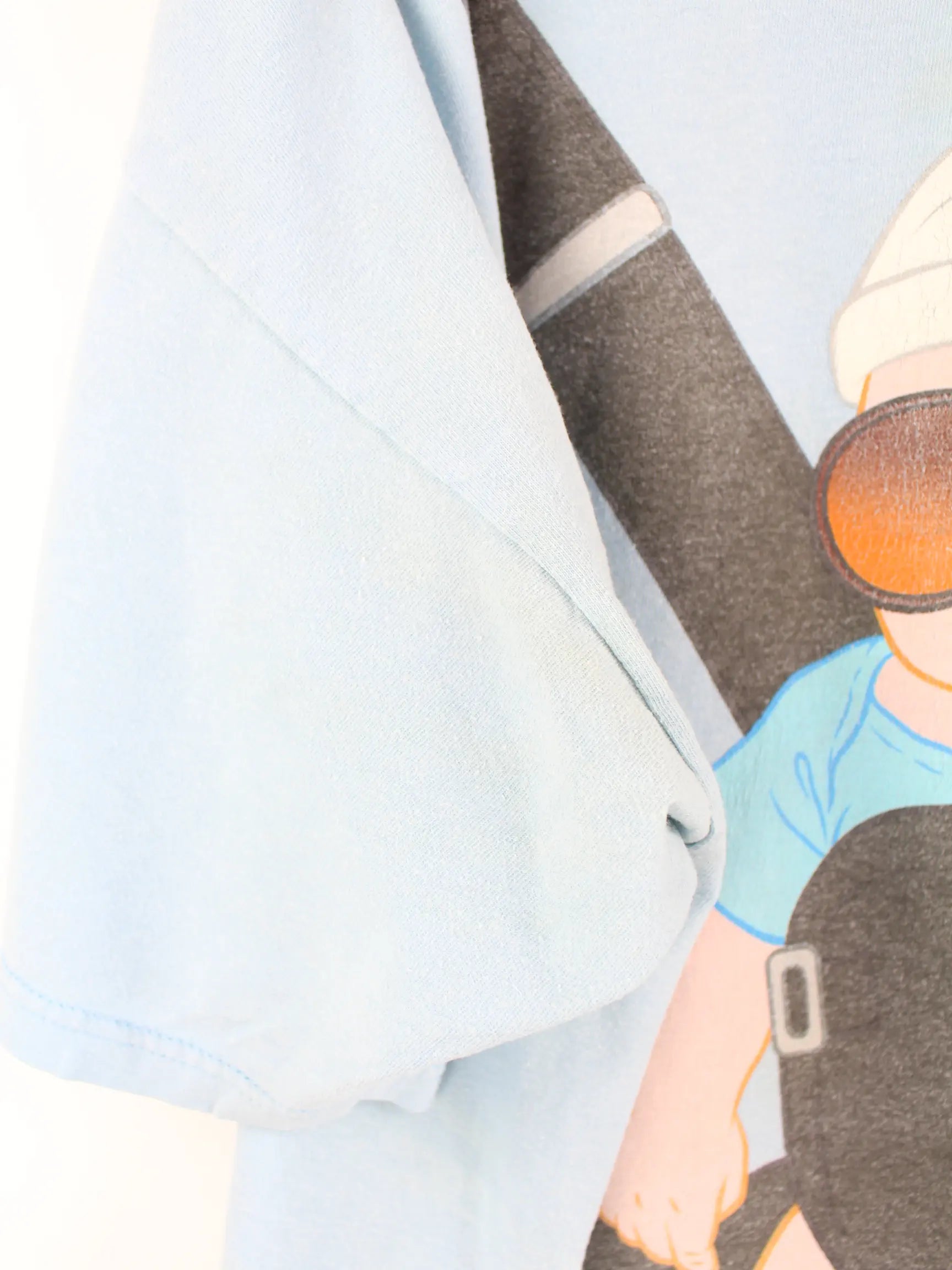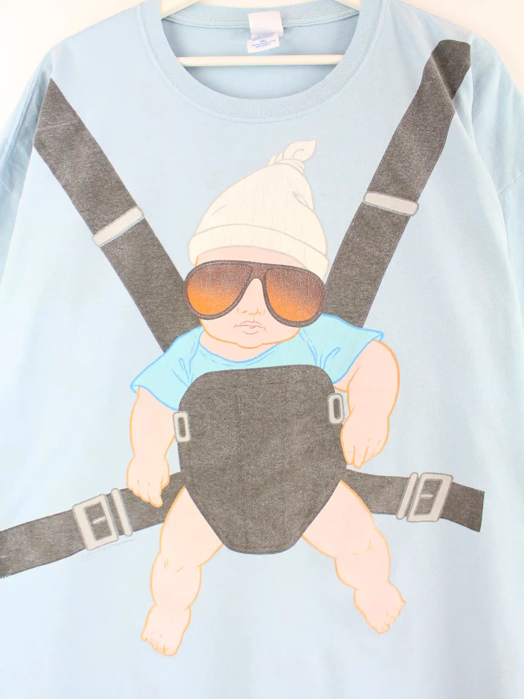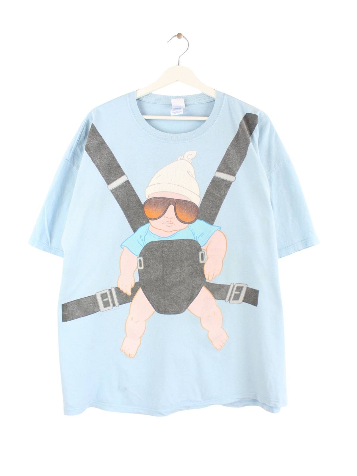Blaues Vintage T-Shirt in Größe XXL. Es ist aus Baumwolle gemacht. Den Zustand würden wir als 'In Ordnung' bezeichnen (vergl. Bilder).Mit schönem Baby Print.