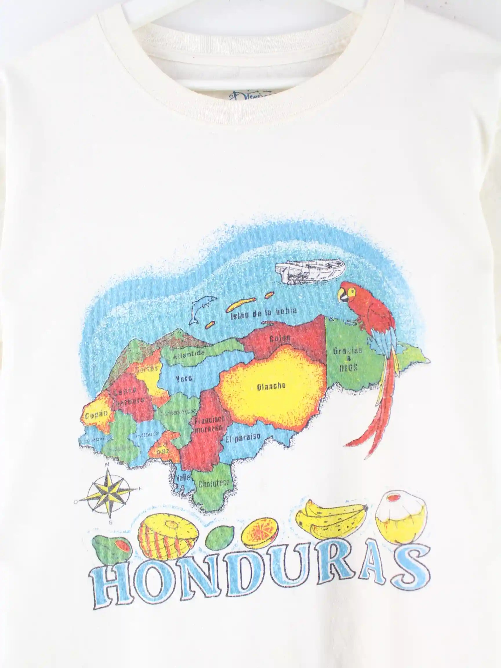 Vintage T-Shirt in Größe M. Es ist aus einer Baumwollmischung produziert und in Weiß im Angebot. Mit seltenem Honduras Print.