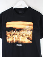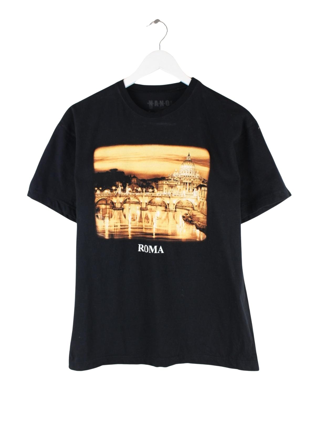 Vintage T-Shirt in Größe S. Es ist aus Baumwolle gefertigt und in Schwarz im Bestand. Mit schickem Roma Print.