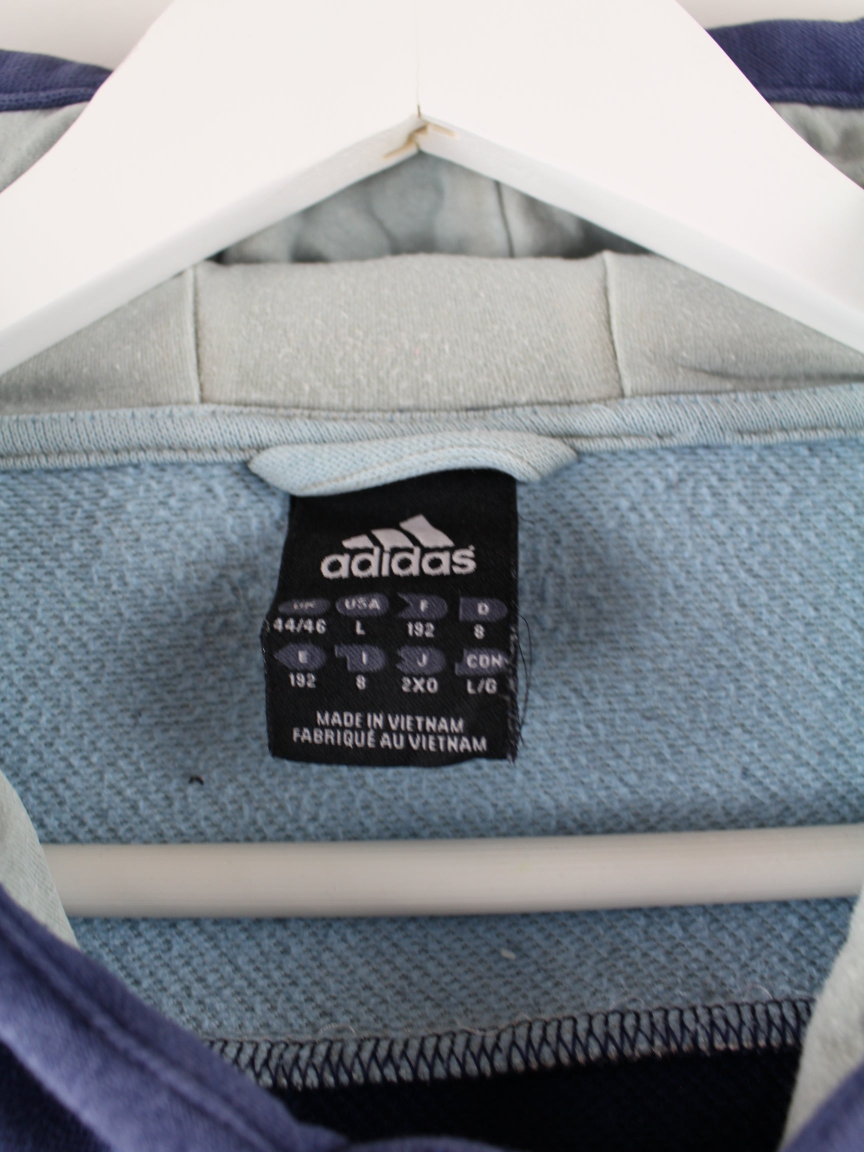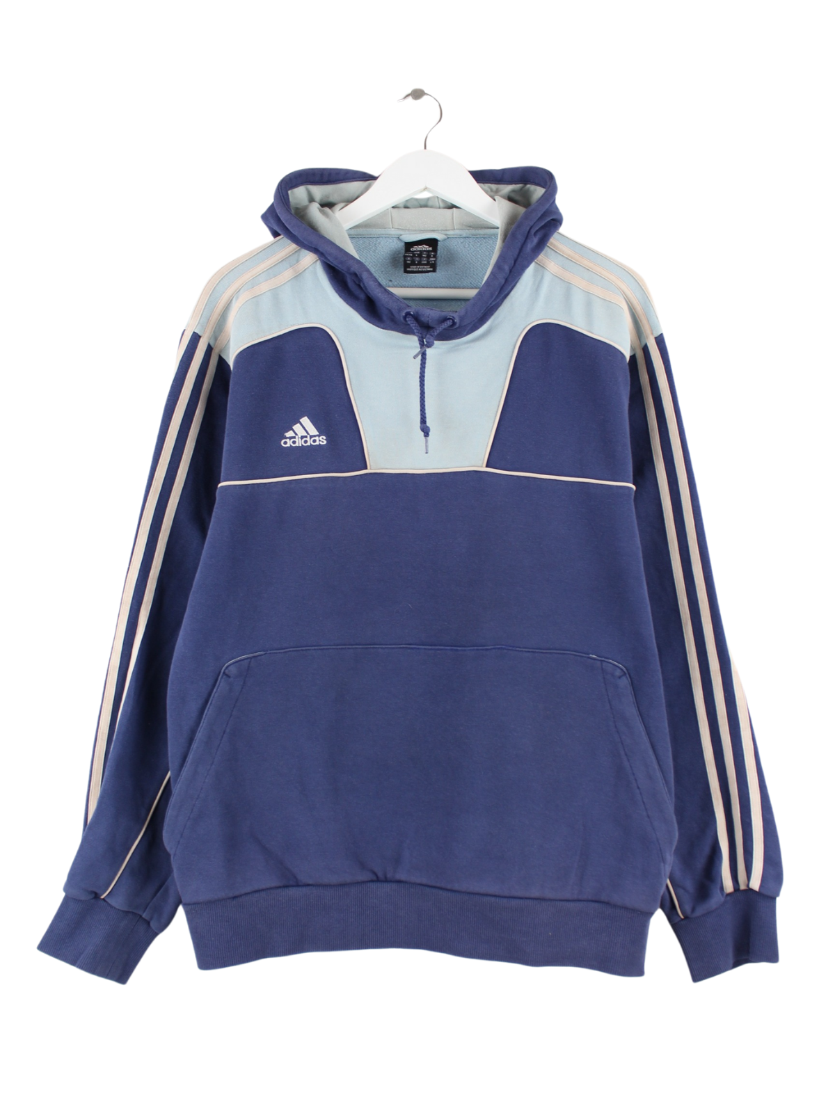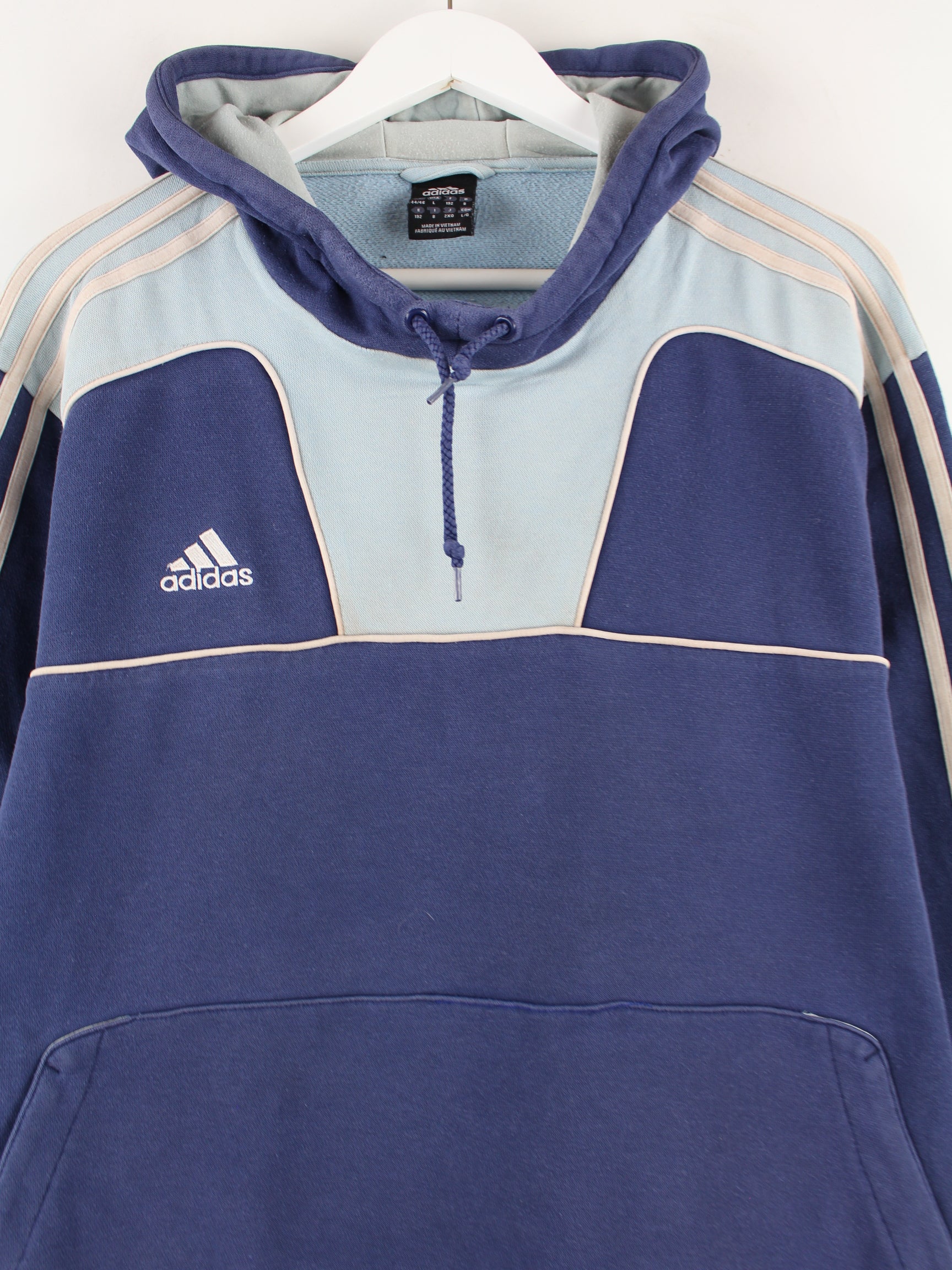 Hoodie from the label Adidas in size L. It is made of a cotton blend and is in stock in blue.