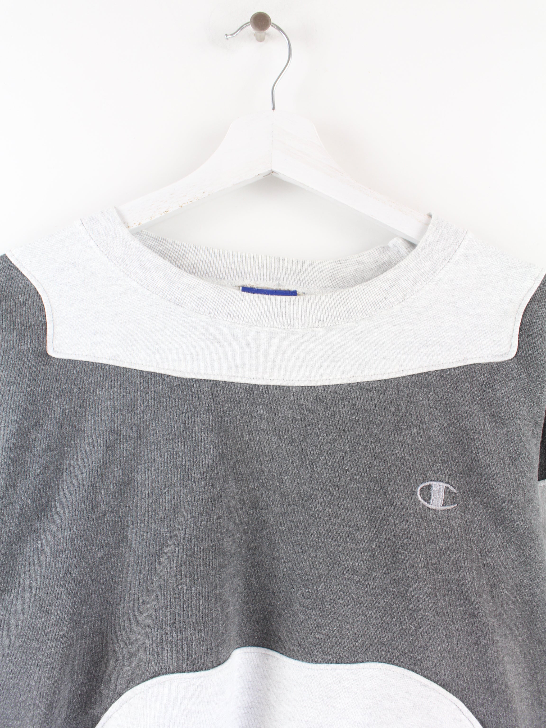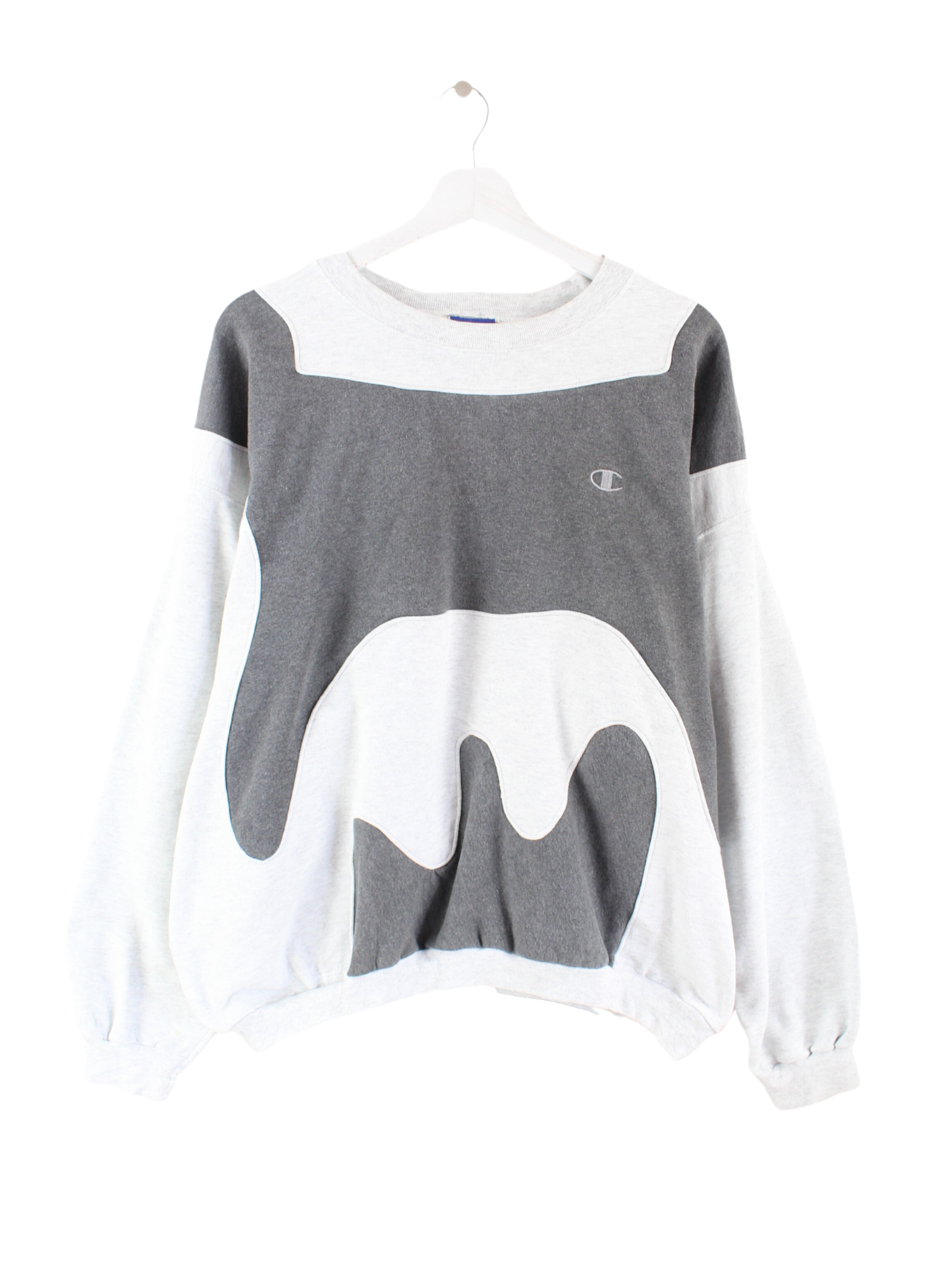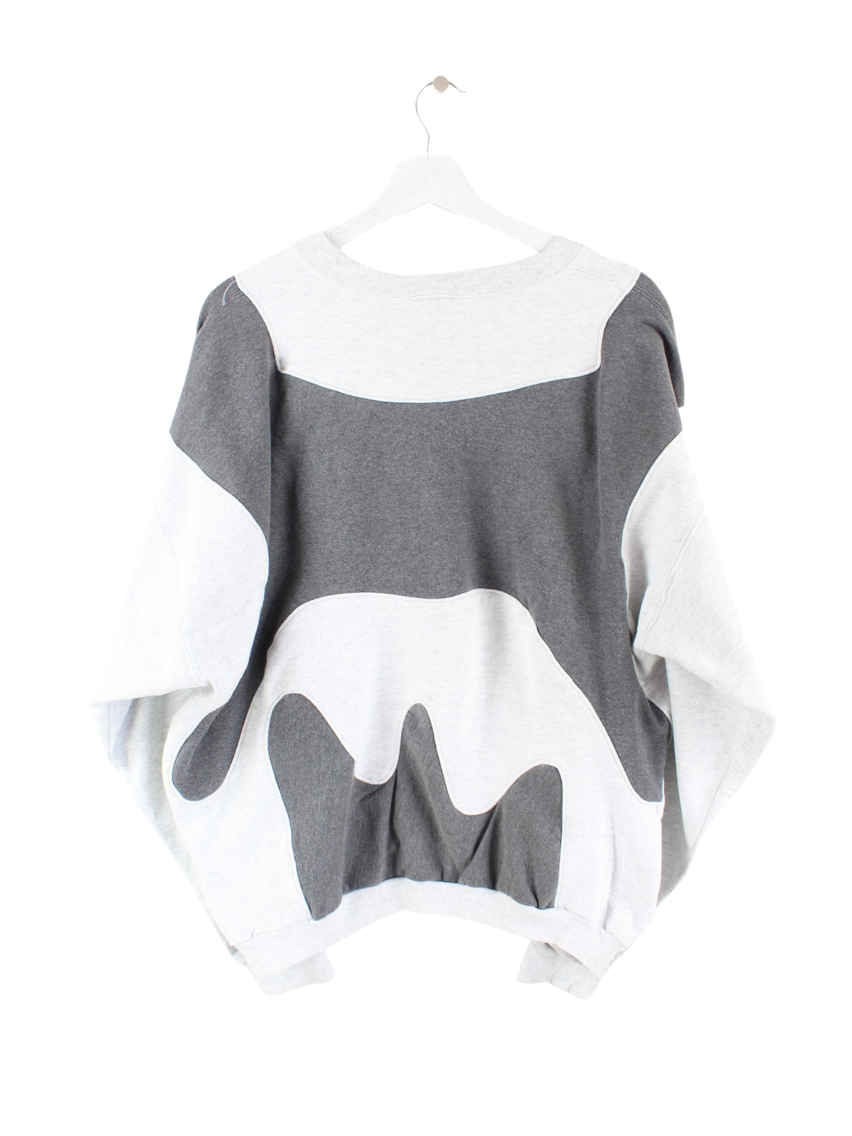 Gray rework sweater made from two old ones sewn together champion sweaters.