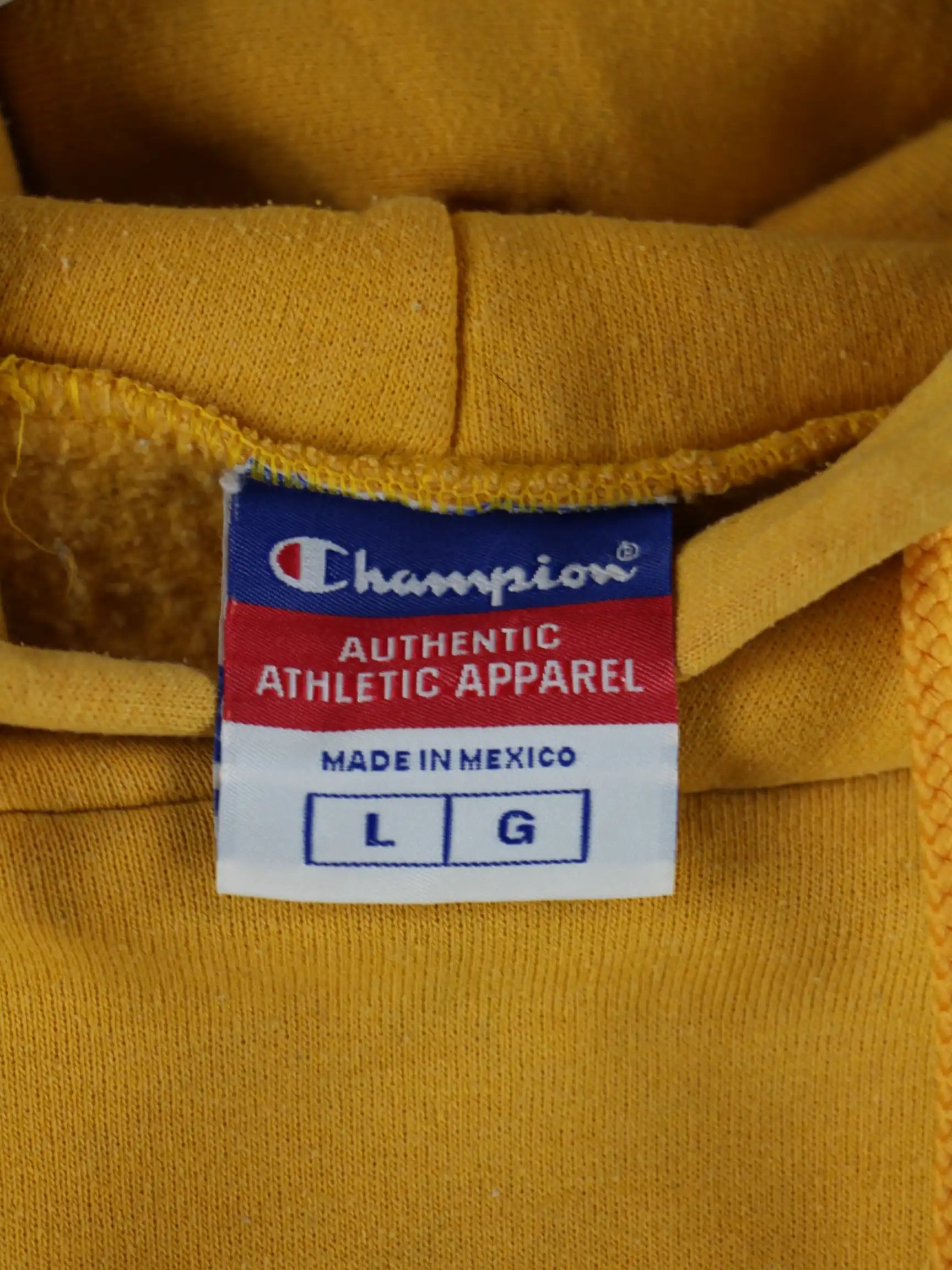 Hoodie des Labels Champion in Größe L. Er ist aus einer Baumwollmischung und in Gelb zu haben. Mit tollem Hawkeyes Print.