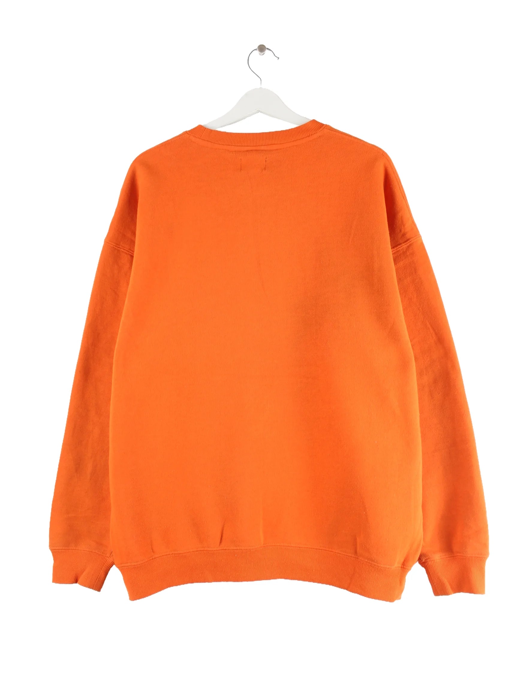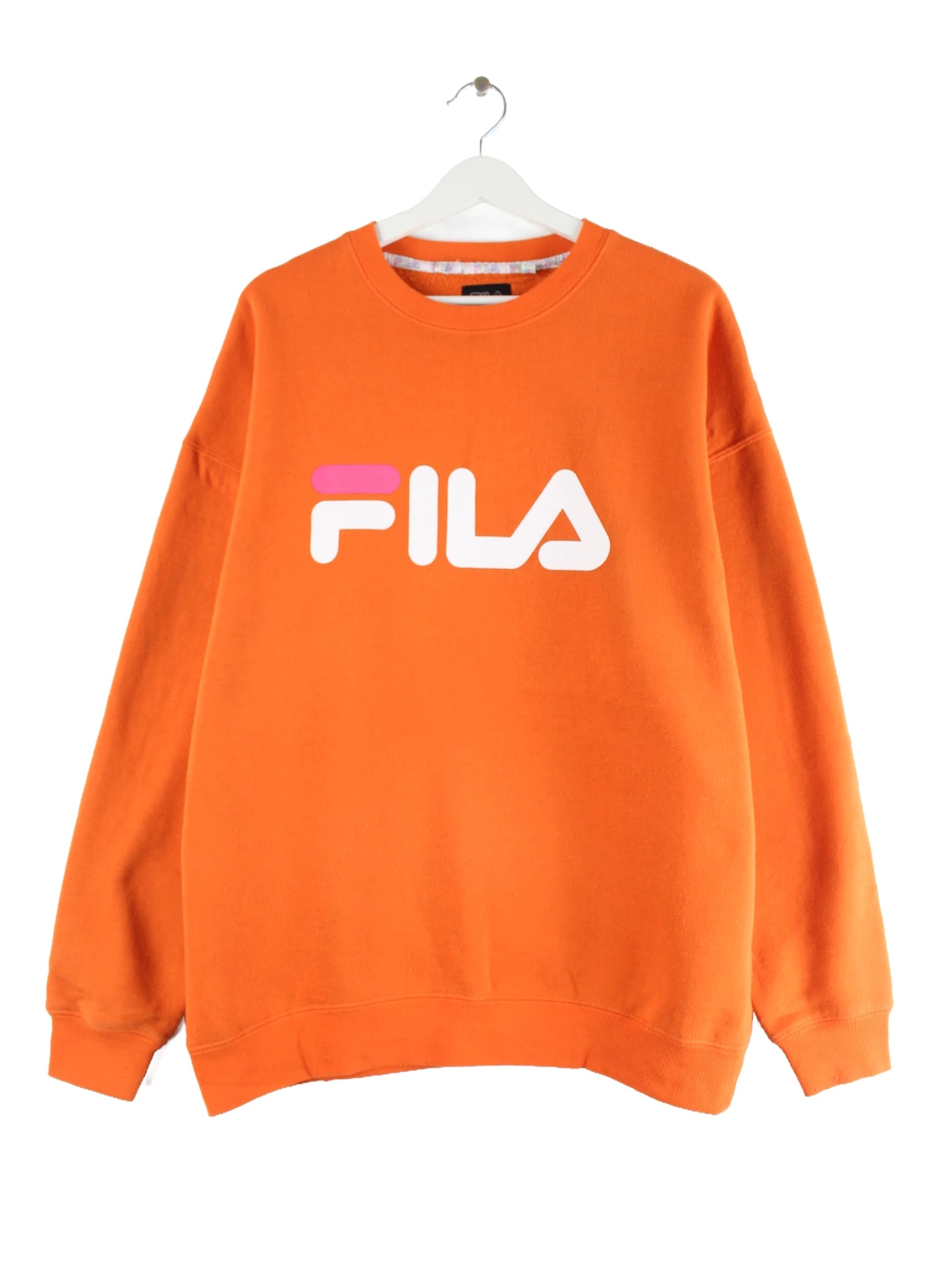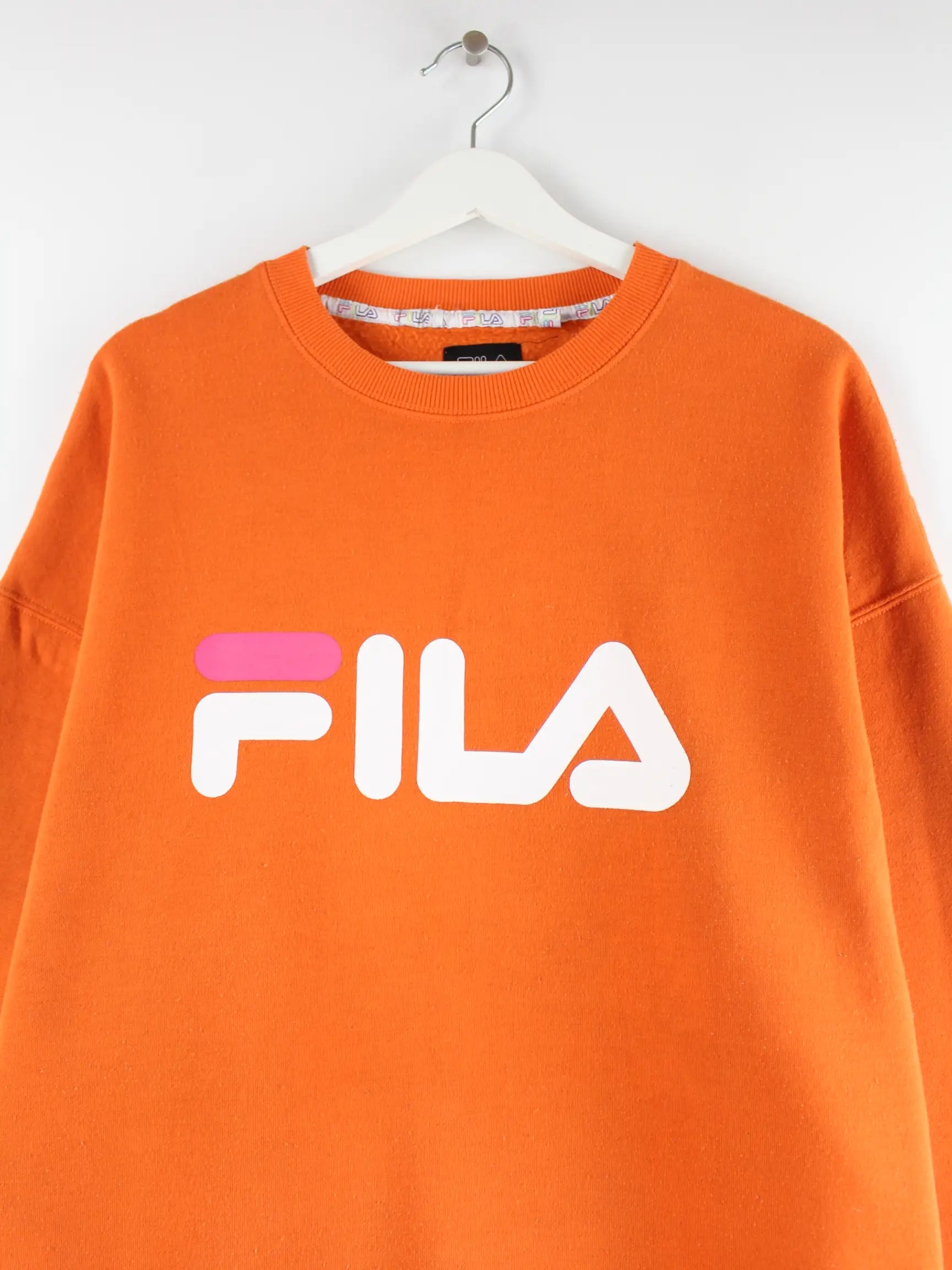 Orangefarbener Sweater des Labels Fila in Größe M. Er ist aus einer Baumwollmischung angefertigt. Den Zustand würden wir als 'In Ordnung' bezeichnen (vergl. Bilder).Mit chiquem Logo Print.