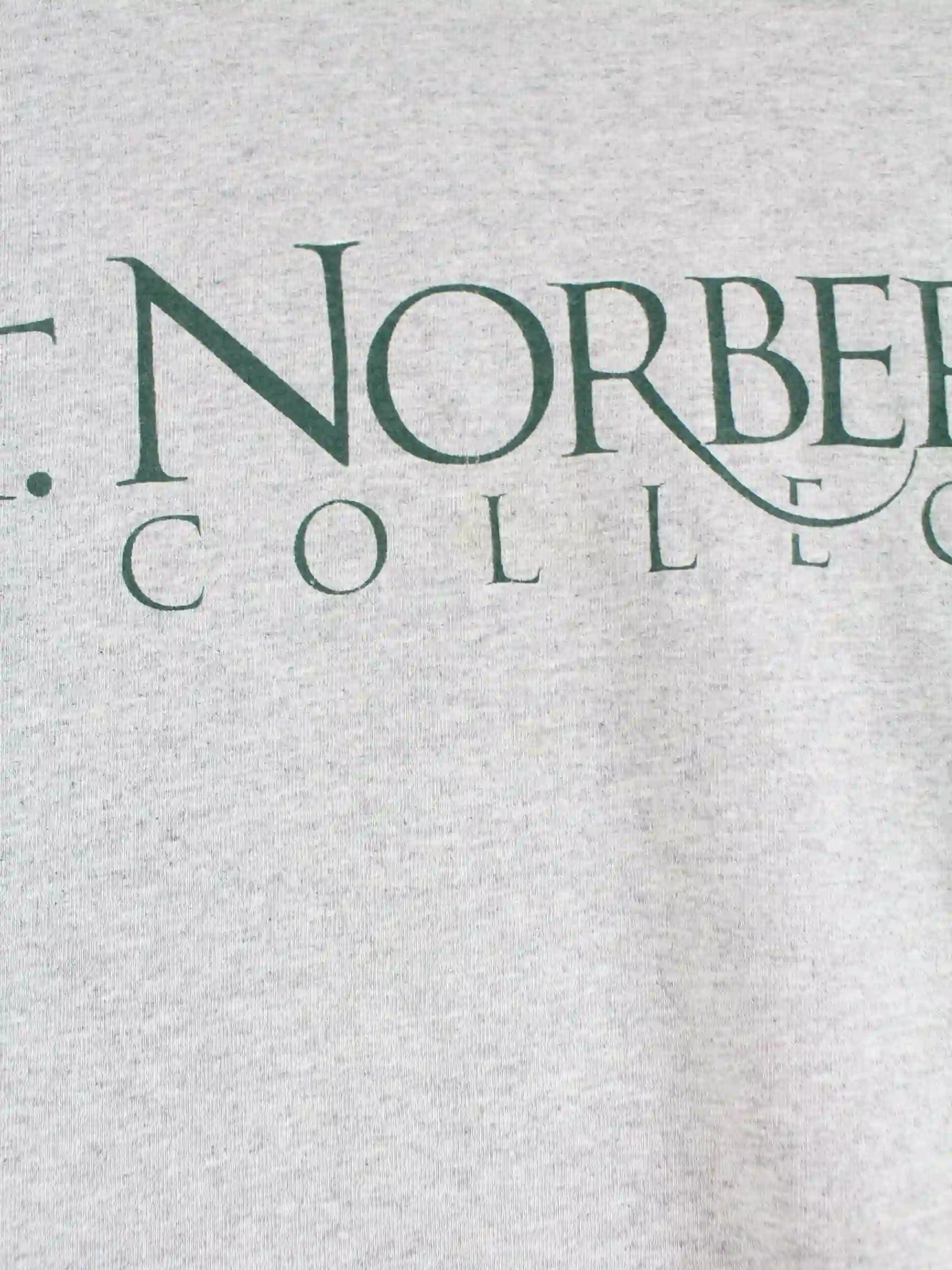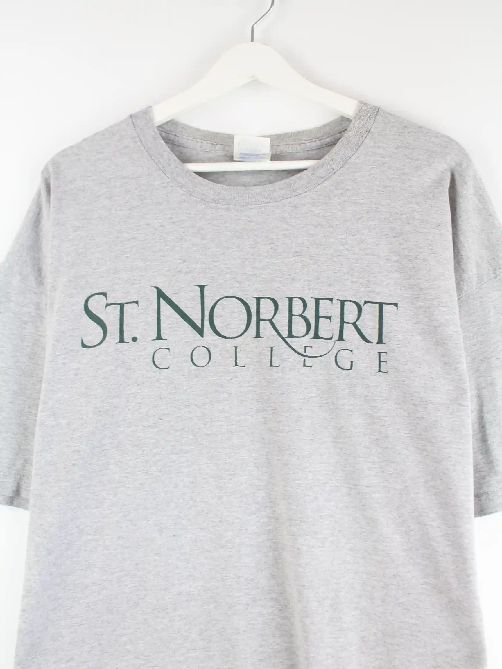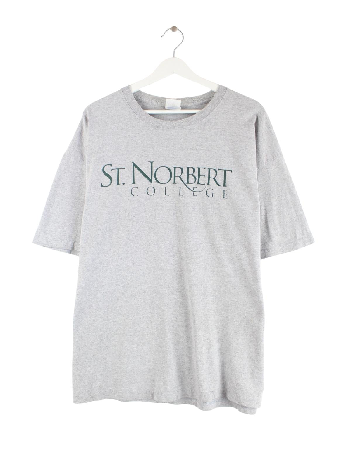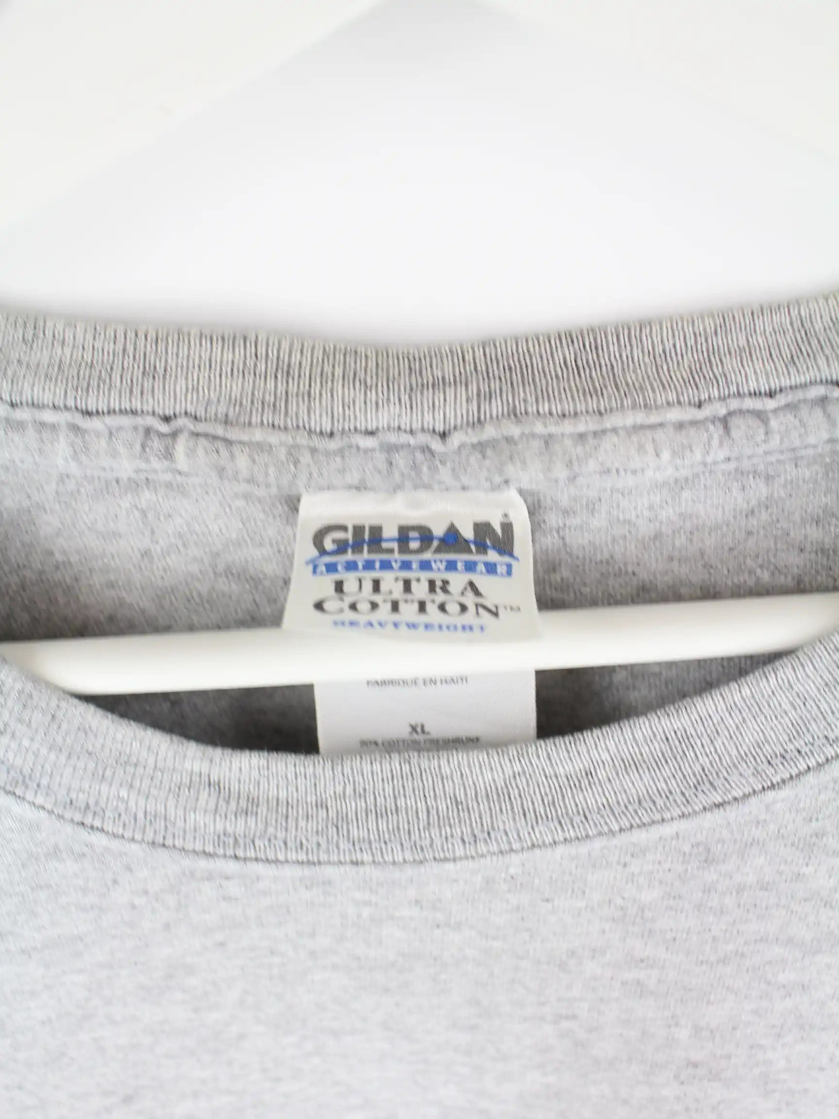 Graues T-Shirt von Gildan in Größe XL. Es ist aus Baumwolle gemacht und in gutem Zustand lieferbar. Mit schickem College Print.